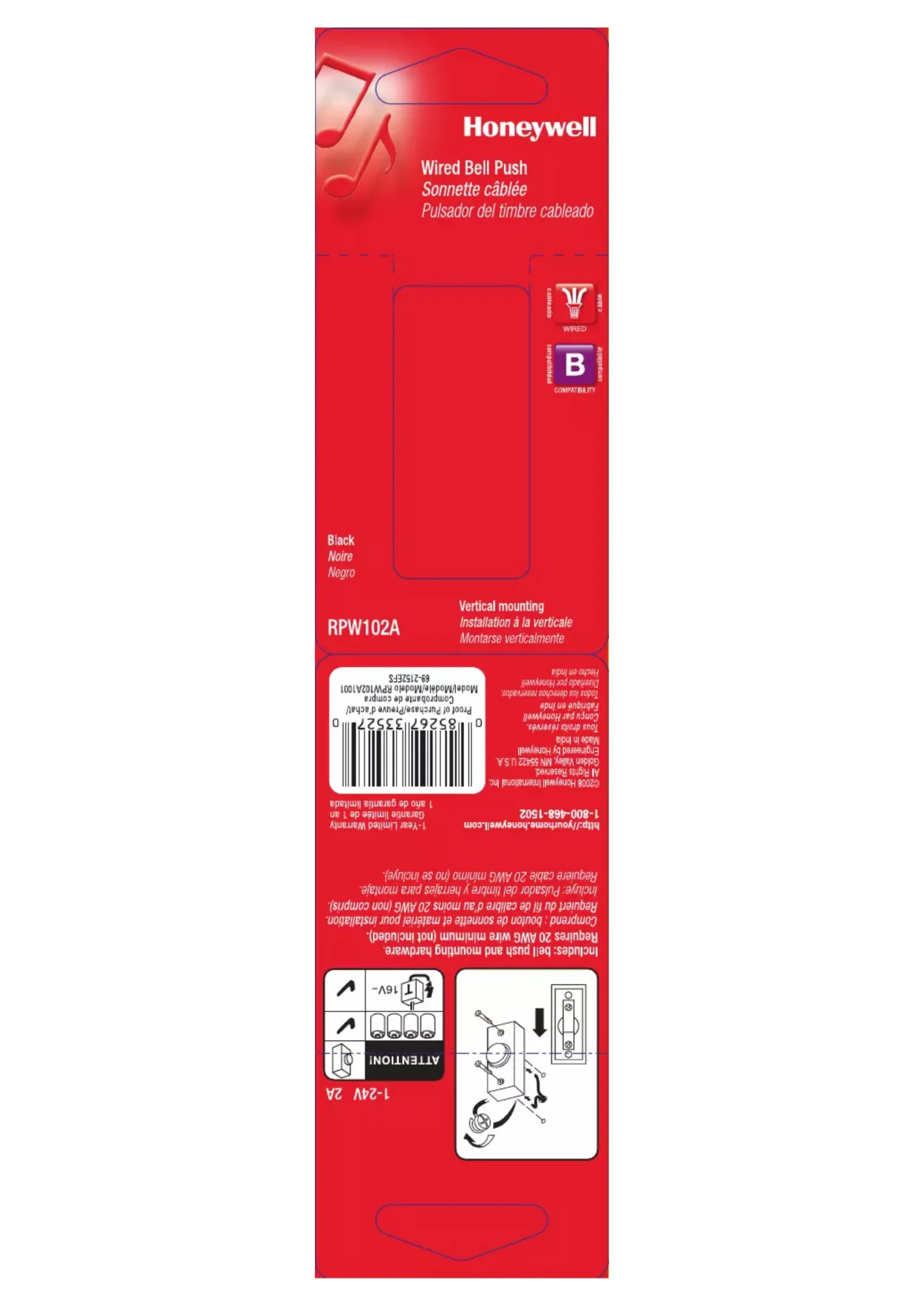 | Caractéristiques techniques | Modèle : HONEYWELL RPW102A, Type : Sonnette de porte, Alimentation : Pile, Connectivité : Sans fil |
