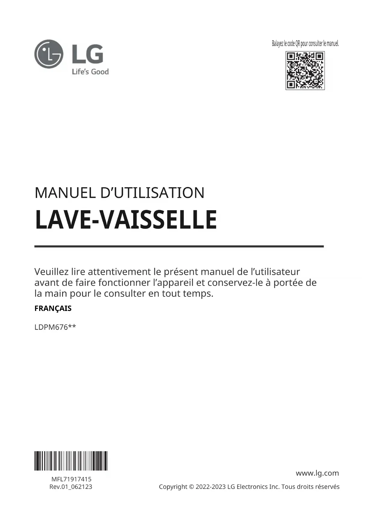 LAVE-VAISSELLE Veuillez lire attentivement le présent manuel de lʼutilisateur avant de faire fonctionner lʼappareil et conservez-le à portée de la main pour le consulter en tout temps. FRANÇAIS LDPM676** MFL71917415Rev.01_062123 www.lg.com Copyright © 2022-2023 LG Electronics Inc. Tous droits réservés Balayez le code QR pour consulter le manuel.TABLE DES MATIÈRES