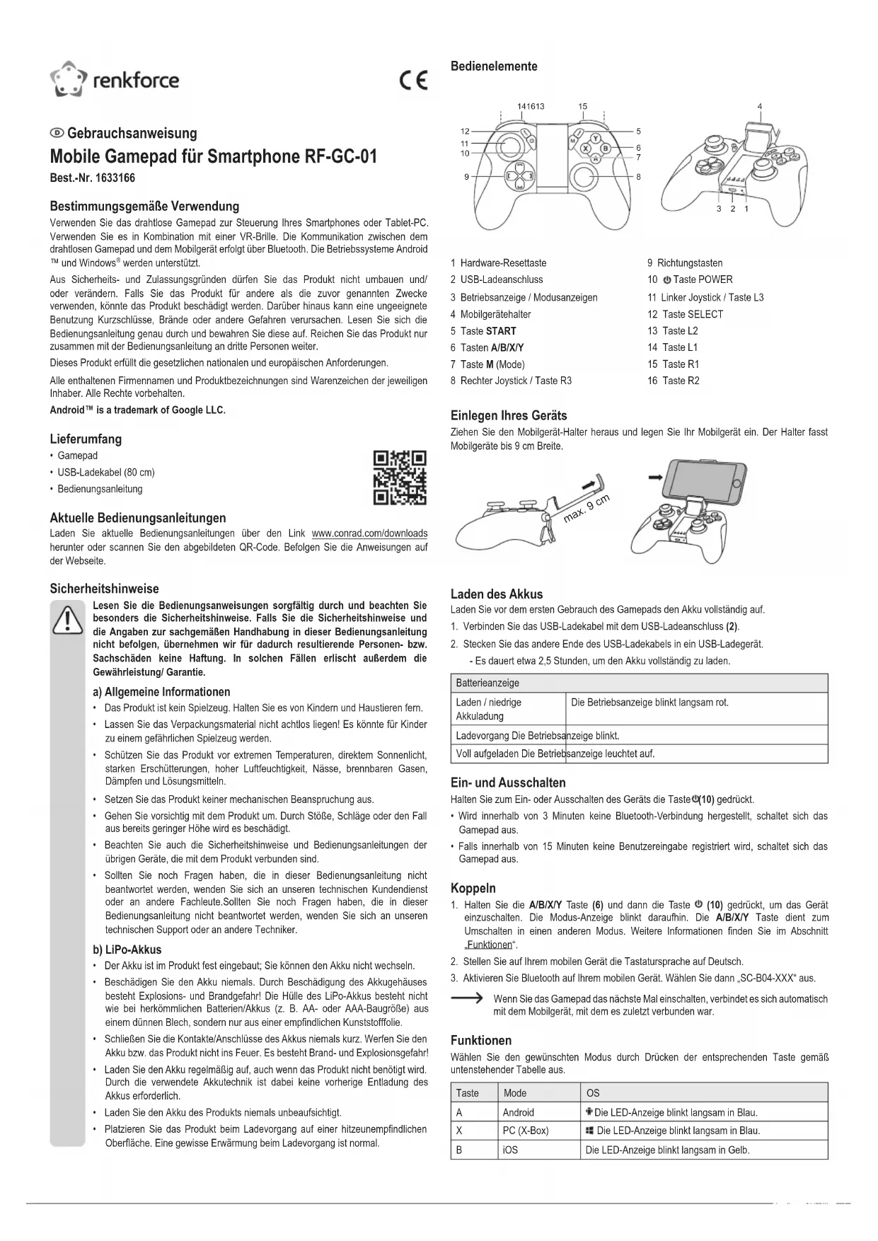 La prochaine fois que vous allumerez votre manette de jeu, celle-ci sera automatiquement appairée avec le dernier appareil mobile avec lequel elle était appairée. Mode d’emploi RF-GC-01 Manette de jeu portable pour smartphone Nº de commande : 1633166 Utilisation prévue Utilisez la manette de jeu sans l pour commander votre smartphone ou votre tablette. Utilisez- la en combinaison avec des lunettes VR. La manette de jeu sans l et l’appareil portable communiquent entre eux via Bluetooth. Compatible avec les systèmes d’exploitation Android™ et Windows