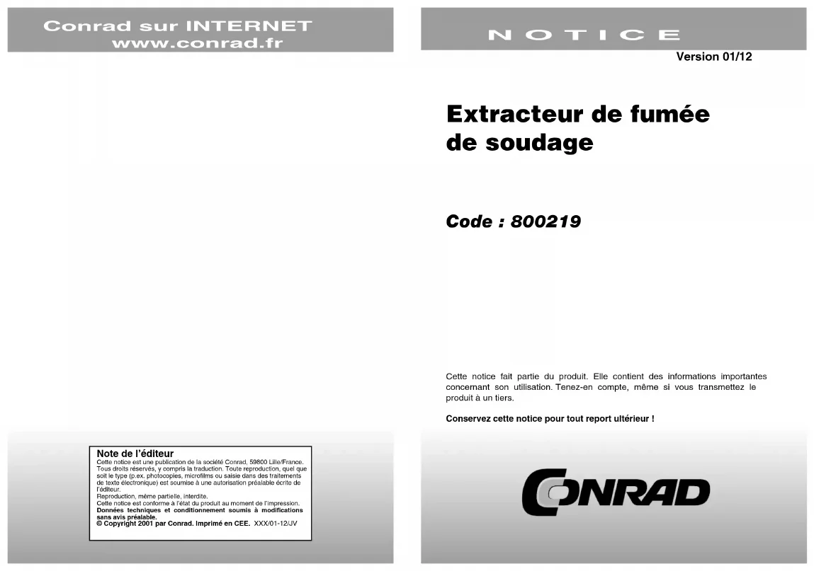 Note de l’éditeur Cette notice est une publication de la société Conrad, 59800 Lille/France.Tous droits réservés, y compris la traduction. Toute reproduction, quel que soit le type (p.ex. photocopies, microfilms ou saisie dans des traitements de texte électronique) est soumise à une autorisation préalable écrite de l’éditeur.Reproduction, même partielle, interdite.Cette notice est conforme à l’état du produit au moment de l’impression.Données techniques et conditionnement soumis à modifications sans avis préalable.© Copyright 2001 par Conrad. Imprimé en CEE. XXX/01-12/JV Extracteur de fumée de soudage Code : 800219 Cette notice fait partie du produit. Elle contient des informations importantes concernant son utilisation. Tenez-en compte, même si vous transmettez le produit à un tiers.Conservez cette notice pour tout report ultérieur ! N O T I C E Conrad sur INTERNET www.conrad.fr Version 01/12Extracteur de fumée de soudage LDA 1 Euro Cet extracteur de fumée de soudage a été conçu dans le but d’extraire les vapeurs nocives des lieux de travail (DIN 8511). Il vous protège activement contre les maux de têtes, les inflammations oculaires et les phénomènes de fatigue, qui résultent souvent de l’inhalation de vapeurs de soudage. Son ventilateur axial puissant enlève les vapeurs de soudages nauséabondes grâce à un filtre à charbon actif. Les polluants chimiques sont également absorbés de manière efficace. Placez l’extracteur aussi près que possible de la soudure. De plus, c’est un appareil robuste de par sa carcasse en aluminium et même les pannes à souder les plus chaudes ne peuvent l’abîmer. Changer le filtre Retirez la fiche secteur ! Les deux vis rouges sont à dévisser entièrement. Poussez légèrement le cache supérieur vers le haut. La tôle perforée s’enlève alors facilement. Remplacez le filtre usagé par des nouveaux. Ne retournez pas le filtre usagé et ne le réutilisez pas. Replacez la tôle perforée. Poussez légèrement le cache supérieur vers le bas et refixez les deux vis. Si vous souhaitez changer le filtre plus rapidement, vous pouvez remplacer les vis à six pans par les vis à ailettes fournies. Utilisez, par ex., de l’essuie-tout pour nettoyer la tôle perforée. La durée de vie du filtre s’élève à 4 semaines, pour 8 heures de fonctionnement. Si vous utilisez l’extracteur au-dessus d’un petit bain d’immersion, fixez le pied sur le plan de travail. Puissance électrique : 220/240V 50/60Hz 8W Débit d’air : 183 m³/h Bruit de roulement : 40 dB Boîtier : Aluminium anodisé Dimensions : 150 x 140 x 55 mm