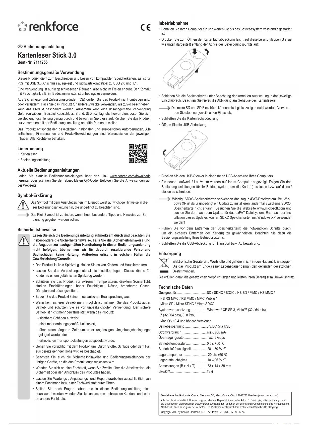 RF-3285273 - Lecteur de cartes mémoire Renkforce - Notice d'utilisation et mode d'emploi gratuit
