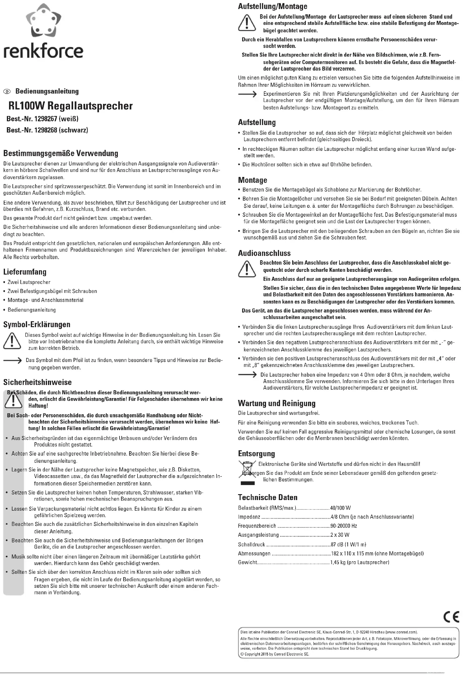 - If in doubt about how to connect the product correctly, or should any questions arise that are not answered in these operating instructions, please contact our technical service or any other professional expert. This is a publication by Conrad Electronic SE, Klaus-Conrad-Str. 1, D-92240 Hirschau (www.conrad.com). All rights including translation reserved. Reproduction by any method, e.g. photocopy, microfilming, or the capture in electronic data processing systems require the prior written approval by the editor. Reprinting, also in part, is prohibited. This publication represent the technical status at the time of printing. © Copyright 2015 by Conrad Electronic SE.Installation/Montage Veillez à une position sûre et une surface de montage correspondante ou une fixation stable des attaches pour installer et monter les haut-parleurs. Une chute des haut-parleurs peut causer des dommages corporels sérieux. Ne positionnez jamais vos haut-parleurs à proximité d’écrans, p. ex. de téléviseur ou d’ordinateur. Les champs magnétiques des haut-parleurs pourraient entraîner une distorsion de l’image. Afin d’obtenir un son parfait, essayez de mettre en œuvre les indications de positionnement sui- vantes, dans le cadre de vos possibilités dans la pièce d’écoute. Expérimentez les différentes possibilités de placement et d’orientation avant le mon- tage définitif, pour déterminer la meilleure position ou le meilleur montage des haut- parleurs dans votre salle d’écoute. Installation