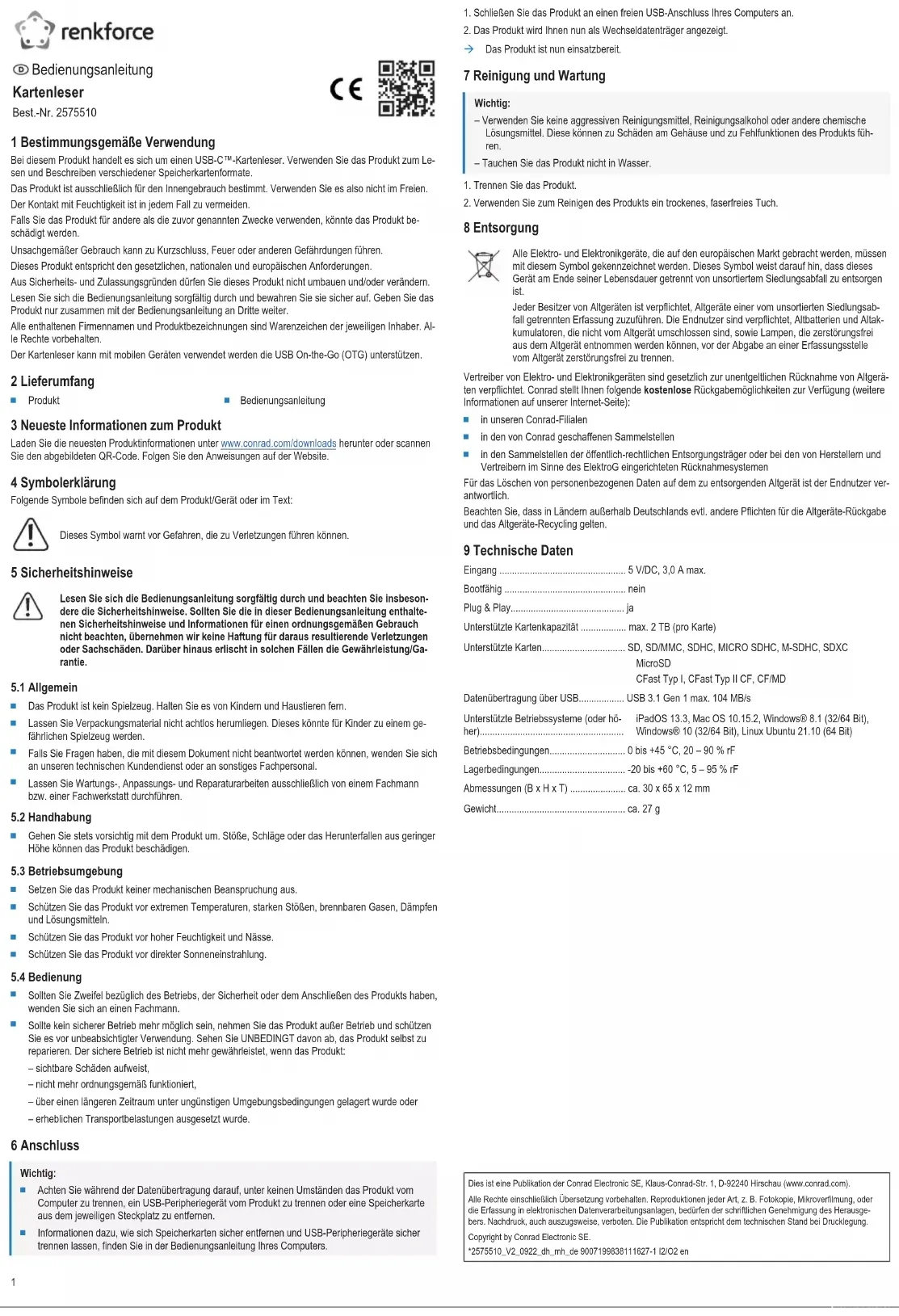 at the collection points of public waste management authorities or the collection points set up by man- ufacturers or distributors within the meaning of the ElektroG End users are responsible for deleting personal data from the WEEE to be disposed of. It should be noted that different obligations about the return or recycling of WEEE may apply in countries outside of Germany. 9 Technical data Input ....................................................... 5 V/DC, 3.0 A max. Bootable ................................................. no Plug and play.......................................... yes Supported card capacity......................... max. 2 TB (each card) Supported cards ..................................... SD, SD/MMC, SDHC, MICRO SDHC, M-SDHC, SDXC MicroSD CFast Type I, CFast Type II CF, CF/MD USB data transfer................................... USB 3.1 Gen 1 max. 104 MB/s Supported OS (or above) ....................... IpadOS 13.3, Mac OS 10.15.2, Windows® 8.1 (32/64 bit), Windows® 10 (32/64 bit), Linux Ubuntu 21.10 (64 bit) Operating conditions............................... 0 to +45 °C, 20 – 90 % RH Storage conditions.................................. -20 to +60 °C, 5 – 95 % RH Dimensions (W x H x D) ......................... approx. 30 x 65 x 12 mm Weight .................................................... approx. 27 g This is a publication by Conrad Electronic SE, Klaus-Conrad-Str. 1, D-92240 Hirschau (www.conrad.com). All rights including translation reserved. Reproduction by any method (e.g. photocopying, microfilming or the capture in electronic data processing systems) requires prior written approval from the editor. Reprinting, also in part, is prohibited. This publication reflects the technical status at the time of printing. Copyright by Conrad Electronic SE. *2575510_V2_0922_dh_mh_en 9007199838111627-2 I2/O2 en3 Mode d’emploi Lecteur de carte N° de commande 2575510 1 Utilisation prévue Le produit est un lecteur de carteUSB-C™. Utilisez le produit pour lire et écrire sur différents formats de cartes mémoire Le produit est destiné uniquement à une utilisation à l’intérieur. Ne l'utilisez pas à l’extérieur. Dans tous les cas, le contact avec l’humidité doit être évité. Toute utilisation à des fins autres que celles décrites pourrait endommager le produit. Une mauvaise utilisation peut entraîner des risques tels que des courts-circuits, des incendies, etc. Ce produit est conforme aux exigences nationales et européennes en vigueur. Pour des raisons de sécurité et d’homologation, toute restructuration et/ou modification du produit est in- terdite. Lisez attentivement les instructions du mode d’emploi et conservez-le dans un endroit sûr. Ne mettez ce produit à la disposition de tiers qu’avec son mode d’emploi. Tous les noms d’entreprises et appellations de produits sont des marques commerciales de leurs proprié- taires respectifs. Tous droits réservés. Le lecteur de cartes peut être utilisé avec des appareils mobiles qui prennent en charge la technologie USB On-the-Go (OTG). 2 Contenu de l'emballage