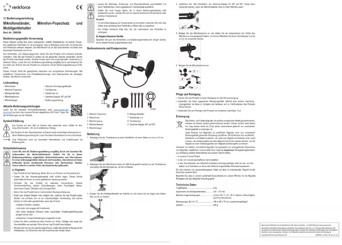 pour le xer en place. Mode d’emploi Support de microphone, ltre anti-pop pour microphone et support de mobile Nº de commande 2369289 Utilisation prévue Ce support est doté d’un cadre métallique robuste et amélioré, avec des ressorts puissants pour fournir un soutien supplémentaire. Il est conçu pour supporter des microphones en toute sécurité et réduit efcacement les bruits et les vibrations. Le bras du microphone pivote à 360 degrés et offre une portée à l’horizontale de 65 cm. Pour des raisons de sécurité et d’homologation, toute reconstitution et/ou modication de ce produit est interdite. Toute utilisation à des ns autres que celles décrites pourrait endommager le produit. En outre, une mauvaise utilisation vous expose à des risques. Lisez attentivement le mode d’emploi et conservez-le dans un endroit sûr. Si vous devez fournir ce produit à des tiers, veillez à y joindre le mode d’emploi. Ce produit est conforme aux exigences nationales et européennes en vigueur. Tous les noms d’entreprises et appellations de produits sont des marques commerciales de leurs propriétaires respectifs. Tous droits réservés. Contenu du paquet