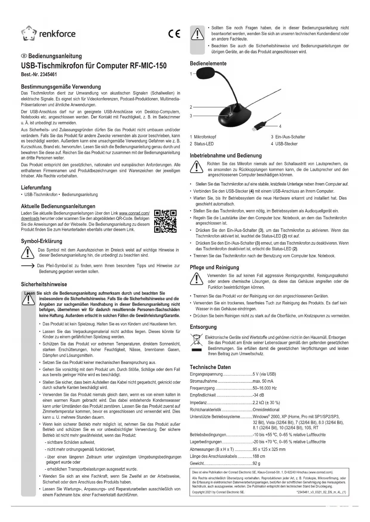 2000, XP (Home, Pro, avec SP1/SP2/SP3, 32 bits), Vista (32/64 bits), 7 (32/64 bits), 8.0 (32/64 bits), 8.1 (32/64 bits), 10 (32/64 bits), 10S, RT Conditions de service ............................... -10 à +55 ºC, 0 – 65 % d’humidité relative Conditions de stockage ............................ -20 à +70 ºC, 0 à 95 % d’humidité relative Dimensions (l x H x P) .............................. 95 x 125 x 325 mm Longueur du câble de raccordement ........ 188 cm Poids ......................................................... 92 g Mode d’emploi Microphone de table USB pour ordinateur RF-MIC-150 N° de commande 2345461 Utilisation prévue Le micro de table sert à la transformation de signaux acoustiques (ondes sonores) en signaux électriques. Il convient pour les conférences vidéo, la production de podcasts, les présentations multimédias et autres applications similaires. La che USB doit uniquement être raccordée à des ports USB appropriés d'ordinateurs de bureau, d’ordinateurs portables, etc. Le contact avec l'humidité, par ex. dans une salle de bains, etc. doit être absolument évité. Pour des raisons de sécurité et d’homologation, toute transformation et/ou modication du produit est interdite. Si vous utilisez le produit à d'autres ns que celles décrites précédemment, il risque d'être endommagé. En outre, une utilisation incorrecte peut générer des risques, comme par exemple un court-circuit, un incendie, etc. Lisez attentivement le mode d’emploi et conservez-le. Ne donnez le produit à un tiers qu’accompagné de son mode d’emploi. Le produit est conforme aux exigences légales, européennes et nationales en vigueur. Tous les noms d’entreprises et appellations de produits contenus dans ce mode d’emploi sont des marques déposées de leurs propriétaires respectifs. Tous droits réservés. Contenu d’emballage