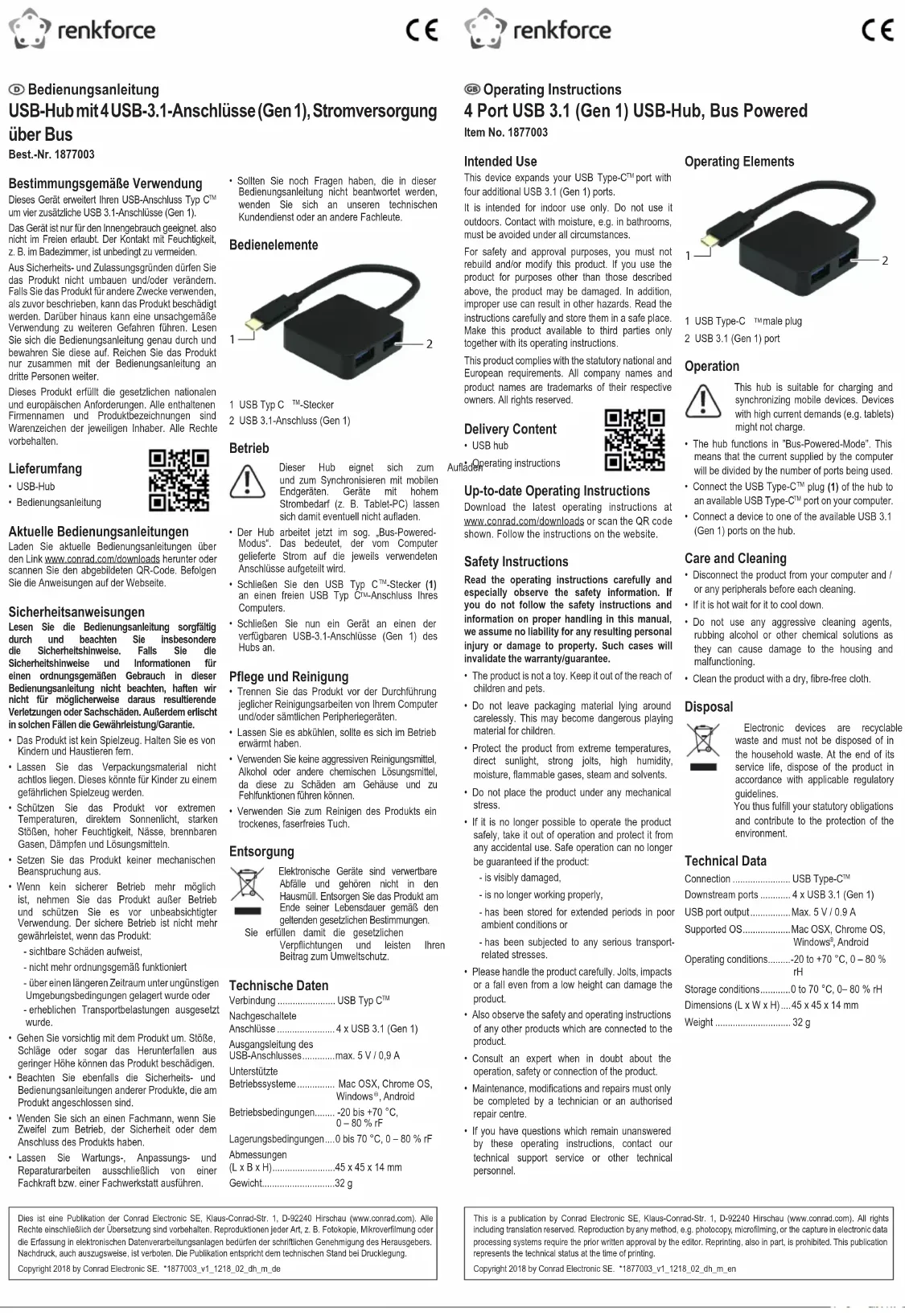 - Disconnect the product from your computer and / or any peripherals before each cleaning.• If it is hot wait for it to cool down.• Do not use any aggressive cleaning agents, rubbing alcohol or other chemical solutions as they can cause damage to the housing and malfunctioning.• Cleantheproductwithadry,bre-freecloth. Disposal Electronic devices are recyclable waste and must not be disposed of in the household waste. At the end of its service life, dispose of the product in accordance with applicable regulatory guidelines. Youthusfulllyourstatutoryobligationsand contribute to the protection of the environment. Technical Data Connection ....................... USB Type-C Downstream ports ............ 4 x USB 3.1 (Gen 1) USB port output ................ Max. 5 V / 0.9 ASupported OS ................... Mac OSX, Chrome OS, Windows , AndroidOperating conditions ......... -20 to +70 °C, 0 – 80 % Storage conditions ............ 0 to 70 °C, 0– 80 % rHDimensions (L x W x H) .... 45 x 45 x 14 mmWeight .............................. 32 gThis is a publication by Conrad Electronic SE, Klaus-Conrad-Str. 1, D-92240 Hirschau (www.conrad.com). All rights includingtranslationreserved.Reproductionbyanymethod,e.g.photocopy,microlming,orthecaptureinelectronicdata processing systems require the prior written approval by the editor. Reprinting, also in part, is prohibited. This publication represents the technical status at the time of printing.Copyright 2018 by Conrad Electronic SE. *1877003_v1_1218_02_dh_m_enMode d’emploi Hub USB à 4ports USB 3.1 (Gén.1), alimenté par bus N° de commande1877003 Utilisation prévue Cet appareil étend votre port USB Type-C avec quatre ports USB 3.1 (Gén. 1) additionnels.Ce produit est prévu pour un usage à l’intérieur exclusivement. Ne l'utilisez pas à l’extérieur. Tout contact avec l’humidité, par ex. dans les salles de bains, doit être évité en toutes circonstances.Pour des raisons de sécurité et d’homologation, toute restructuration et/ou modication du produitest interdite. Le produit pourrait être endommagé en cas d'utilisation autre que celle décrite ci-dessus. En outre, une mauvaise utilisation vous expose à d’autres risques. Lisez attentivement les instructions du mode d’emploi et conservez-le dans un endroit sûr. Ne mettez ce produit à la disposition de tiers qu’avec son mode d’emploi.Ce produit est conforme aux exigences nationales et européennes en vigueur. Tous les noms d’entreprises et appellations de produits sont des marques commerciales de leurs propriétaires respectifs. Tous droits réservés. Contenu d'emballage