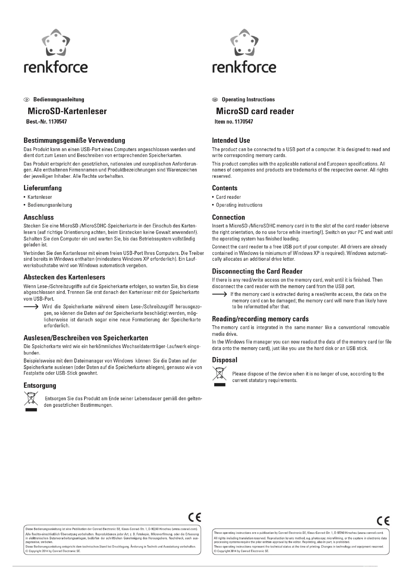 RF-3511641 - Lecteur de cartes mémoire Renkforce - Notice d'utilisation et mode d'emploi gratuit
