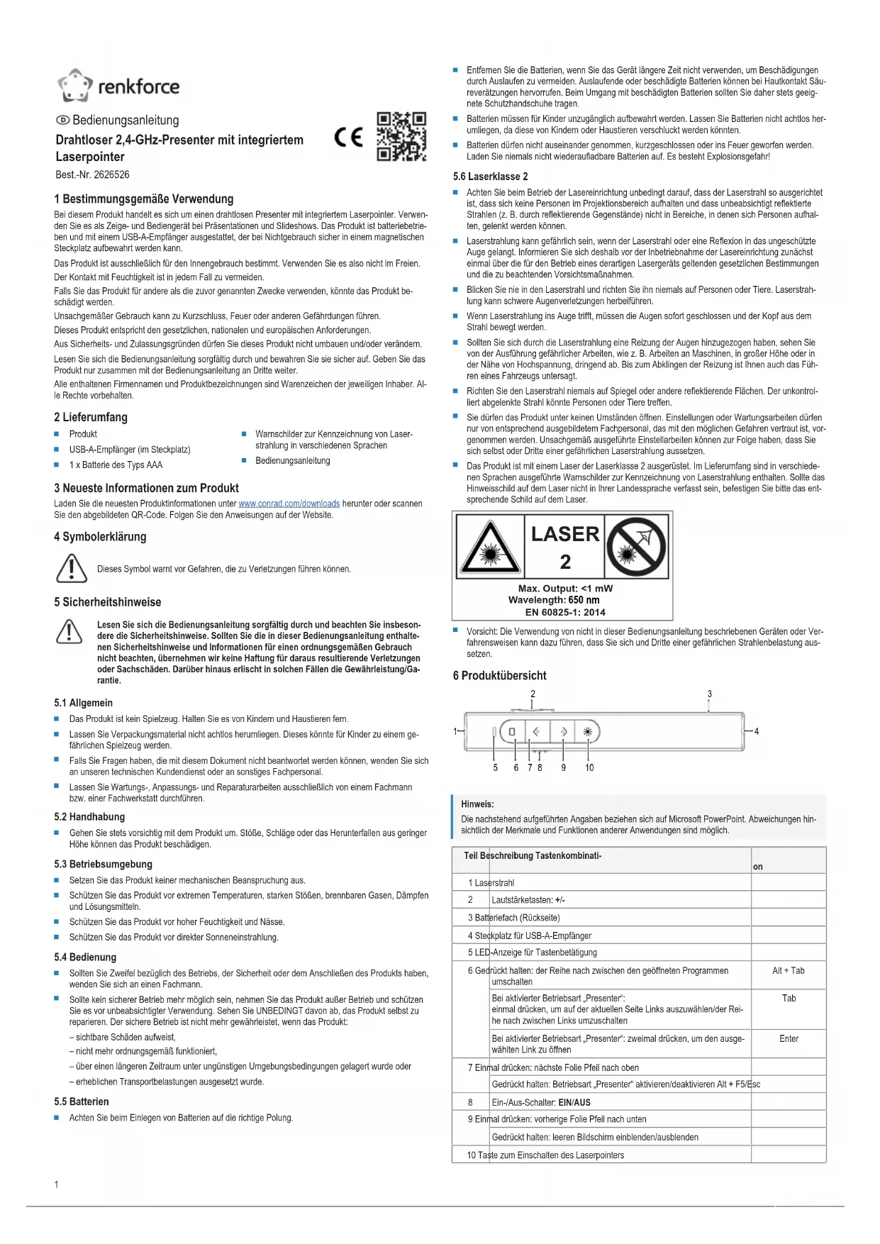 Operating conditions............................... 0 to +50 °C, 10 - 90 % RH (non-condensing) Storage conditions.................................. -20 to +70 °C, 5 - 95 % RH (non-condensing) This is a publication by Conrad Electronic SE, Klaus-Conrad-Str. 1, D-92240 Hirschau (www.conrad.com). All rights including translation reserved. Reproduction by any method (e.g. photocopying, microfilming or the capture in electronic data processing systems) requires prior written approval from the editor. Reprinting, also in part, is prohibited. This publication reflects the technical status at the time of printing. Copyright by Conrad Electronic SE. *2626526_V3_0523_dh_mh_en 18014399286014731-2 I3/O3 en5 Mode d’emploi Présentateur sans fil et pointeur laser 2,4 GHz N° de commande 2626526 1 Utilisation prévue Le produit est un présentateur sans fil avec pointeur laser. Utilisez le produit comme dispositif de pointagependant les présentations et pour contrôler les animations. Il fonctionne sur piles et avec un récepteurUSB-A qui s'insère dans une fente magnétique lorsqu'il n'est pas utilisé.Le produit est destiné uniquement à une utilisation à l’intérieur. Ne l'utilisez pas à l’extérieur.Dans tous les cas, le contact avec l’humidité doit être évité.Toute utilisation à des fins autres que celles décrites pourrait endommager le produit.Une mauvaise utilisation peut entraîner des risques tels que des courts-circuits, des incendies, etc.Ce produit est conforme aux exigences nationales et européennes en vigueur.Pour des raisons de sécurité et d’homologation, toute restructuration et/ou modification du produit est in-terdite.Lisez attentivement les instructions du mode d’emploi et conservez-le dans un endroit sûr. Ne mettez ceproduit à la disposition de tiers qu’avec son mode d’emploi.Tous les noms d’entreprises et appellations de produits sont des marques commerciales de leurs proprié-taires respectifs. Tous droits réservés. 2 Contenu de l'emballage