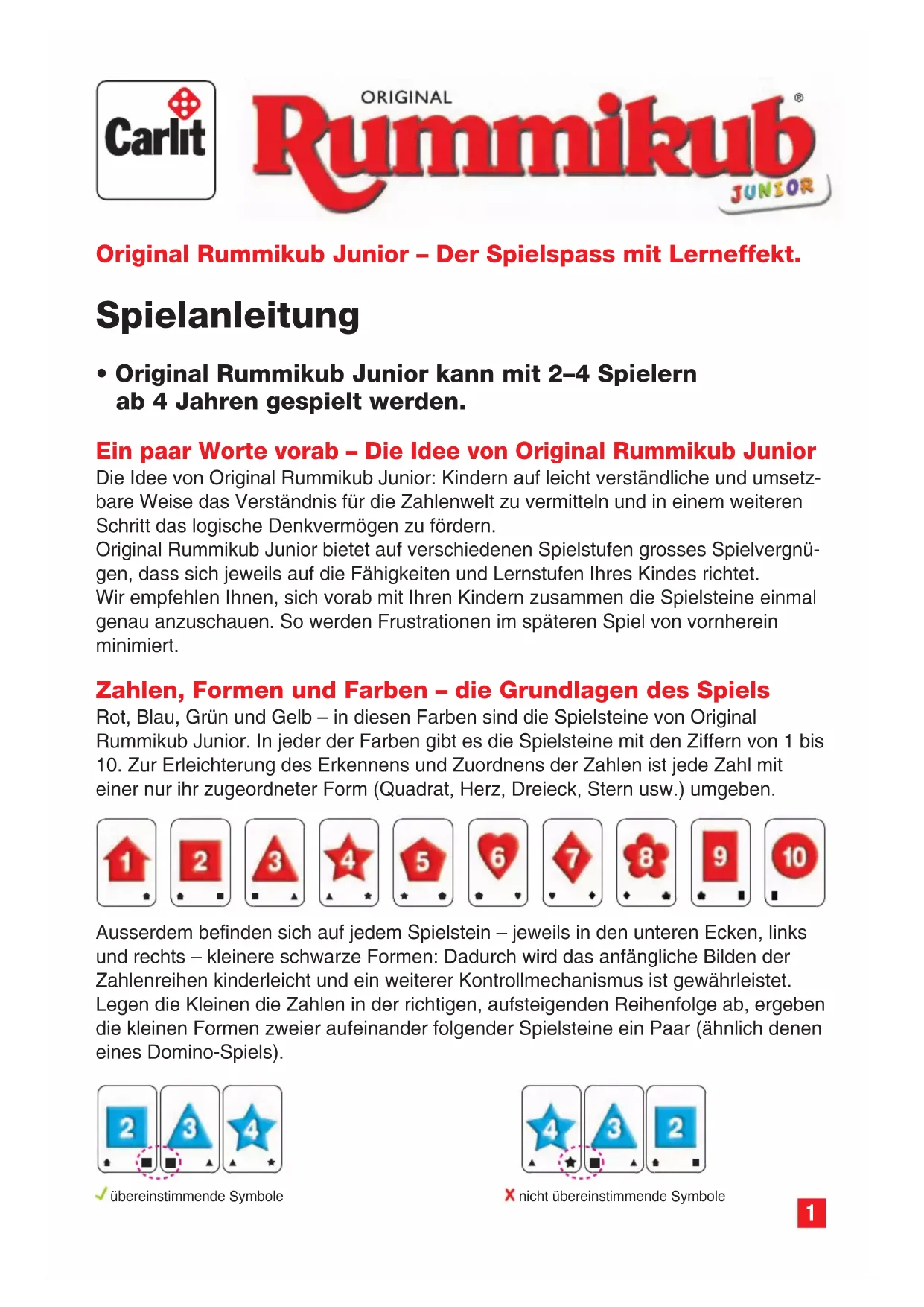 - Rummikub Original Junior se joue à 2–4 joueurs à partir de 4 ans. Avant de commencer – L’idée de Rummikub Original Junior L’idée de Rummikub Original Junior est de familiariser les enfants – de manière simple et concrète – avec le monde des chiffres, ainsi que de stimuler leur sens de la logique. Rummikub Original Junior offre un grand plaisir de jeu, et ce à différents niveaux de difficulté, qui s’adaptent aux capacités et au niveau d’apprentissage de l’enfant. Avant de commencer à jouer, nous vous conseillons de découvrir les plaquettes, ensemble avec l’enfant. Ainsi, d’éventuelles frustrations, pouvant survenir pendant le jeu, peuvent être évitées d’emblée. Des chiffres, des formes et des couleurs – les bases du jeu Rouge, bleu, vert et jaune – ce sont les couleurs des plaquettes de Rummikub Original Junior. De plus, ces plaquettes sont numérotées de 1 à 10. Afin de faciliter la reconnaissance et le classement des chiffres, chacun d’eux est encadré par une forme (carré, cœur, triangle, étoile, etc.). De plus, de petites formes noires se trouvent en bas à gauche et à droite de chaque plaquette. Elles ont pour but de faciliter la création de combinaisons de chiffres et offrent une possibilité de contrôle supplémentaire. Lorsque les enfants placent correctement les plaquettes, par ordre croissant, les formes, au bas de chaque plaquette, font une paire (même principe que pour le domino).