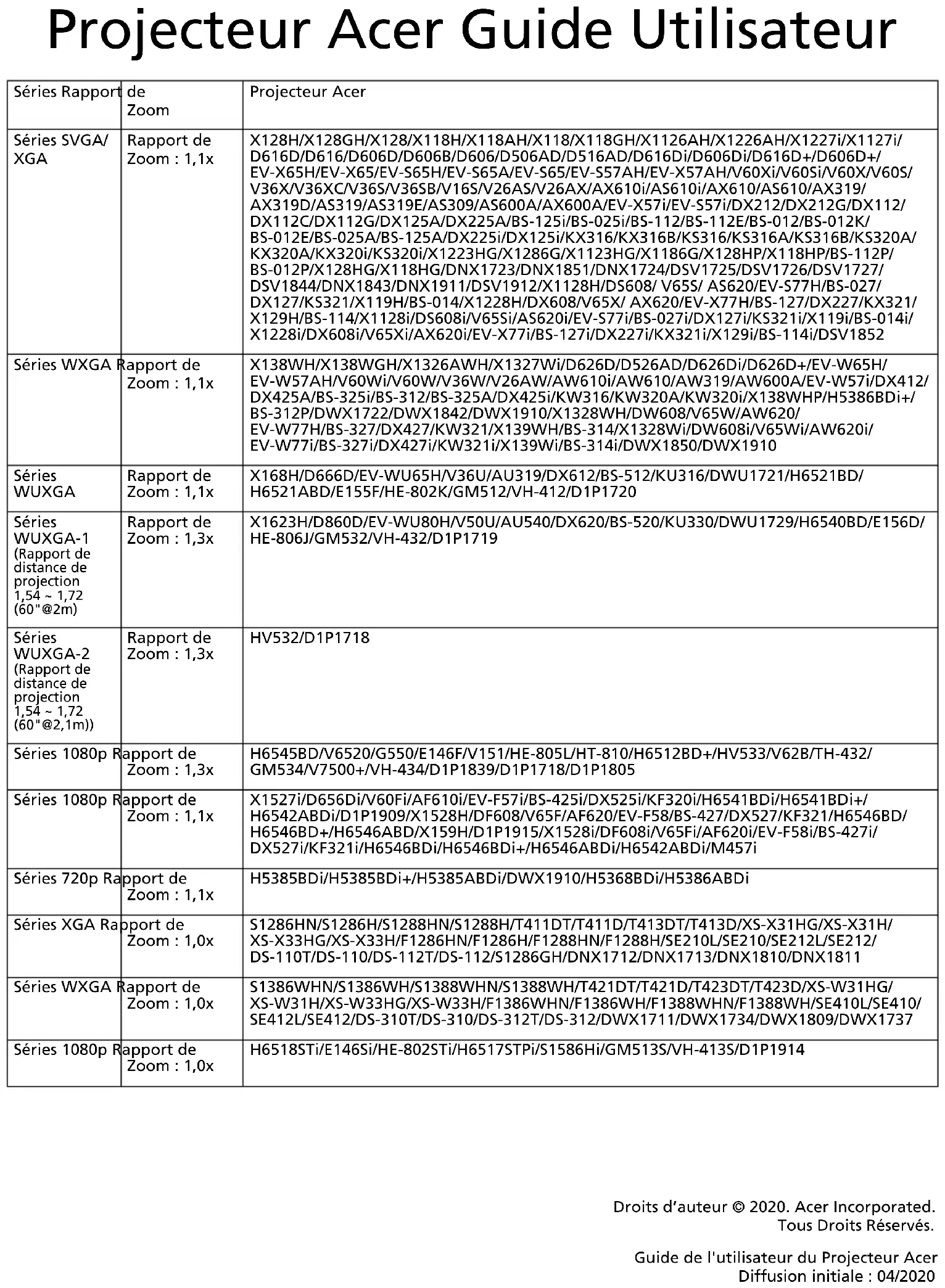 Projecteur Acer Guide Utilisateur Séries Rapport de Zoom Projecteur Acer Séries SVGA/ XGA Rapport de Zoom : 1,1x X128H/X128GH/X128/X118H/X118AH/X118/X118GH/X1126AH/X1226AH/X1227i/X1127i/ D616D/D616/D606D/D606B/D606/D506AD/D516AD/D616Di/D606Di/D616D+/D606D+/ EV-X65H/EV-X65/EV-S65H/EV-S65A/EV-S65/EV-S57AH/EV-X57AH/V60Xi/V60Si/V60X/V60S/ V36X/V36XC/V36S/V36SB/V16S/V26AS/V26AX/AX610i/AS610i/AX610/AS610/AX319/ AX319D/AS319/AS319E/AS309/AS600A/AX600A/EV-X57i/EV-S57i/DX212/DX212G/DX112/ DX112C/DX112G/DX125A/DX225A/BS-125i/BS-025i/BS-112/BS-112E/BS-012/BS-012K/ BS-012E/BS-025A/BS-125A/DX225i/DX125i/KX316/KX316B/KS316/KS316A/KS316B/KS320A/ KX320A/KX320i/KS320i/X1223HG/X1286G/X1123HG/X1186G/X128HP/X118HP/BS-112P/ BS-012P/X128HG/X118HG/DNX1723/DNX1851/DNX1724/DSV1725/DSV1726/DSV1727/ DSV1844/DNX1843/DNX1911/DSV1912/X1128H/DS608/ V65S/ AS620/EV-S77H/BS-027/ DX127/KS321/X119H/BS-014/X1228H/DX608/V65X/ AX620/EV-X77H/BS-127/DX227/KX321/ X129H/BS-114/X1128i/DS608i/V65Si/AS620i/EV-S77i/BS-027i/DX127i/KS321i/X119i/BS-014i/ X1228i/DX608i/V65Xi/AX620i/EV-X77i/BS-127i/DX227i/KX321i/X129i/BS-114i/DSV1852 Séries WXGA Rapport de Zoom : 1,1x X138WH/X138WGH/X1326AWH/X1327Wi/D626D/D526AD/D626Di/D626D+/EV-W65H/ EV-W57AH/V60Wi/V60W/V36W/V26AW/AW610i/AW610/AW319/AW600A/EV-W57i/DX412/ DX425A/BS-325i/BS-312/BS-325A/DX425i/KW316/KW320A/KW320i/X138WHP/H5386BDi+/ BS-312P/DWX1722/DWX1842/DWX1910/X1328WH/DW608/V65W/AW620/ EV-W77H/BS-327/DX427/KW321/X139WH/BS-314/X1328Wi/DW608i/V65Wi/AW620i/ EV-W77i/BS-327i/DX427i/KW321i/X139Wi/BS-314i/DWX1850/DWX1910 Séries WUXGA Rapport de Zoom : 1,1x X168H/D666D/EV-WU65H/V36U/AU319/DX612/BS-512/KU316/DWU1721/H6521BD/ H6521ABD/E155F/HE-802K/GM512/VH-412/D1P1720 Séries WUXGA-1 (Rapport de distance de projection 1,54 ~ 1,72 (60"@2m) Rapport de Zoom : 1,3x X1623H/D860D/EV-WU80H/V50U/AU540/DX620/BS-520/KU330/DWU1729/H6540BD/E156D/ HE-806J/GM532/VH-432/D1P1719 Séries WUXGA-2 (Rapport de distance de projection 1,54 ~ 1,72 (60"@2,1m)) Rapport de Zoom : 1,3x HV532/D1P1718 Séries 1080p Rapport de Zoom : 1,3x H6545BD/V6520/G550/E146F/V151/HE-805L/HT-810/H6512BD+/HV533/V62B/TH-432/ GM534/V7500+/VH-434/D1P1839/D1P1718/D1P1805 Séries 1080p Rapport de Zoom : 1,1x X1527i/D656Di/V60Fi/AF610i/EV-F57i/BS-425i/DX525i/KF320i/H6541BDi/H6541BDi+/ H6542ABDi/D1P1909/X1528H/DF608/V65F/AF620/EV-F58/BS-427/DX527/KF321/H6546BD/ H6546BD+/H6546ABD/X159H/D1P1915/X1528i/DF608i/V65Fi/AF620i/EV-F58i/BS-427i/ DX527i/KF321i/H6546BDi/H6546BDi+/H6546ABDi/H6542ABDi/M457i Séries 720p Rapport de Zoom : 1,1x H5385BDi/H5385BDi+/H5385ABDi/DWX1910/H5368BDi/H5386ABDi Séries XGA Rapport de Zoom : 1,0x S1286HN/S1286H/S1288HN/S1288H/T411DT/T411D/T413DT/T413D/XS-X31HG/XS-X31H/ XS-X33HG/XS-X33H/F1286HN/F1286H/F1288HN/F1288H/SE210L/SE210/SE212L/SE212/ DS-110T/DS-110/DS-112T/DS-112/S1286GH/DNX1712/DNX1713/DNX1810/DNX1811 Séries WXGA Rapport de Zoom : 1,0x S1386WHN/S1386WH/S1388WHN/S1388WH/T421DT/T421D/T423DT/T423D/XS-W31HG/ XS-W31H/XS-W33HG/XS-W33H/F1386WHN/F1386WH/F1388WHN/F1388WH/SE410L/SE410/ SE412L/SE412/DS-310T/DS-310/DS-312T/DS-312/DWX1711/DWX1734/DWX1809/DWX1737 Séries 1080p Rapport de Zoom : 1,0x H6518STi/E146Si/HE-802STi/H6517STPi/S1586Hi/GM513S/VH-413S/D1P1914 Droits d’auteur © 2020. Acer Incorporated. Tous Droits Réservés. Guide de l'utilisateur du Projecteur Acer Diffusion initiale : 04/2020Des modifications peuvent être apportées de temps à autre aux informations contenues dans cette publication. Ces modifications seront ajoutées aux nouvelles éditions de ce manuel. La présente société ne fournit aucune espèce de garantie expresse ou implicite, relative aux informations contenues dans ce manuel et n’offre notamment aucune garantie d’aucune sorte quant à la valeur marchande de ce produit ou son adéquation à une utilisation particulière. Enregistrez le numéro de série, la date d’achat, et le numéro du modèle dans l’espace prévu cidessous. Le numéro de série et le numéro de modèle sont imprimés sur l’étiquette collée sur le châssis. Toutes les correspondances concernant cette unité doivent inclure ces informations. Toute reproduction, transmission, transcription ou mise en mémoire de ce manuel ou partie sur un support quelconque, par quelque procédé que ce soit, notamment, électronique, mécanique, photocopie, enregistrement, ou autre, sont interdites sans l’autorisation écrite préalable d’Acer Incorporated. Modèle : _______________________________________ No. de série : ___________________________________ Date d’achat : __________________________________ Lieu d’achat : ___________________________________ Acer et le logo Acer sont des marques commerciales déposées par Acer Incorporated. Les noms de produits ou marques commerciales d’autres sociétés sont utilisés ici à des fins d’identification uniquement et sont la propriété de leurs détenteurs respectifs. « HDMI™, le logo HDMI et High-Definition Multimedia Interface sont des marques commerciales ou déposées de HDMI Licensing LLC. »iii Informations concernant votre sécurité et votre confort Lisez ces consignes attentivement. Conservez ce document pour des références ultérieures. Respectez tous les avertissements et instructions indiqués sur le produit. Eteindre le produit avant tout nettoyage Débranchez ce produit de la prise murale avant tout nettoyage. Ne pas utiliser de nettoyants liquides ou en aérosol. Utilisez un chiffon humide pour le nettoyage. Mise en garde concernant la prise lors de la déconnexion de l’appareil Observez les consignes suivantes lorsque vous connectez et déconnectez l’alimentation à une alimentation externe :