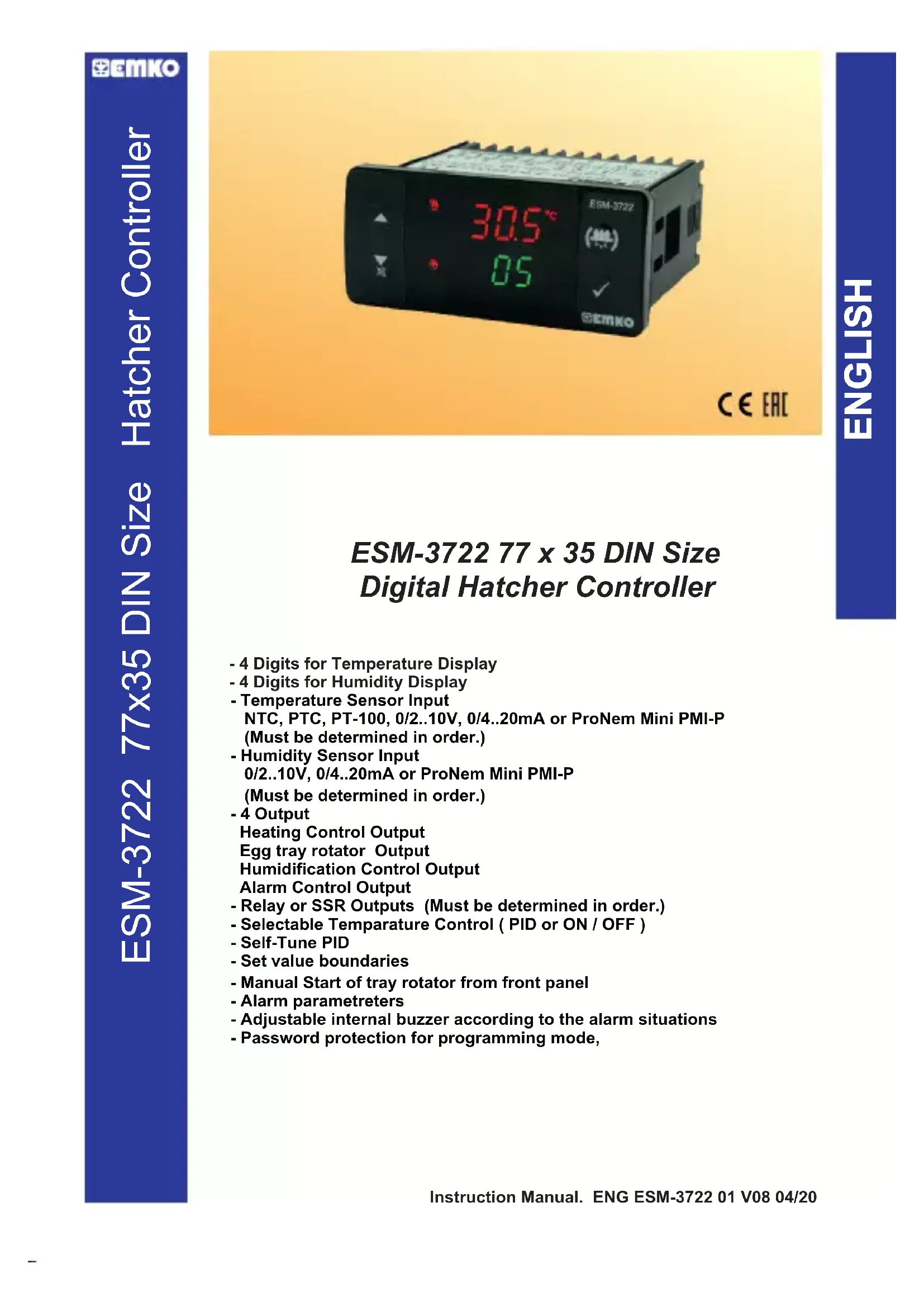 - Ihr Technologiepartner www.emkoelektronik.com.tr Vielen Dank, dass Sie sich für Emko Elektronik Produkte entschieden haben. Bitte besuchen Sie unsere Webseite, um die detaillierte Bedienungsanleitung herunterzuladen.ESM-3722 Taille DIN 77x35 Régulateur Hatcher Manuel d'utilisation. FRA ESM-3722 01 V08 04/20 - Affichage de température à 4 chiffres - Affichage d'humidité à 4 chiffres - Entrée de capteur de température NTC, PTC, PT-100, 0/2 p. 10