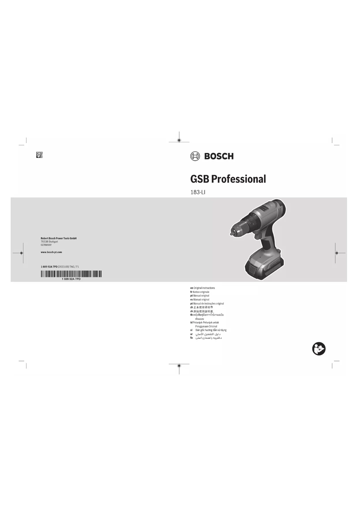 Téléchargez la notice de votre Perceuse au format PDF gratuitement ! Retrouvez votre notice GSB 183-LI Professional - BOSCH et reprennez votre appareil électronique en main. Sur cette page sont publiés tous les documents nécessaires à l'utilisation de votre appareil GSB 183-LI Professional de la marque BOSCH.