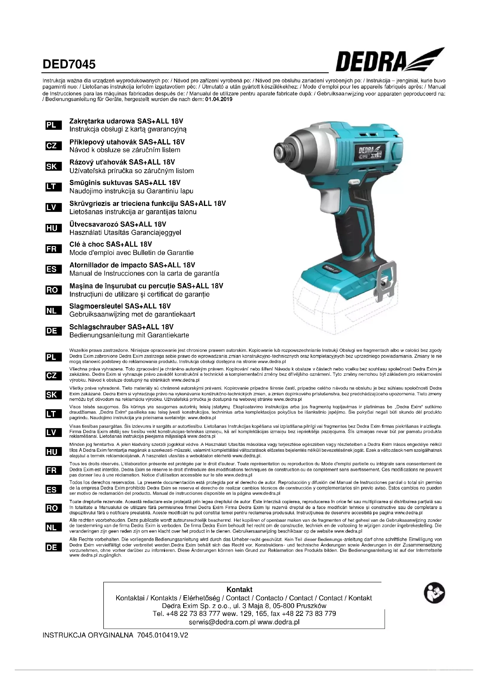 Accessoires recommandés Il est possibile de doter l’appareil électrique de ligne SAS+ALL de n’importe quel accumulateur et chargeur de la ligne SAS+ALL. Afin d’acheter les pièces de rechange et les accessoires, il faut prendre contact avec le Service Dedra-Exim. Les données de contact se trouvent à la première page du mode d’emploi. En faisant la commande des pièces, veuillez indiquer le numéro de LOT placé sur la plaque signalétique et le numéro de pièce du dessin de montage. Durant la période de garantie, les réparations sont faites selon les principes présentés dans la Carte de Garantie. Veuillez transmettre le produit au dépannage dans le lieu d’achat (le vendeur est obligé à recevoir le produit reclamé) ou l’envoyer au Service Central DEDRA-EXIM. Veuillez bien joindre la carte de garantie délivrée par l’importateur. A défaut de ce document, la réparation sera traitée d’après-vente. La période de garantie expirée, le Service Central fait les réparations. Il faut envoyer le produit endommagé au Service (les frais d’envoi chargent l’utilisateur).
