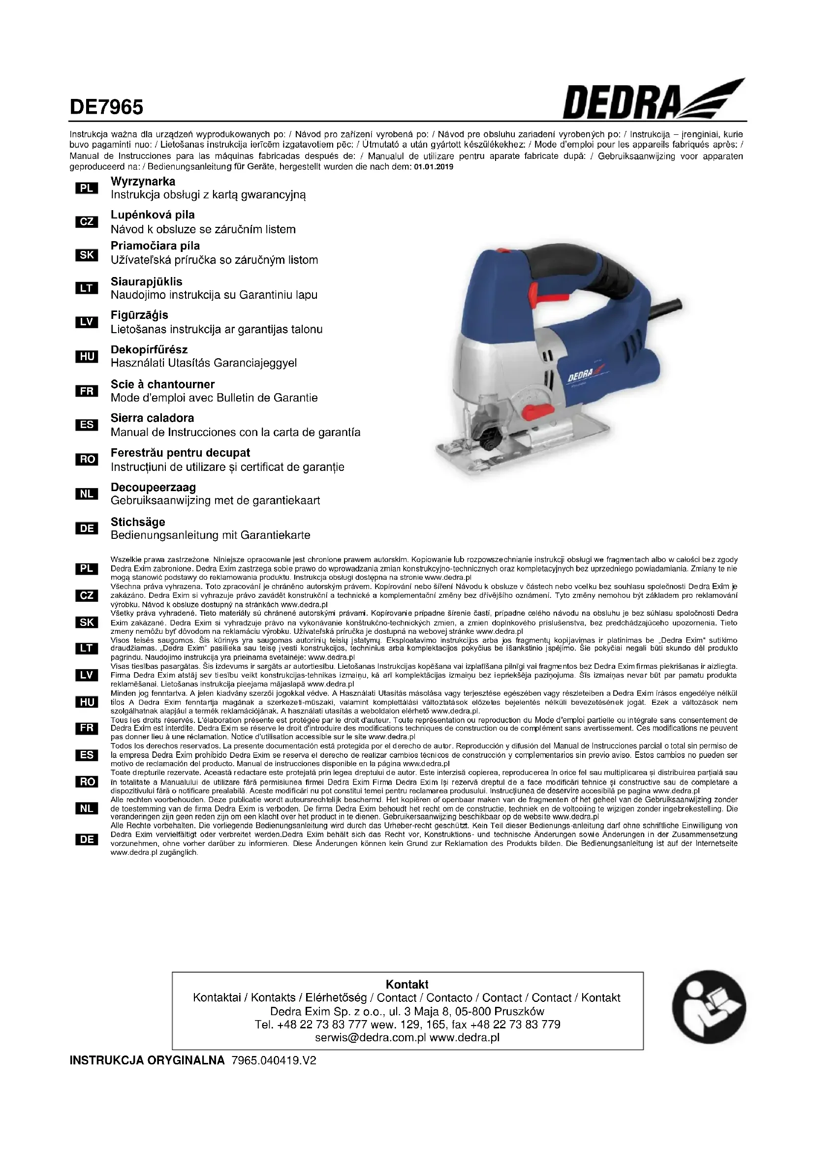 Pièces de rechange et accessoires DED79651 – lames à bois (2 pcs), DED79652 – lames à métal (2 pcs) Pour acheter des pièces de rechange et des accessoires, contactez le service DedraExim. Les coordonnées se trouvent à la page 1 de ce manuel. Lors de la commande de pièces de rechange, veuillez indiquer le numéro de lot sur la plaque signalétique et le numéro de série du plan de montage. Pendant la période de garantie, les réparations sont effectuées dans les conditions spécifiées sur la carte de garantie. Veuillez remettre le produit annoncé pour réparation sur le lieu d'achat (le vendeur est obligé d'accepter le produit annoncé), l'envoyer au service du lieu de résidence le plus proche (liste des services sur le site www.dedra.pl) ou l'envoyer au service central de DedraExim. Veuillez joindre la carte de garantie dûment remplie. Après la période de garantie, la réparation est effectuée par le service après-vente central. Le produit défectueux doit être envoyé au centre de service (les frais d'expédition sont à la charge de l'utilisateur).