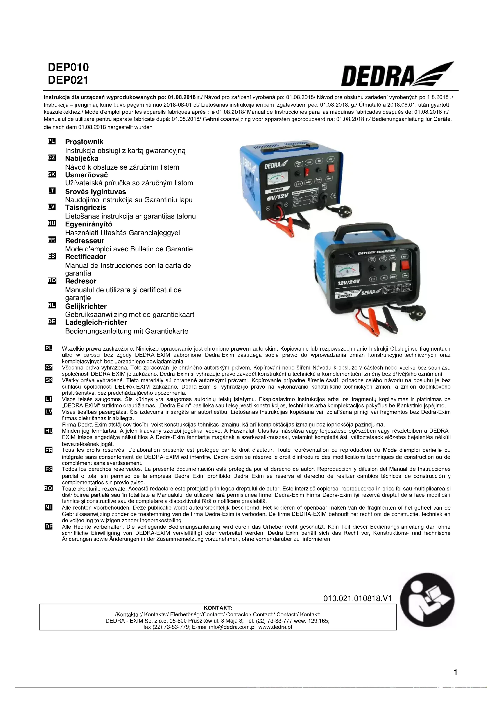 d’achat du Produit, dans le service de garantie ou par écrit à l’adresse: DEDRA EXIM sp. z o.o., ul. 3 Maja 8, 05-800 Pruszków. L’Utilisateur peut faire la réclamation avec le formulaire disponible sur le site web www.dedra.pl. („Formulaire de réclamation à titre de la garantie”). Les adresses de services de garantie sont disponibles pour les pays particuliers sur le site web www.dedra.pl. En cas d’absence du service de garantie pour un pays donné, il est recommandé d’adresser la réclamation à titre de la garantie à l’adresse : DEDRA EXIM sp. z o.o. ul. 3 Maja 8, 05-800 Pruszków (Polska). Vu la sécurité de l’Utilisateur, il est proscrit d’exploiter le Produit défectueux. Attention!!! L’exploitation du Produit défectueux est dangereux pour la santé et la vie de l’Utilisateur.22
