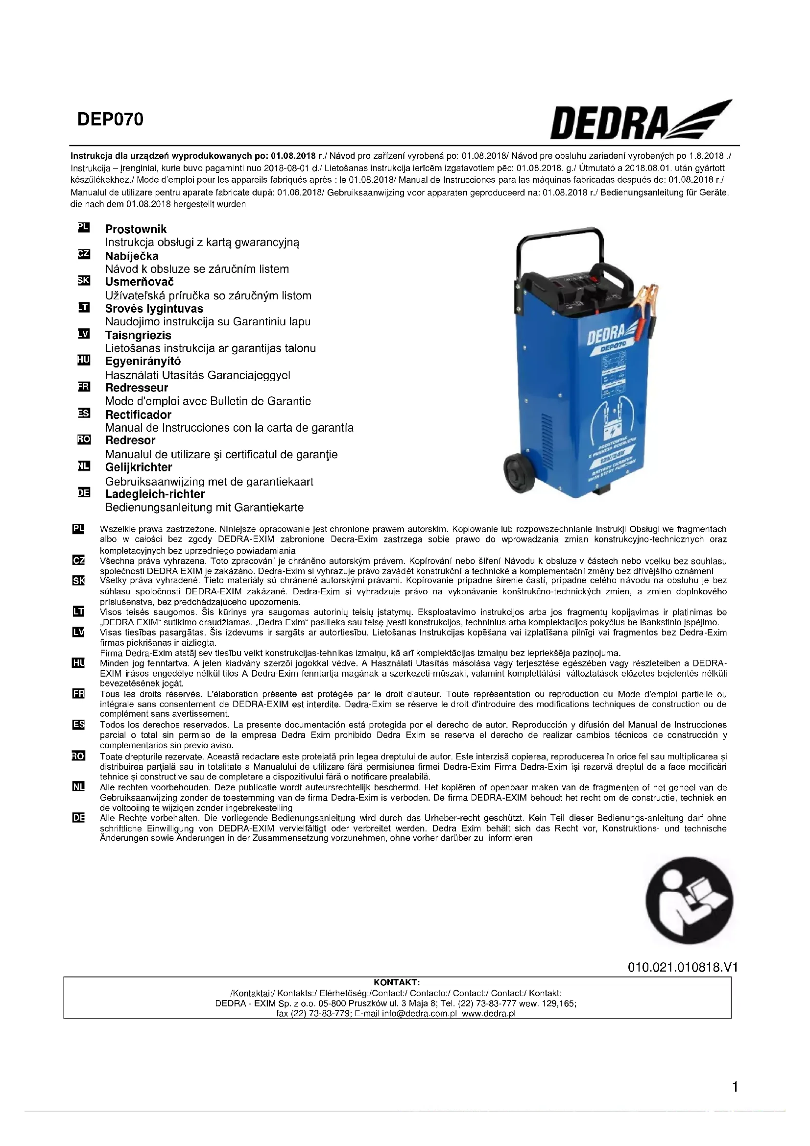 d’achat du Produit, dans le service de garantie ou par écrit à l’adresse: DEDRA EXIM sp. z o.o., ul. 3 Maja 8, 05-800 Pruszków. L’Utilisateur peut faire la réclamation avec le formulaire disponible sur le site web www.dedra.pl. („Formulaire de réclamation à titre de la garantie”). Les adresses de services de garantie sont disponibles pour les pays particuliers sur le site web www.dedra.pl. En cas d’absence du service de garantie pour un pays donné, il est recommandé d’adresser la réclamation à titre de la garantie à l’adresse : DEDRA EXIM sp. z o.o. ul. 3 Maja 8, 05-800 Pruszków (Polska). Vu la sécurité de l’Utilisateur, il est proscrit d’exploiter le Produit défectueux. Attention!!! L’exploitation du Produit défectueux est dangereux pour la santé et la vie de l’Utilisateur.