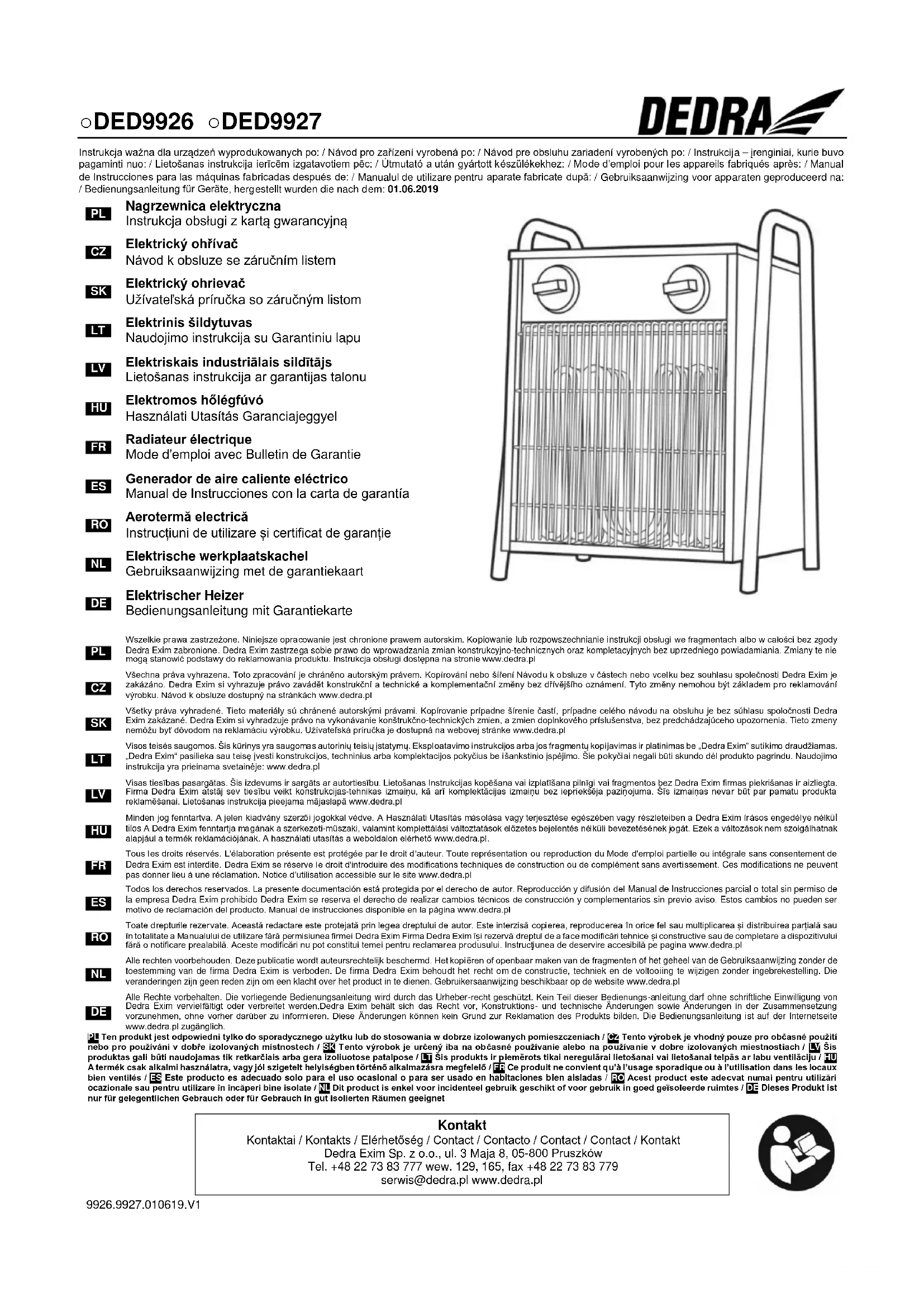 Tous les droits réservés. L'élaboration présente est protégée par le droit d'auteur. Toute représentation ou reproduction du Mode d'emploi partielle ou intégrale sans consentement de Dedra Exim est interdite. Dedra Exim se réserve le droit d'introduire des modifications techniques de construction ou de complément sans avertissement. Ces modifications ne peuvent pas donner lieu à une réclamation. Notice d’utilisation accessible sur le site www.dedra.pl