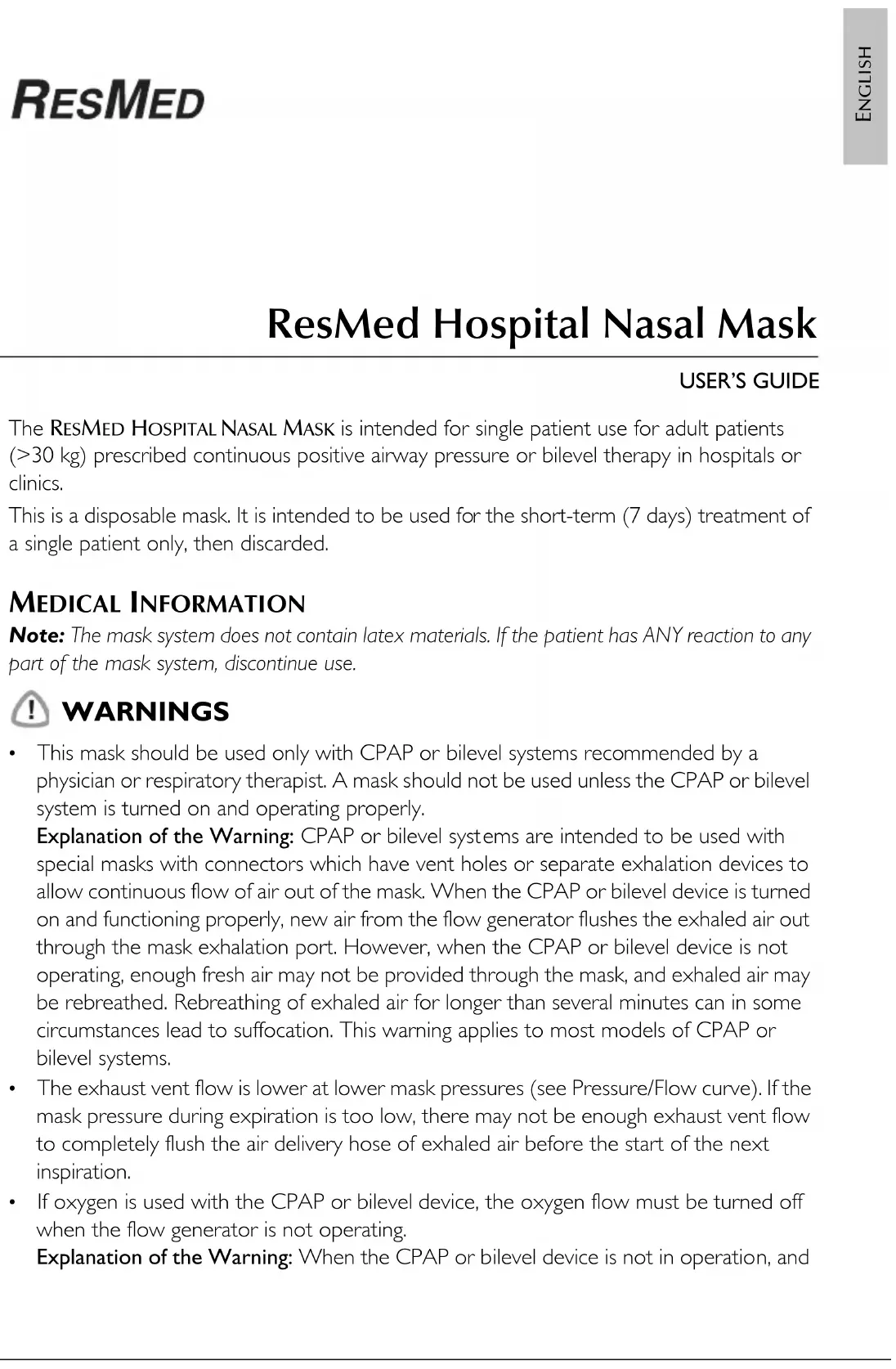 Hospital Nasal Mask - Non catégorisé ResMed - Notice d'utilisation et mode d'emploi gratuit