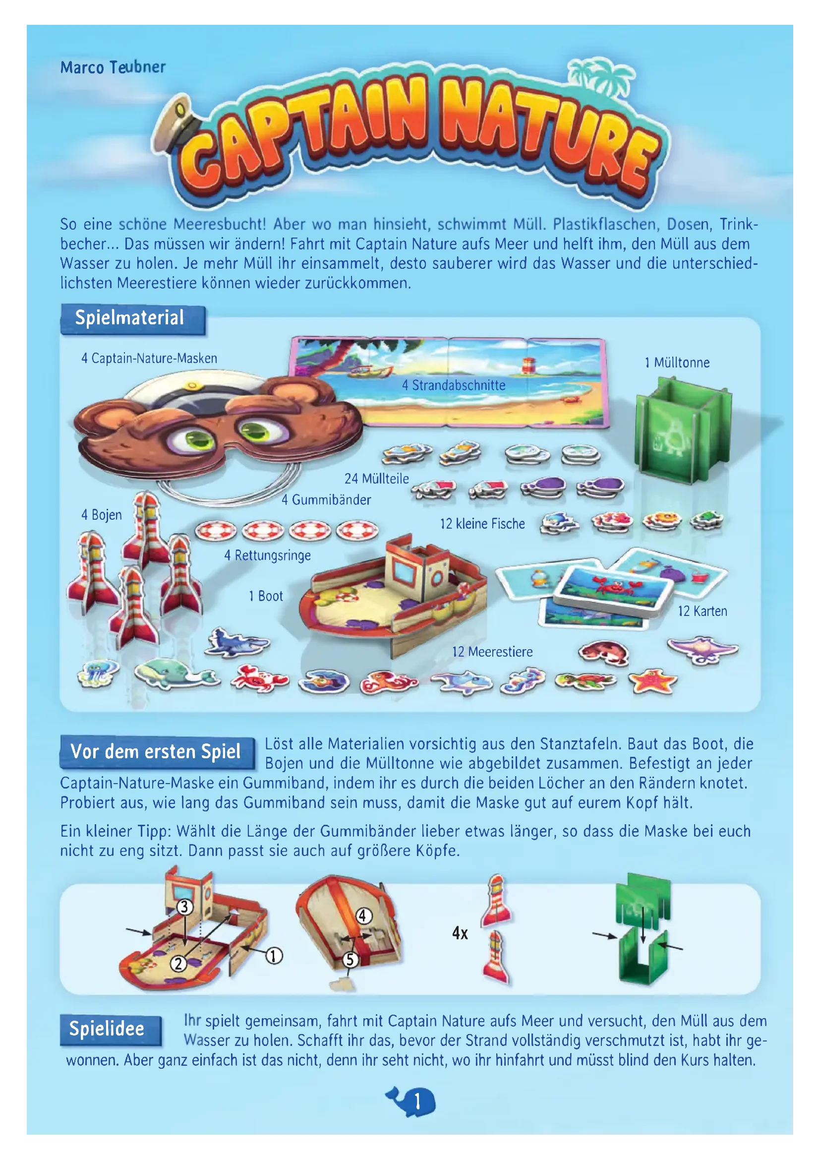 Marco Teubner Séparez délicatement tous les éléments prédécoupés des planches cartonnées. Assemblez le bateau, les bouées et la poubelle comme sur l’illustration. Fixez un élastique sur chaque masque Captain Nature : glissez l’élastique à travers les deux trous situés sur les bords du masque puis faites des noeuds. Choisissez la longueur de l’élastique pour que le masque tienne bien sur la tête. Conseil : mieux vaut que l’élastique soit un peu long pour éviter que le masque ne soit trop serré. De cette façon, le masque conviendra aussi bien aux petits qu’aux plus grands. Avant la première partie Vous jouez tous ensemble : partez en mer avec Captain Nature et essayez de ramasser les déchets dans l’eau. Si vous ramassez tous les déchets avant que la plage ne soit complètement polluée, vous avez gagné. Mais ce n’est pas si facile, car vous ne voyez pas où vous allez et devez maintenir le cap à l’aveugle. 1 poubelle12 animaux marins12 cartes4 bouées de sauvetage24 déchets12 petits poissons4 bouées1 bateau4 plateaux Plage4 masques Captain Nature Matériel Concept du jeu 4 élastiques
