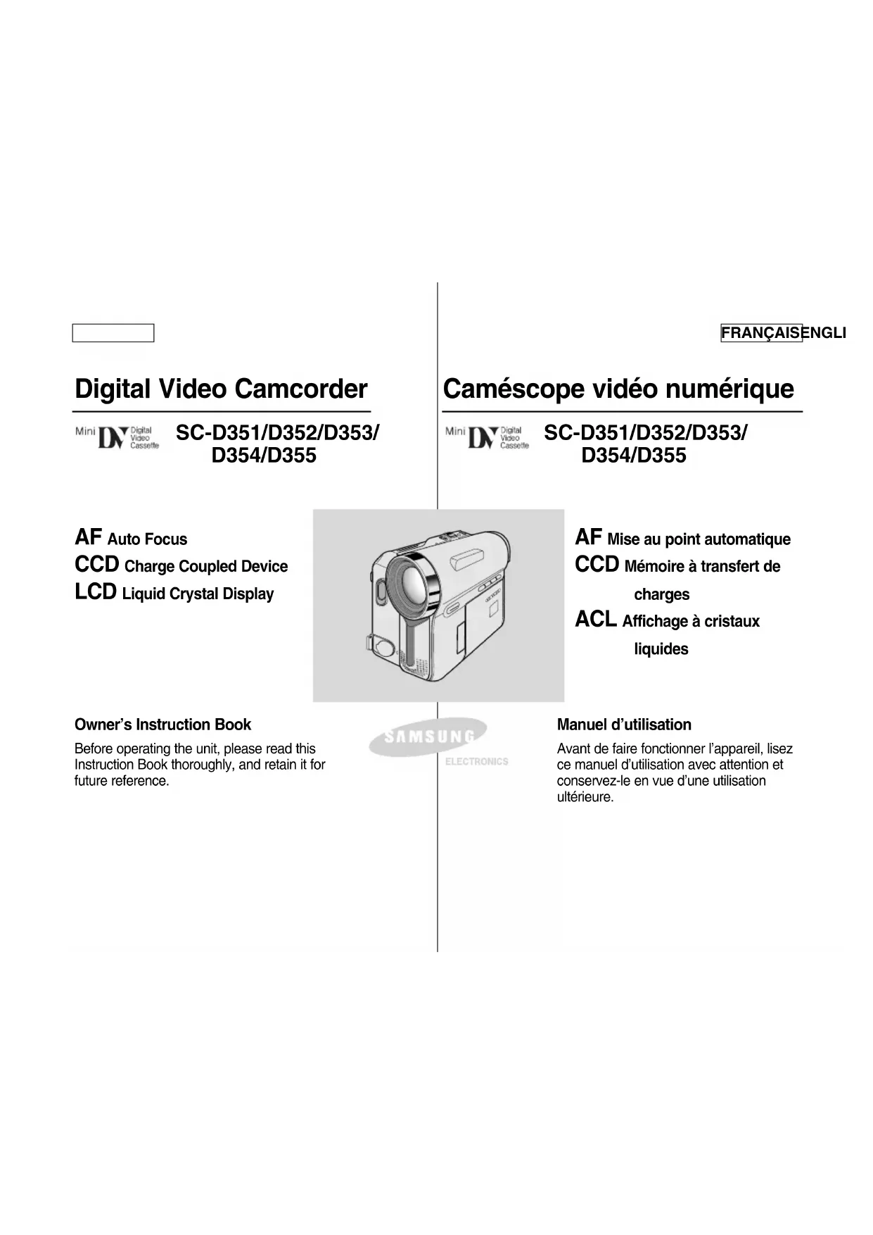 FRANÇAISENGLISH Digital Video Camcorder Owner’s Instruction Book Before operating the unit, please read thisInstruction Book thoroughly, and retain it forfuture reference. AF Auto Focus CCD Charge Coupled Device LCD Liquid Crystal Display SC-D351/D352/D353/ D354/D355 Caméscope vidéo numérique Manuel d’utilisation Avant de faire fonctionner l’appareil, lisezce manuel d’utilisation avec attention etconservez-le en vue d’une utilisationultérieure. AF Mise au point automatique CCD Mémoire à transfert de charges ACL Affichage à cristaux liquides SC-D351/D352/D353/