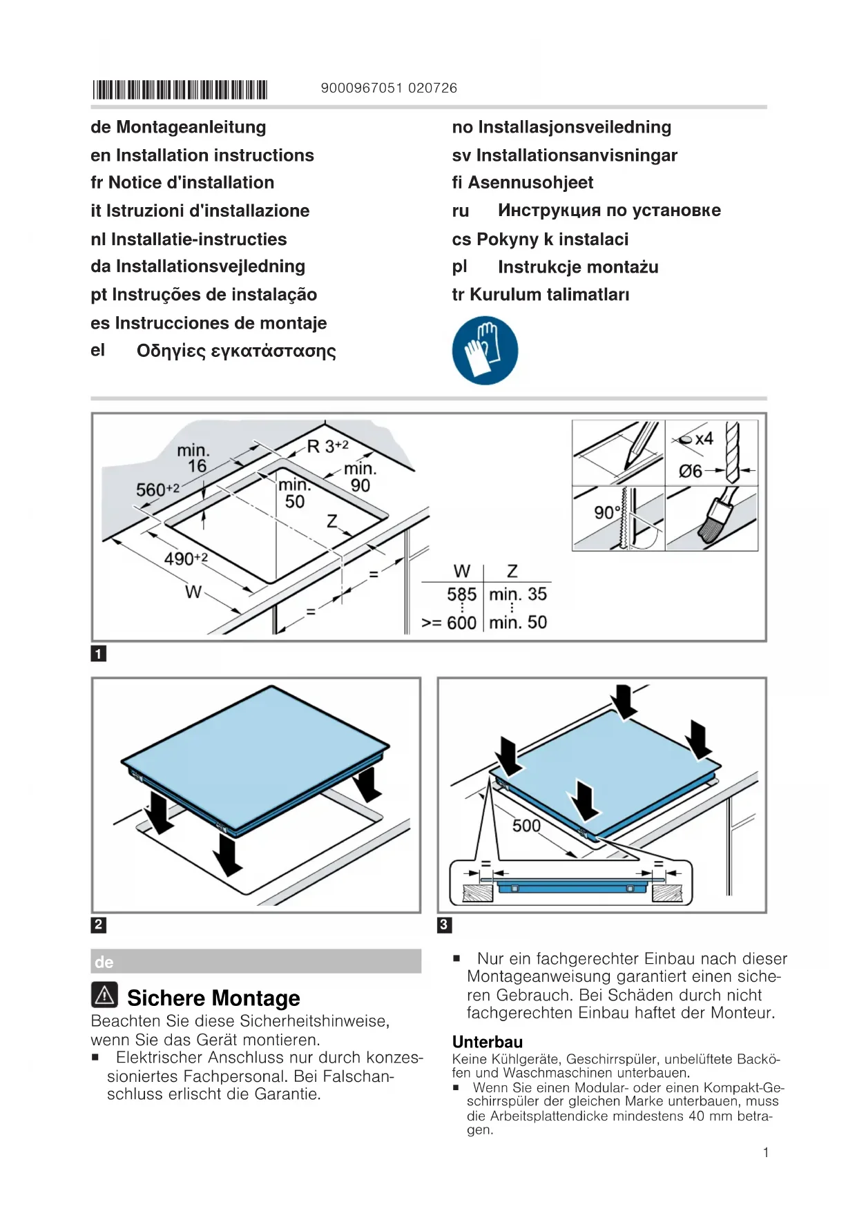 Installation en toute sécurité Respectez les consignes de sécurité lorsque vous installez cet appareil. ¡ Branchement électrique uniquement par un personnel qualifié agréé. Toute erreur de branchement annule la garantie. ¡ Seule une installation effectuée selon les présentes recommandations de montage garantit une utilisation en toute sécurité. L'installateur est responsable en cas de dommages dus à une installation incor- recte. Éléments installés en dessous N'installez aucun réfrigérateur, lave-vaisselle, four non ventilé ou lave-linge en-dessous. ¡ Si vous installez en-dessous un lave-vaisselle mo- dulaire ou compact de la même marque, l'épais- seur du plan de travail doit être d'au moins 40 mm. ¡ Si vous installez un four en-dessous, l'épaisseur du plan de travail doit être d'au moins 20mm, voire plus dans certains cas. Respectez les ins- tructions de montage du four. ¡ Veillez à ce que les parties saillantes, telles que le boîtier d’alimentation ou le câble d’alimentation, n’entrent pas en collision avec un tiroir, par exemple. Plancher intermédiaire Si le dessous de la table de cuisson peut être tou- ché, il est nécessaire de monter un plancher inter- médiaire. ¡ Des planchers intermédiaires sont en vente dans le commerce spécialisé comme accessoire. ¡ Si vous utilisez votre propre plancher intermé- diaire, la distance minimale par rapport à la prise secteur de l’appareil doit être de 10mm. Préparation du meuble Le plan de travail doit être plat, horizontal et stable. ¡ Les meubles d'encastrement, y compris les plinthes de finition murale, doivent résister à une chaleur d'au moins 90°C. ¡ Un revêtement de niche situé à moins de 50mm de la paroi arrière doit être incombustible (par ex. carrelages, pierre). ¡ Scellez les surfaces de coupe de manière à ce qu'elles résistent à la chaleur, afin d'éviter que l'humidité ne fasse gonfler le plan de travail.