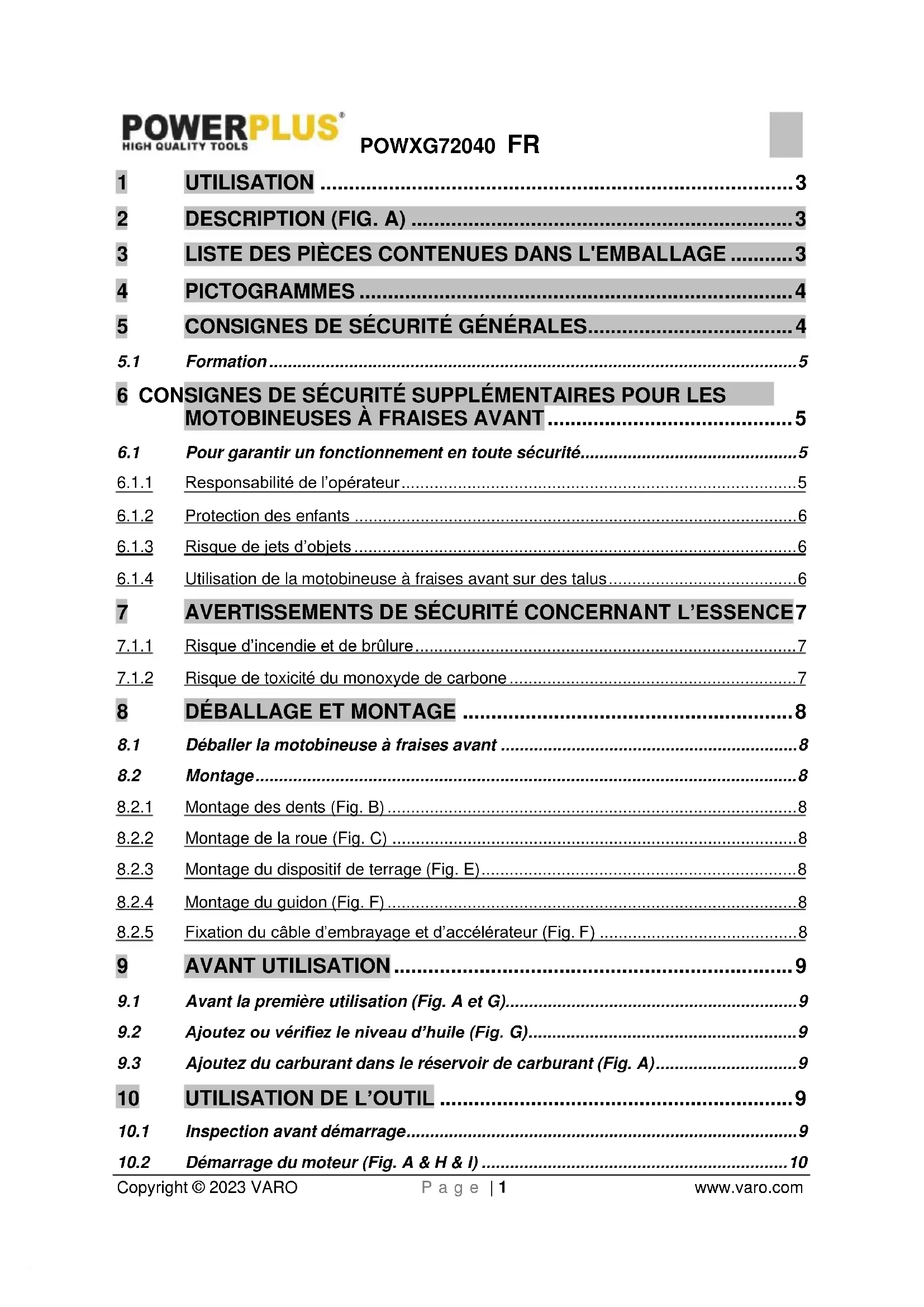- Entreposez la motobineuse à fraises avant dans un endroit propre et sec.POWXG72040 FR Copyright © 2023 VARO P a g e | 13 www.varo.com