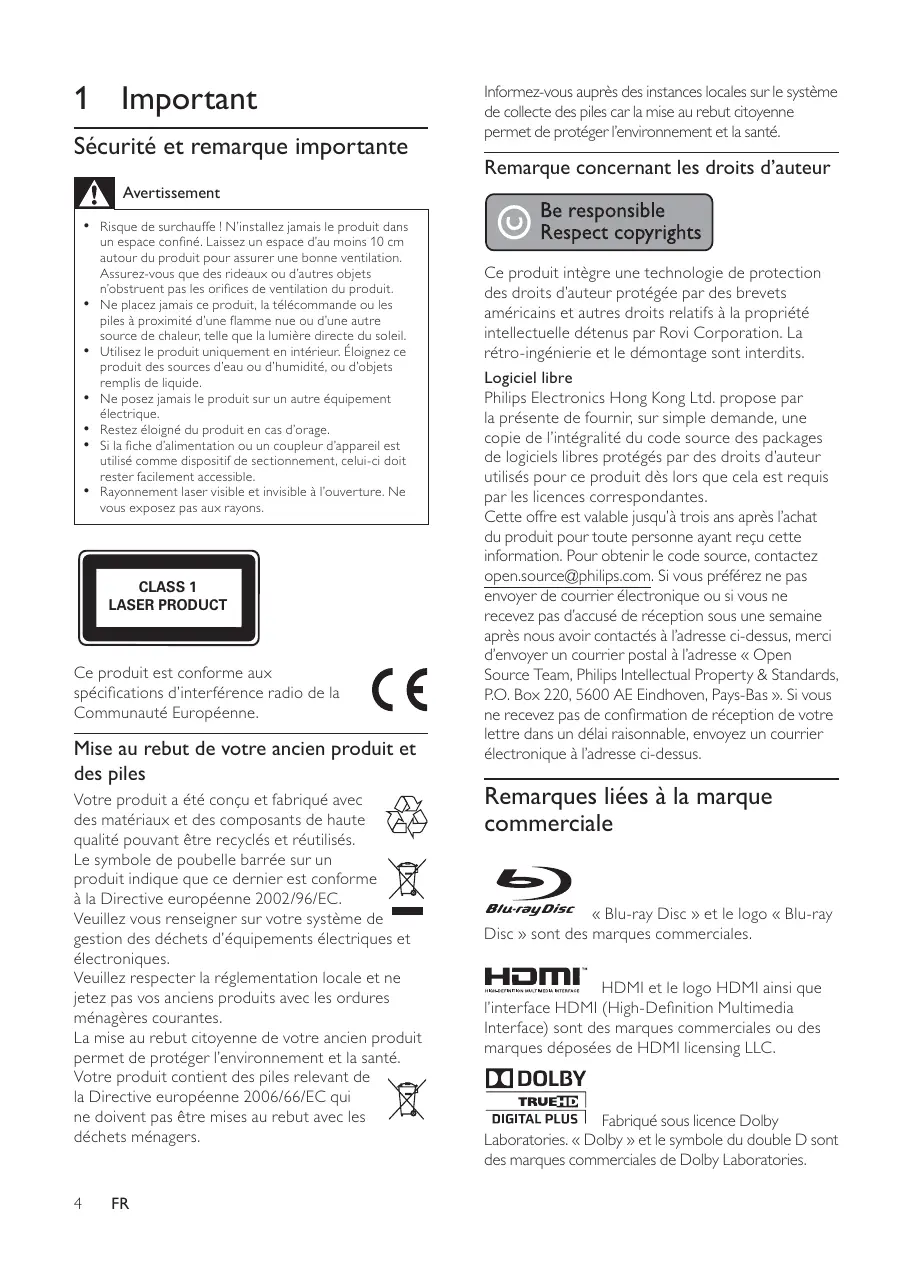 Ce produit intègre une technologie de protection des droits d’auteur protégée par des brevets américains et autres droits relatifs à la propriété intellectuelle détenus par Rovi Corporation. La rétro-ingénierie et le démontage sont interdits. Logiciel libre Philips Electronics Hong Kong Ltd. propose par la présente de fournir, sur simple demande, une copie de l’intégralité du code source des packages de logiciels libres protégés par des droits d’auteur utilisés pour ce produit dès lors que cela est requis par les licences correspondantes. Cette offre est valable jusqu’à trois ans après l’achat du produit pour toute personne ayant reçu cette information. Pour obtenir le code source, contactez open.source@philips.com. Si vous préférez ne pas envoyer de courrier électronique ou si vous ne recevez pas d’accusé de réception sous une semaine après nous avoir contactés à l’adresse ci-dessus, merci d’envoyer un courrier postal à l’adresse « Open Source Team, Philips Intellectual Property & Standards, P.O. Box 220, 5600 AE Eindhoven, Pays-Bas ». Si vous ne recevez pas de confirmation de réception de votre lettre dans un délai raisonnable, envoyez un courrier électronique à l’adresse ci-dessus. Remarques liées à la marque commerciale « Blu-ray Disc » et le logo « Blu-ray Disc » sont des marques commerciales. HDMI et le logo HDMI ainsi que l’interface HDMI (High-Definition Multimedia Interface) sont des marques commerciales ou des marques déposées de HDMI licensing LLC. Fabriqué sous licence Dolby Laboratories. « Dolby » et le symbole du double D sont des marques commerciales de Dolby Laboratories. À PROPOS DE LA VIDÉO DIVX : DivX® est un format vidéo numérique créé par DivX, Inc. Cet appareil DivX Certified officiel lit les vidéos au format DivX. Visitez le site www.divx. com pour obtenir de plus amples informations ainsi que des outils logiciels permettant de convertir vos fichiers en vidéos DivX. À PROPOS DE LA VIDÉO À LA DEMANDE DIVX : vous devez enregistrer cet appareil DivX Certified ® pour accéder aux contenus DivX VOD (Video-on-demand). Pour générer un code d’enregistrement, recherchez la section DivX VOD dans le menu de configuration de l’appareil. Rendez-vous sur le site vod.divx.com muni de ce code pour procéder à l’enregistrement et obtenir plus de renseignements sur la DivX VOD. DivX® et DivX Ultra® sont des marques déposées de DivX, Inc. et sont utilisées sous licence. F ra n ça i s Fabriqué sous licence aux États-Unis. N° de brevet : 5 451 942, 5 956 674, 5 974 380, 5 978 762, 6 226 616, 6 487 535, 7 392 195, 7 272 567, 7 333 929, 7 212 872 et autres brevets américains et internationaux approuvés ou en attente. DTS est une marque déposée et les logos DTS, le symbole DTS, DTS-HD et HTS-HD Master Audio sont des marques commerciales de DTS, Inc. © 1996-2008 DTS, Inc. Tous droits réservés. « DVD Video » est une marque déposée de DVD Format/Logo Licensing Corporation. Java, ainsi que tout autre logo et toute autre marque Java sont des marques commerciales ou des marques déposées de Sun Microsystems, Inc. aux États-Unis et/ou dans d’autres pays. Windows Media et le logo Windows sont des marques commerciales, déposées ou non, de Microsoft Corporation aux États-Unis et/ou dans d’autres pays 2 Votre produit Félicitations pour votre achat et bienvenue chez Philips ! Pour profiter pleinement de l’assistance offerte par Philips (comme les mises à niveau logicielles de produits), enregistrez votre produit à l’adresse suivante : www.philips.com/welcome. Si vous contactez Philips, vous devrez préciser les numéros de modèle et de série de votre produit. Les numéros de série et de modèle sont indiqués à l’arrière de votre produit. Notez ces numéros ici : N° de modèle __________________________ BONUSVIEW™ « BD LIVE » et « BONUSVIEW » sont des marques commerciales de Blu-ray Disc Association. « AVCHD » et le logo « AVCHD » sont des marques commerciales de Matsushita Electric Industrial Co., Ltd et Sony Corporation. « x.v.Colour » est une marque commerciale de Sony Corporation. Les logos USB-IF sont des marques d’Universal Serial Bus Implementers Forum, inc. N° de série ___________________________ Caractéristiques Pour des performances optimales de ce produit, il est recommandé de mettre à jour régulièrement son logiciel. Le divertissement en haute définition Profitez de disques en haute définition sur HDTV (téléviseur haute définition) en le raccordant à l’aide d’un câble HDMI haute vitesse (1.3 ou catégorie 2). Vous bénéficierez d’une excellente qualité d’image : résolution maximale de 1080p et fréquence de 24 images par seconde avec une sortie en balayage progressif. BD-Live Connectez votre lecteur aux sites Web des studios de cinéma par le port LAN pour accéder à de nombreux contenus récents (par ex. : exclusivités et avant-premières),
