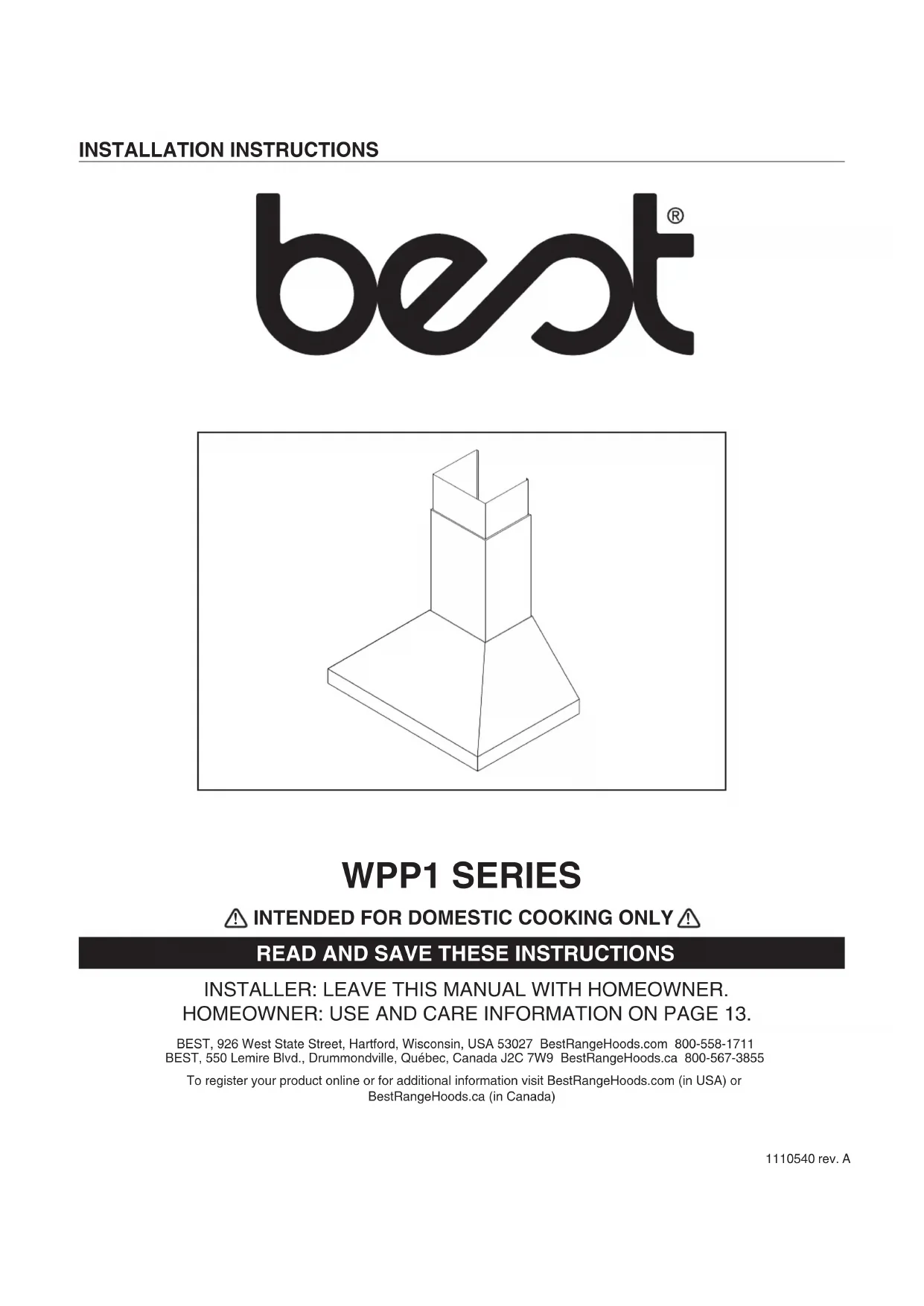 se réservent le droit de modifier les prix, les couleurs, les composants, les produits, les spécifications et les modèles, de déplacer le lieu de fabrication et de cesser la production d’un modèle ou d’un produit, et ce, en tout temps et sans préavis. BEST, 926 West State Street, Hartford, Wisconsin, USA 53207 BestRangeHood.com 800 558-1711 BEST, 550 Boul. Lemire, Drummondville, Québec, Canada J2C 7W9 BestRangeHoods.ca 800 567-3855SERIE WPP1