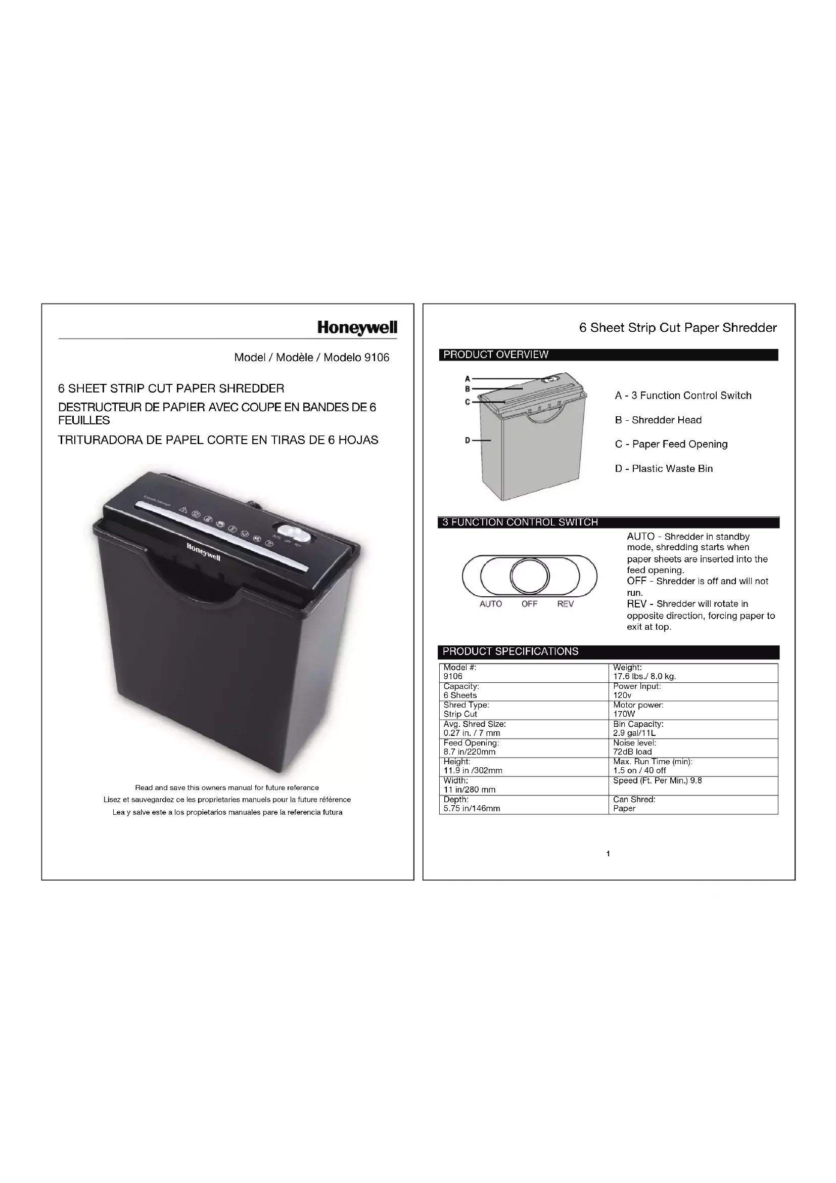 9106 - Destructeur de document HONEYWELL - Notice d'utilisation et mode d'emploi gratuit