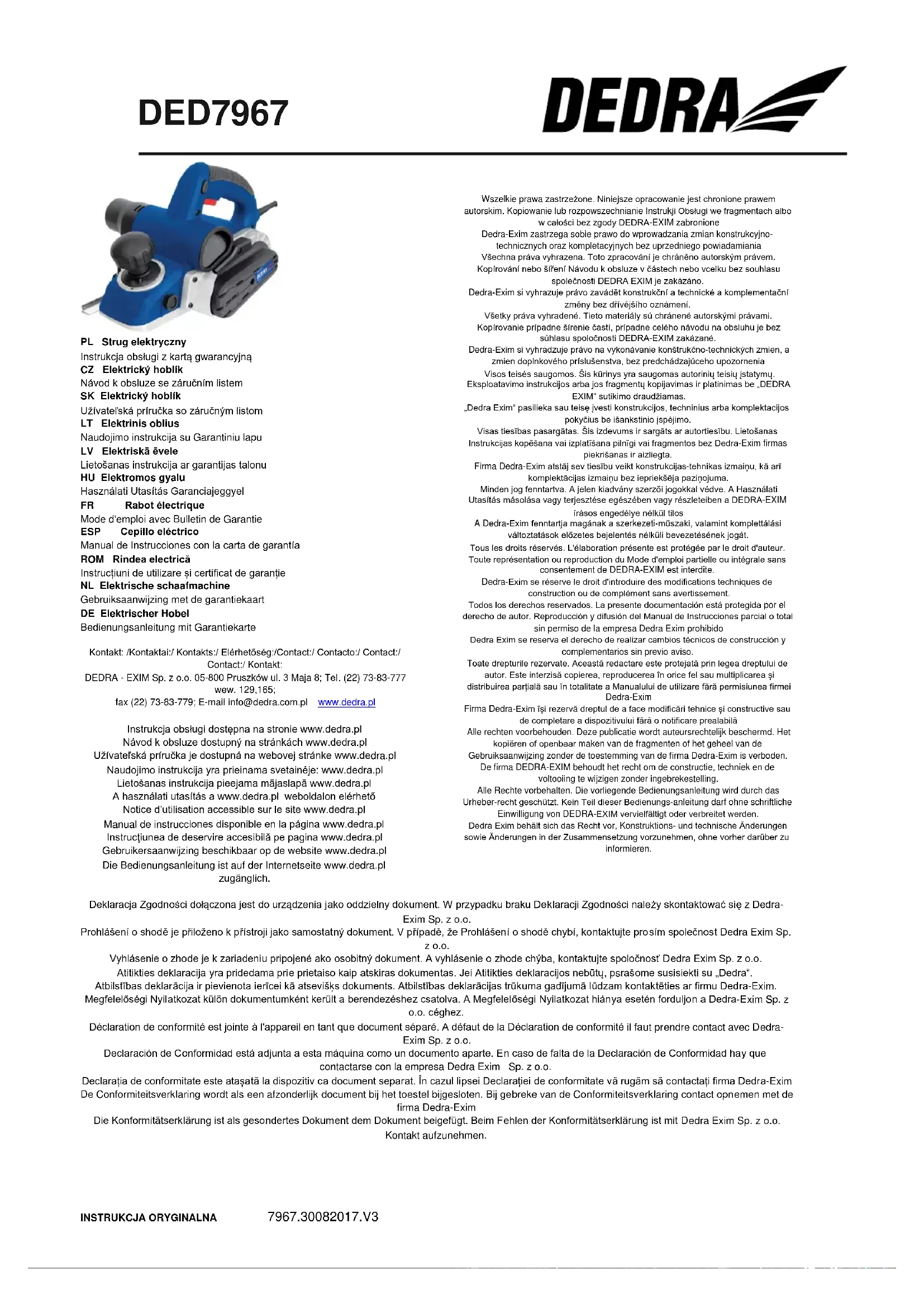 conditions techniques et d'utilisation décrites dans le Mode d'Emploi. Nous garantissons la marchandise pour 24 mois à compter de la date de l'achat inscrite dans le document présent. La garantie est valable sur tout le territoire de la République de Pologne et UE. Les adresses de services des pays particuliers sont disponibles sur la page www.dedra.pl. A défaut de service dans le pays donné, les obligations du garant sont réalisées par le service central. La réclamation devrait être déposée à l'écrit pendant la période de garantie