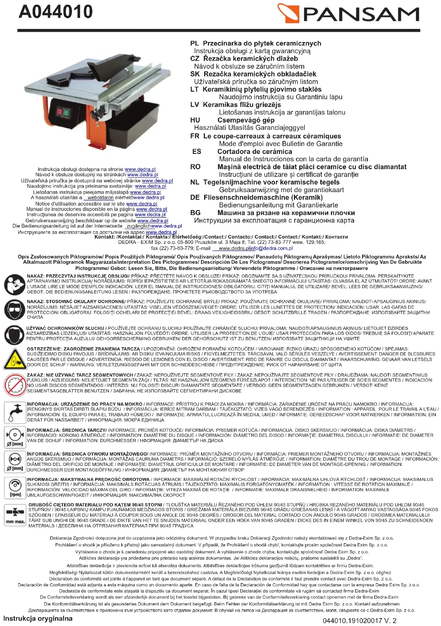 Support de la protection 6. Vis M5 x 30 7. Support de la glissière 8. Glissière9. Vis de serrage de la glissière 10.Protection inférieure11.Bride intérieure de la scie 12. Scie circulaire diamentée13. Bride extérieure de la scie 14. Ecrou de fixation M12x1,5 15. Protection extérieure 16. Rondelle 4 mm17. Vis M4 x 10 18. Réservoir d'eau19. Corps 20. Vis de serrage21. Vis 22. Contacteur avec joint d'étanchéité Traduction du mode d’emploi original Índice1. Fotos y planos2, Informaciones sobre el uso de este manual 3. Uso previsto de la máquina4. Restricciones del uso5. Datos técnicos6. Preparación para el trabajo7. Conexión a la red8. Puesta en marcha de la máquina9. Uso de la máquina10. Los servicios diarios11. Auto reparaciones 12. Complementación de la máquina, observaciones finales13. Indice de las partes para el dibujo de ensamble14. Carta de garantíaDeclaración de Conformidad - documento aparteInstrucción de seguridad de trabajo - folleto adjunto a la máquinaATENCIONDurante el funcionamiento de la máquina se recomienda respetar las reglas básicas de la seguridad de trabajo con el fin de evitar incendios, electrocución o daños mecánicos.Antes de utilizar la máquina, lea el Manual de Instrucciones. Pedimos guardar el Manual de Instrucciones, Instrucciones de Seguridad de Trabajo y Declaración de Conformidad.Rigurosa adhesión a las indicaciones y recomendaciones que figuran en el Manual de Instrucciones influirán en la prolongación de la vida de su máquina.Durante el trabajo se debe respetar rigurosamente las indicaciones presentadas en la Instrucción de la Seguridad de Trabajo Instrucción de Seguridad de Trabajo está adjunta a la máquina como un folleto aparte y hay que guardarla. En caso de transferir la máquina a otra persona, por favor entregarle también el Manual de Instrucciones, la Instrucción de Seguridad de Trabajo y la Declaración de Conformidad. Empresa Dedra Exim Sp. z o.o. no se hace responsable de los accidentes ocasionados por no respetar las indicaciones de seguridad de trabajo.Hay que leer atentamente todas las instrucciones de seguridad y instrucciones de uso. El incumplimiento de las advertencias e instrucciones puede provocar descargas eléctricas, incendios y / o lesiones graves.Mantenga todas las instrucciones, las instrucciones de seguridad y la declaración de conformidad para las necesidades futuras.2. Informaciones sobre el uso de este manualTodos los derechos reservados. La presente documentación está protegida por el derecho de autor. Reproducción y difusión del Manual de Instrucciones parcial o total sin permiso de la empresa Dedra Exim prohibidoDedra Exim se reserva el derecho de realizar cambios técnicos de construcción y complementarios sin previo aviso 3. Uso previsto de la maquinaLa cortadora con el disco de diamante es un producto tecnológicamente avanzado diseñado para el corte de pequeñas y medianas cerámicas de revestimiento (pared y suelo) Se implementó aquí el sistema de procesamiento húmedo con el uso de agua. Gracias a eso durante el trabajo se ha eliminado la presencia del polvo. Máquina permite realizar las operaciones básicas del corte de cerámicas (cortes de tira, cortes a lo largo de la diagonal y el biselado), que están descritas en la parte posterior de este manual.4. Restricciones del usoLa cortadora de cerámicas puede ser utilizada únicamente de acuerdoa las "Permitidas condiciones de trabajo" que se encuentran detallados abajo (ver los datos técnicos), y con los discos descritos en el punto 12 del manual. En el diseño y la construcción de la cortadora no se previó el uso de la máquina a los fines profesionales / comerciales. La cortadora está prevista para el bricolaje y el uso doméstico.No está permitido el uso de los discos destinados al corte de otros materiales (metales, madera, placas de yeso laminado, etc.) Está prohibido también cortar otros materiales, que no son las cerámicas. Los cambios no autorizados en la construcción mecánica y eléctrica, todo tipo de modificaciones, los servicios que no están descritos en el Manual de Instrucciones serán tratados como ilegales y causarán la perdida inmediata de los Derechos de Garantía, y la Declaración de Conformidad pierde su validez. El uso inapropiado o que no estéde acuerdo con el Manual de Instrucciones anulará inmediatamente los Derechos de Garantía e invalidará la Declaración de Conformidad.