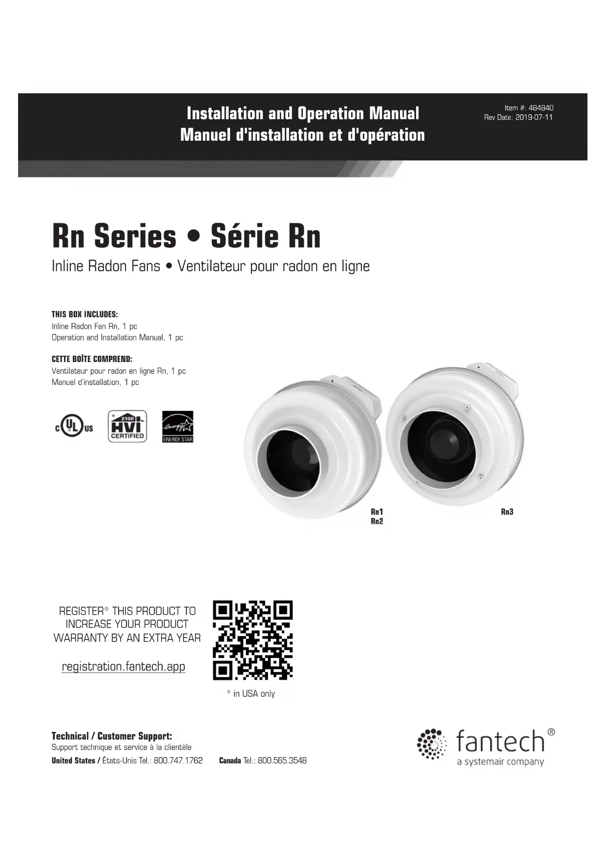 Technical / Customer Support: Support technique et service à la clientèle United States / États-Unis Tel.: 800.747.1762 Canada Tel.: 800.565.3548 Installation and Operation Manual Manuel d'installation et d'opération Item #: 484840Rev Date: 2019-07-11 Rn Series • Série Rn Inline Radon Fans • Ventilateur pour radon en ligne THIS BOX INCLUDES:Inline Radon Fan Rn, 1 pcOperation and Installation Manual, 1 pc CETTE BOÎTE COMPREND:Ventilateur pour radon en ligne Rn, 1 pcManuel d'installation, 1 pc registration.fantech.app
