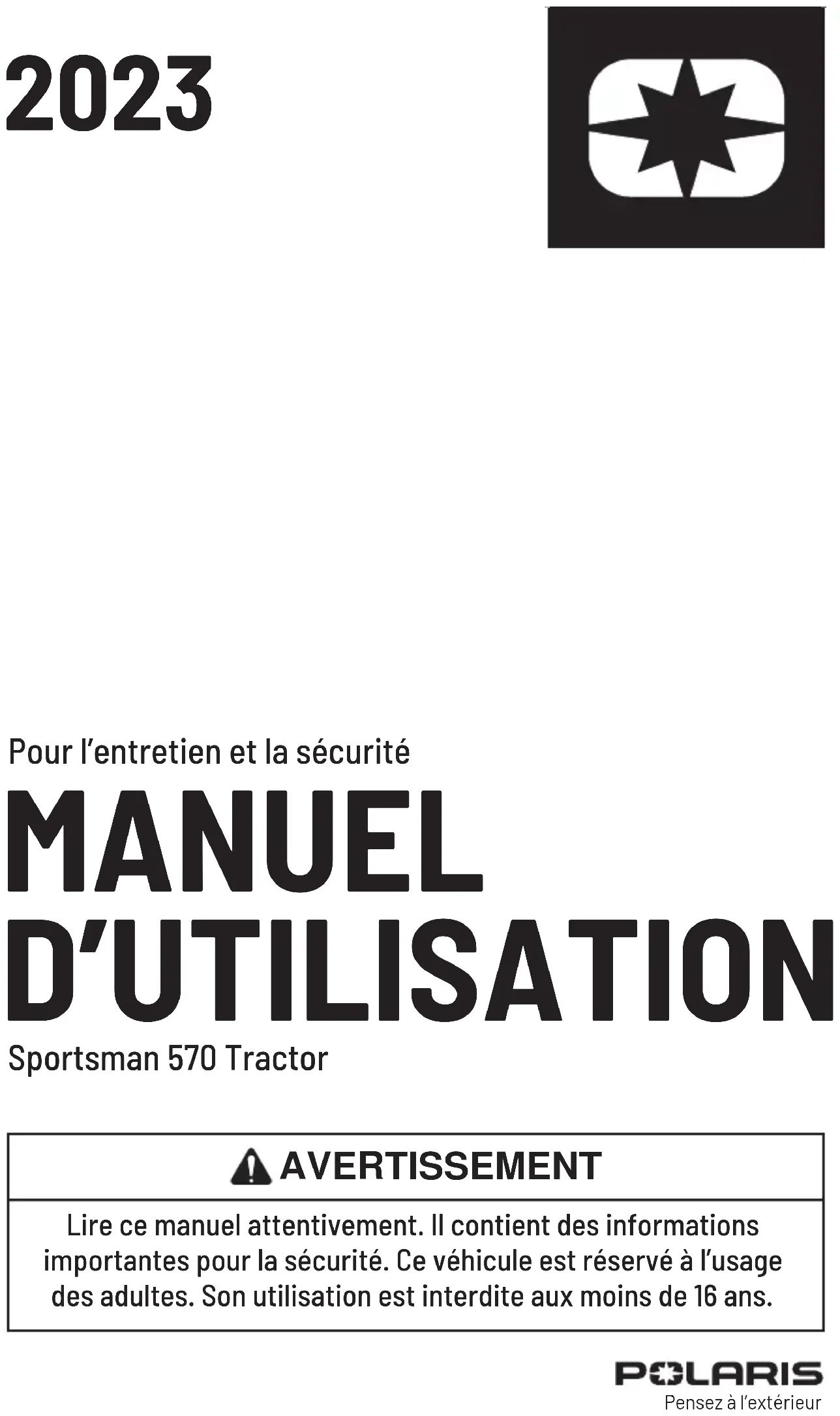 MANUEL D’UTILISATION Sportsman 570 Tractor Pour l’entretien et la sécurité AVERTISSEMENT Lire ce manuel attentivement. Il contient des informations importantes pour la sécurité. Ce véhicule est réservé à l’usage des adultes. Son utilisation est interdite aux moins de 16 ans. Pensez à l’extérieur! AVERTISSEMENT Lire, bien comprendre et suivre toutes les directives et les consignes de sécurité dans le présent manuel et sur toutes les étiquettes apposées sur le produit. Le non-respect des consignes de sécurité peut entraîner des blessures graves ou la mort. Pour des vidéos et plus d’informations sur une expérience de conduite sûre avec le véhicule Polaris, scanner ce code QR® avec un smartphone. Ou consulter www.polaris.com/en-us/safety/ .Manuel d’utilisation du Tractor 2023 Sportsman 570 Sportsman 570 EPSLoctite
