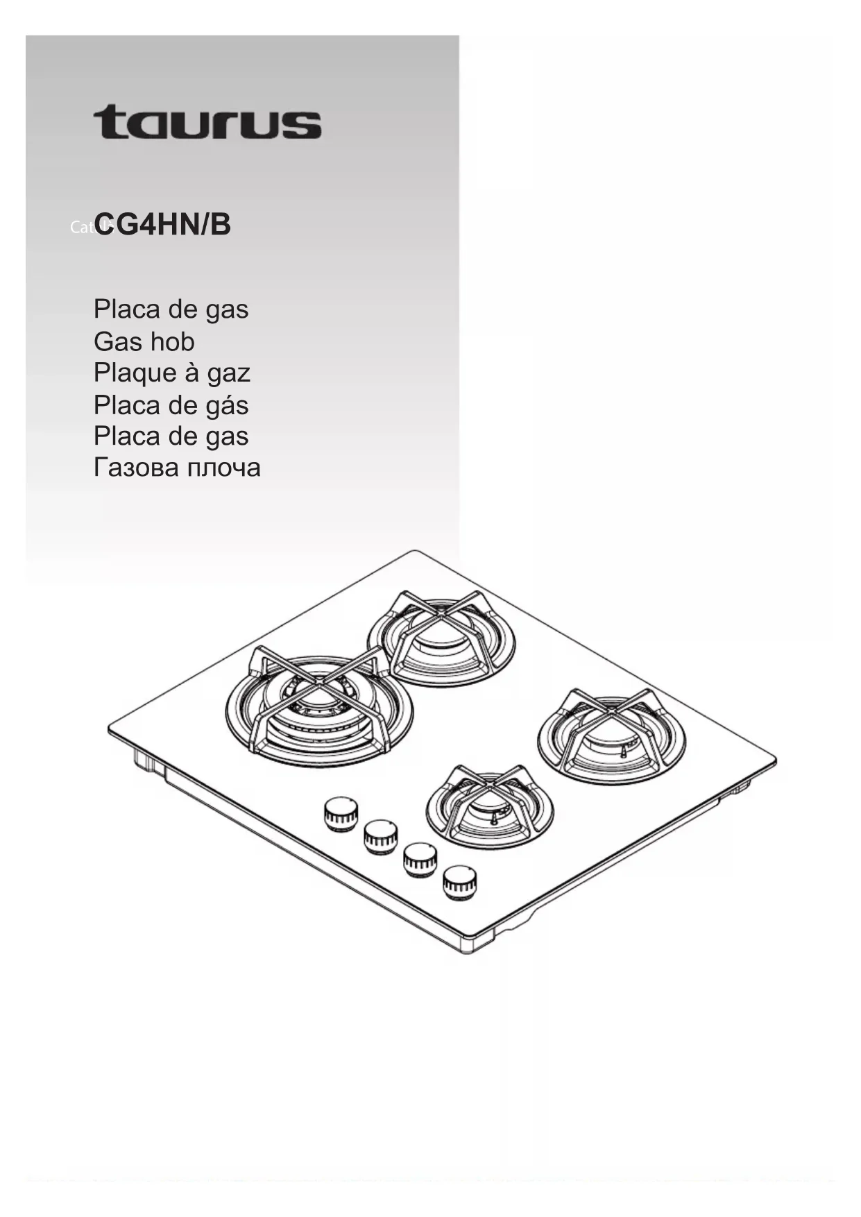 CG4HN/B Cher Client, Nous vous remercions d’avoir acheté un produit Taurus. Sa technologie, son design et sa fonctionnalité, outre sa parfaite conformité aux normes de qualité les plus strictes, vous permettront de tirer une totale satisfaction ainsi qu’une grande durée de vie du produit. CONSEILS DE SÉCURITÉ ET AVERTISSEMENTS : Lire attentivement ce manuel d'instructions avant d'installer et d'utiliser l'appareil. Le conserver dans un endroit accessible. Le non-respect de ces instructions pourrait causer un accident. Les images figurant dans ce manuel sont fournies à pur titre indicatif. Le fabricant est exonéré de toute responsabilité en cas de dommages causés par une mauvaise utilisation de l'appareil, une mauvaise installation ou le non-respect des instructions figurant dans ce manuel. Cet appareil n'a pas été certifié pour une utilisation dans des pays autres que ceux indiqués sur l'appareil. L'appareil doit être installé conformément aux réglementations en vigueur et utilisé dans des zones bien ventilées. Utiliser l'appareil dans des zones bien ventilées. Ne pas connecter l'appareil à un extracteur. Les opérations d'installation, de raccordement, de réglage et de conversion à un autre type de gaz doivent être effectuées par un technicien d'installation agréé, dans les respect des normes, réglementations et spécifications des fournisseurs de gaz et d'électricité locaux. Une attention particulière doit être accordée aux normes de ventilation. Cet appareil est uniquement destiné à un usage domestique et non professionnel ou industriel. Ne pas installer l'appareil sur des yachts ou dans des caravanes. Avant de procéder à l'installation, s’assurer que l'alimentation en gaz et en électricité corresponde à celle indiquée sur la plaque signalétique. Contacter le service d'assistance technique pour passer à un autre type de gaz. Cet appareil doit être monté par un installateur qualifié. Cet appareil est de type classe 3, conformément à la norme EN 30-1-1 pour les appareils à gaz et encastrables. Toute utilisation incorrecte ou contraire aux instructions d'utilisation peut entraîner un danger, annulant ainsi la garantie et la responsabilité du fabricant. INDICATIONS DE SÉCURITÉ : Ne pas utiliser de programmateur, minuterie ou autre appareil de connexion automatique de l'appareil. Cet appareil ne doit pas être utilisé par des enfants. Cet appareil peut être utilisé par des personnes dont les capacités physiques, sensorielles ou mentales sont réduites ou des personnes dénuées d’expérience concernant son utilisation, et ce, sous surveillance ou après avoir reçu les instructions pour un maniement sûr de l’appareil et ayant compris les risques possibles. Cet appareil n’est pas un jouet. Les enfants doivent rester sous surveillance afin de s’assurer qu’ils ne jouent pas avec l’appareil. Le nettoyage et l’entretien de l’appareil ne doivent pas être réalisés par des enfants. Ne pas laisser les enfants jouer à proximité ou avec l'appareil. L'appareil chauffe lorsqu'il fonctionne. Éloigner les enfants jusqu'à ce qu'il ait refroidi. Les enfants peuvent également se blesser en touchant les casseroles ou les poêles dans la cuisine. Utiliser l'appareil exclusivement pour cuisiner. Ne pas utiliser l'appareil s'il entre en contact avec de l'eau. Ne pas manipuler l'appareil avec les mains mouillées. La surface de chauffage et de cuisson de l'appareil chauffe lorsqu'il fonctionne, il est donc important de prendre les précautions nécessaires. Ne pas porter de vêtements amples, de torchons ou similaires, car ils pourraient atteindre les flammes et prendre feu. Ne jamais laisser l'appareil sans surveillance pendant la cuisson. Ne pas utiliser de récipients déformés car ils pourraient basculer et provoquer un accident. Ne pas utiliser ni stocker de matériaux inflammables dans des tiroirs à proximité de cet appareil. Les aliments périssables, les articles en plastique et les produits en spray peuvent être affectés par la chaleur; Ne pas les ranger sur ou sous l'appareil. Ne pas utiliser de produit en spray à proximité de l'appareil pendant son fonctionnement. S’assurer que les commandes sont en position « OFF » lorsqu'elles ne sont pas utilisées. Ne pas utiliser de produits de nettoyage abrasifs ou caustiques. Cet appareil ne doit être réparé que par du personnel qualifié ou en faisant appel à un service d'assistance technique agréé, et utiliser des pièces de rechange d'origine. Avant de nettoyer l'appareil, le laisser refroidir. Ne pas utiliser de pistolets à vapeur ou autre nettoyeur haute pression. Avant de retirer les récipients, éteindre le brûleur. Utiliser des maniques ou des gants de cuisine lors de la manipulation de casseroles et poêles chaudes. Empêcher les flammes d'atteindre les poignées lorsque vous retirez les conteneurs du feu. Ne pas utiliser de poignées ou de gants mouillés ou humides sachant que la chaleur peut être transférée plus rapidement, avec le risque de brûlures qui en résulte. Allumer les brûleurs après avoir placé des casseroles et des poêles dessus. Ne pas faire chauffer de casseroles ou de poêles vides. Ne jamais utiliser de plaques en plastique ou de papier d'aluminium sur l'appareil. En cas d’utilisation d'autres appareils électriques, s’assurer que les fils n'entrent pas en contact avec des surfaces chaudes. Pour minimiser les risques de brûlures, d'allumage de matériaux inflammables et de déversements, faire pivoter les poignées des conteneurs sur le côté ou au centre de la plaque sans passer au-dessus des brûleurs adjacents. Garder les aliments frits à feu vif sous contrôle. Toujours faire chauffer l'huile à feu doux et ne pas la laisser sans surveillance. Les aliments à frire doivent être aussi secs que possible. Les aliments congelés ou l'humidité des aliments frais peuvent faire éclabousser la graisse chaude de