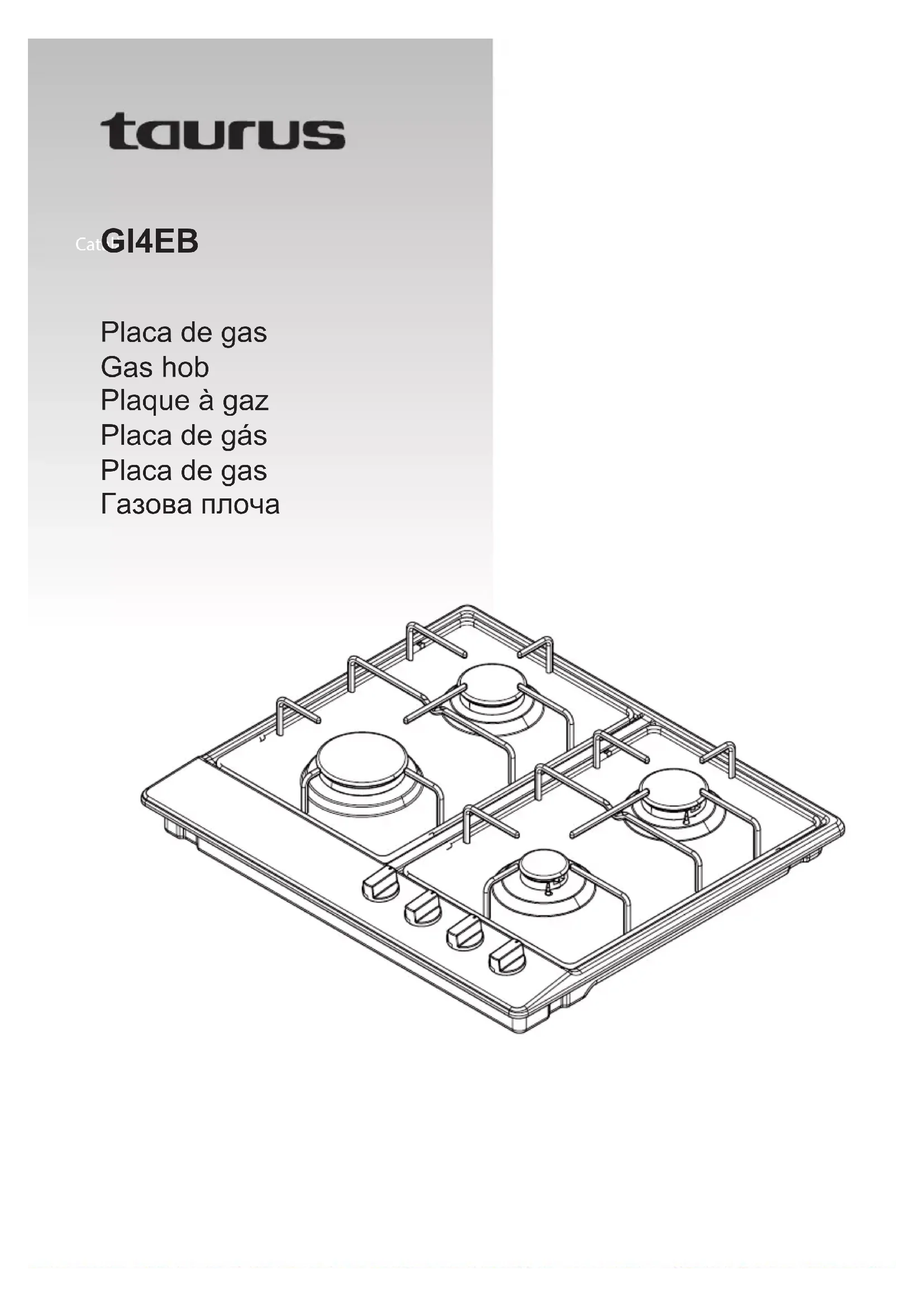 GI4EB Cher Client, Nous vous remercions d’avoir acheté un produit Taurus. Sa technologie, son design et sa fonctionnalité, outre sa parfaite conformité aux normes de qualité les plus strictes, vous permettront de tirer une totale satisfaction ainsi qu’une grande durée de vie du produit. CONSEILS DE SÉCURITÉ ET AVERTISSEMENTS : Lire attentivement ce manuel d'instructions avant d'installer et d'utiliser l'appareil. Le conserver dans un endroit accessible. Le non-respect de ces instructions pourrait causer un accident. Les images figurant dans ce manuel sont fournies à pur titre indicatif. Le fabricant est exonéré de toute responsabilité en cas de dommages causés par une mauvaise utilisation de l'appareil, une mauvaise installation ou le non-respect des instructions figurant dans ce manuel. Cet appareil n'a pas été certifié pour une utilisation dans des pays autres que ceux indiqués sur l'appareil. L'appareil doit être installé conformément aux réglementations en vigueur et utilisé dans des zones bien ventilées. Utiliser l'appareil dans des zones bien ventilées. Ne pas connecter l'appareil à un extracteur. Les opérations d'installation, de raccordement, de réglage et de conversion à un autre type de gaz doivent être effectuées par un technicien d'installation agréé, dans les respect des normes, réglementations et spécifications des fournisseurs de gaz et d'électricité locaux. Une attention particulière doit être accordée aux normes de ventilation. Cet appareil est uniquement destiné à un usage domestique et non professionnel ou industriel. Ne pas installer l'appareil sur des yachts ou dans des caravanes. Avant de procéder à l'installation, s’assurer que l'alimentation en gaz et en électricité corresponde à celle indiquée sur la plaque signalétique. Contacter le service d'assistance technique pour passer à un autre type de gaz. Cet appareil doit être monté par un installateur qualifié. Cet appareil est de type classe 3, conformément à la norme EN 30-1-1 pour les appareils à gaz et encastrables. Toute utilisation incorrecte ou contraire aux instructions d'utilisation peut entraîner un danger, annulant ainsi la garantie et la responsabilité du fabricant. INDICATIONS DE SÉCURITÉ : Ne pas utiliser de programmateur, minuterie ou autre appareil de connexion automatique de l'appareil. Cet appareil ne doit pas être utilisé par des enfants. Cet appareil peut être utilisé par des personnes dont les capacités physiques, sensorielles ou mentales sont réduites ou des personnes dénuées d’expérience concernant son utilisation, et ce, sous surveillance ou après avoir reçu les instructions pour un maniement sûr de l’appareil et ayant compris les risques possibles. Cet appareil n’est pas un jouet. Les enfants doivent rester sous surveillance afin de s’assurer qu’ils ne jouent pas avec l’appareil. Le nettoyage et l’entretien de l’appareil ne doivent pas être réalisés par des enfants. Ne pas laisser les enfants jouer à proximité ou avec l'appareil. L'appareil chauffe lorsqu'il fonctionne. Éloigner les enfants jusqu'à ce qu'il ait refroidi. Les enfants peuvent également se blesser en touchant les casseroles ou les poêles dans la cuisine. Utiliser l'appareil exclusivement pour cuisiner. Ne pas utiliser l'appareil s'il entre en contact avec de l'eau. Ne pas manipuler l'appareil avec les mains mouillées. La surface de chauffage et de cuisson de l'appareil chauffe lorsqu'il fonctionne, il est donc important de prendre les précautions nécessaires. Ne pas porter de vêtements amples, de torchons ou similaires, car ils pourraient atteindre les flammes et prendre feu. Ne jamais laisser l'appareil sans surveillance pendant la cuisson. Ne pas utiliser de récipients déformés car ils pourraient basculer et provoquer un accident. Ne pas utiliser ni stocker de matériaux inflammables dans des tiroirs à proximité de cet appareil. Les aliments périssables, les articles en plastique et les produits en spray peuvent être affectés par la chaleur; Ne pas les ranger sur ou sous l'appareil. Ne pas utiliser de produit en spray à proximité de l'appareil pendant son fonctionnement. S’assurer que les commandes sont en position « OFF » lorsqu'elles ne sont pas utilisées. Ne pas utiliser de produits de nettoyage abrasifs ou caustiques. Cet appareil ne doit être réparé que par du personnel qualifié ou en faisant appel à un service d'assistance technique agréé, et utiliser des pièces de rechange d'origine. Avant de nettoyer l'appareil, le laisser refroidir. Ne pas utiliser de pistolets à vapeur ou autre nettoyeur haute pression. Avant de retirer les récipients, éteindre le brûleur. Utiliser des maniques ou des gants de cuisine lors de la manipulation de casseroles et poêles chaudes. Empêcher les flammes d'atteindre les poignées lorsque vous retirez les conteneurs du feu. Ne pas utiliser de poignées ou de gants mouillés ou humides sachant que la chaleur peut être transférée plus rapidement, avec le risque de brûlures qui en résulte. Allumer les brûleurs après avoir placé des casseroles et des poêles dessus. Ne pas faire chauffer de casseroles ou de poêles vides. Ne jamais utiliser de plaques en plastique ou de papier d'aluminium sur l'appareil. En cas d’utilisation d'autres appareils électriques, s’assurer que les fils n'entrent pas en contact avec des surfaces chaudes. Pour minimiser les risques de brûlures, d'allumage de matériaux inflammables et de déversements, faire pivoter les poignées des conteneurs sur le côté ou au centre de la plaque sans passer au-dessus des brûleurs adjacents. Garder les aliments frits à feu vif sous contrôle. Toujours faire chauffer l'huile à feu doux et ne pas la laisser sans surveillance. Les aliments à frire doivent être aussi secs que possible. Les aliments congelés ou l'humidité des aliments frais peuvent faire éclabousser la graisse chaude de l
