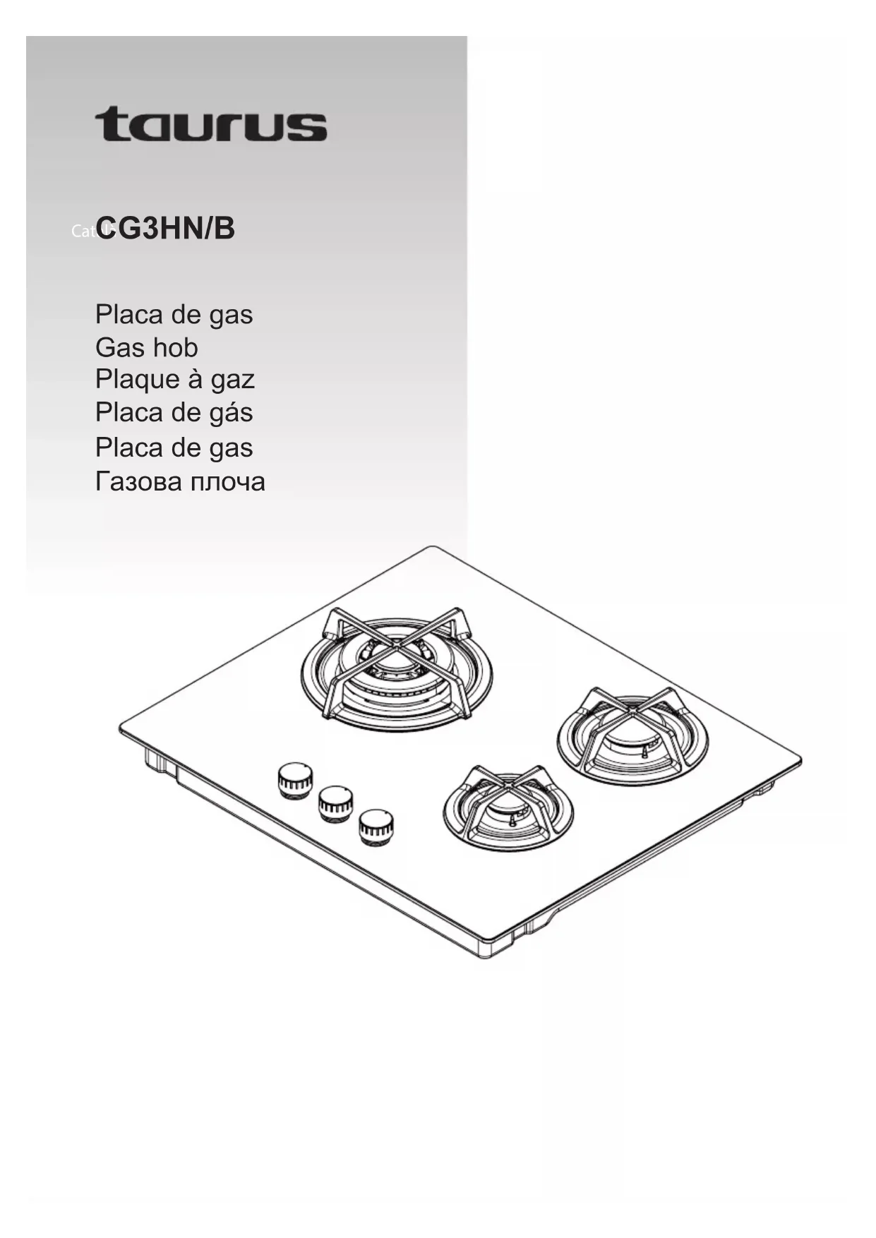 To establish compliance with the ecodesign requirements and for calculation of energy labelling parameters the appliance the European standard EN 30-2-1 is used as reference.Français CG3HN/B Cher Client, Nous vous remercions d’avoir acheté un produit Taurus. Sa technologie, son design et sa fonctionnalité, outre sa parfaite conformité aux normes de qualité les plus strictes, vous permettront de tirer une totale satisfaction ainsi qu’une grande durée de vie du produit. CONSEILS DE SÉCURITÉ ET AVERTISSEMENTS : Lire attentivement ce manuel d'instructions avant d'installer et d'utiliser l'appareil. Le conserver dans un endroit accessible. Le non-respect de ces instructions pourrait causer un accident. Les images figurant dans ce manuel sont fournies à pur titre indicatif. Le fabricant est exonéré de toute responsabilité en cas de dommages causés par une mauvaise utilisation de l'appareil, une mauvaise installation ou le non-respect des instructions figurant dans ce manuel. Cet appareil n'a pas été certifié pour une utilisation dans des pays autres que ceux indiqués sur l'appareil. L'appareil doit être installé conformément aux réglementations en vigueur et utilisé dans des zones bien ventilées. Utiliser l'appareil dans des zones bien ventilées. Ne pas connecter l'appareil à un extracteur. Les opérations d'installation, de raccordement, de réglage et de conversion à un autre type de gaz doivent être effectuées par un technicien d'installation agréé, dans les respect des normes, réglementations et spécifications des fournisseurs de gaz et d'électricité locaux. Une attention particulière doit être accordée aux normes de ventilation. Cet appareil est uniquement destiné à un usage domestique et non professionnel ou industriel. Ne pas installer l'appareil sur des yachts ou dans des caravanes. Avant de procéder à l'installation, s’assurer que l'alimentation en gaz et en électricité corresponde à celle indiquée sur la plaque signalétique. Contacter le service d'assistance technique pour passer à un autre type de gaz. Cet appareil doit être monté par un installateur qualifié. Cet appareil est de type classe 3, conformément à la norme EN 30-1-1 pour les appareils à gaz et encastrables. Toute utilisation incorrecte ou contraire aux instructions d'utilisation peut entraîner un danger, annulant ainsi la garantie et la responsabilité du fabricant. INDICATIONS DE SÉCURITÉ : Ne pas utiliser de programmateur, minuterie ou autre appareil de connexion automatique de l'appareil. Cet appareil ne doit pas être utilisé par des enfants. Cet appareil peut être utilisé par des personnes dont les capacités physiques, sensorielles ou mentales sont réduites ou des personnes dénuées d’expérience concernant son utilisation, et ce, sous surveillance ou après avoir reçu les instructions pour un maniement sûr de l’appareil et ayant compris les risques possibles. Cet appareil n’est pas un jouet. Les enfants doivent rester sous surveillance afin de s’assurer qu’ils ne jouent pas avec l’appareil. Le nettoyage et l’entretien de l’appareil ne doivent pas être réalisés par des enfants. Ne pas laisser les enfants jouer à proximité ou avec l'appareil. L'appareil chauffe lorsqu'il fonctionne. Éloigner les enfants jusqu'à ce qu'il ait refroidi. Les enfants peuvent également se blesser en touchant les casseroles ou les poêles dans la cuisine. Utiliser l'appareil exclusivement pour cuisiner. Ne pas utiliser l'appareil s'il entre en contact avec de l'eau. Ne pas manipuler l'appareil avec les mains mouillées. La surface de chauffage et de cuisson de l'appareil chauffe lorsqu'il fonctionne, il est donc important de prendre les précautions nécessaires. Ne pas porter de vêtements amples, de torchons ou similaires, car ils pourraient atteindre les flammes et prendre feu. Ne jamais laisser l'appareil sans surveillance pendant la cuisson. Ne pas utiliser de récipients déformés car ils pourraient basculer et provoquer un accident. Ne pas utiliser ni stocker de matériaux inflammables dans des tiroirs à proximité de cet appareil. Les aliments périssables, les articles en plastique et les produits en spray peuvent être affectés par la chaleur; Ne pas les ranger sur ou sous l'appareil. Ne pas utiliser de produit en spray à proximité de l'appareil pendant son fonctionnement. S’assurer que les commandes sont en position « OFF » lorsqu'elles ne sont pas utilisées. Ne pas utiliser de produits de nettoyage abrasifs ou caustiques. Cet appareil ne doit être réparé que par du personnel qualifié ou en faisant appel à un service d'assistance technique agréé, et utiliser des pièces de rechange d'origine. Avant de nettoyer l'appareil, le laisser refroidir. Ne pas utiliser de pistolets à vapeur ou autre nettoyeur haute pression. Avant de retirer les récipients, éteindre le brûleur. Utiliser des maniques ou des gants de cuisine lors de la manipulation de casseroles et poêles chaudes. Empêcher les flammes d'atteindre les poignées lorsque vous retirez les conteneurs du feu. Ne pas utiliser de poignées ou de gants mouillés ou humides sachant que la chaleur peut être transférée plus rapidement, avec le risque de brûlures qui en résulte. Allumer les brûleurs après avoir placé des casseroles et des poêles dessus. Ne pas faire chauffer de casseroles ou de poêles vides. Ne jamais utiliser de plaques en plastique ou de papier d'aluminium sur l'appareil. En cas d’utilisation d'autres appareils électriques, s’assurer que les fils n'entrent pas en contact avec des surfaces chaudes. Pour minimiser les risques de brûlures, d'allumage de matériaux inflammables et de déversements, faire pivoter les poignées des conteneurs sur le côté ou au centre de la plaque sans passer au-dessus des brûleurs adjacents. Garder les aliments frits à feu vif sous contrôle. Toujours faire chauffer l'huile à feu doux et ne pas la laisser 