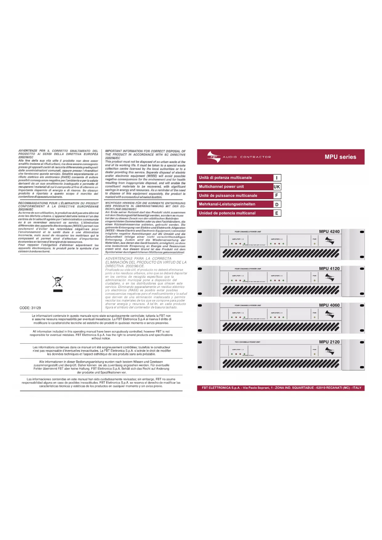 INDEX INTRODUCTION Pour optimiser le rapport entre les investissements et les prestations, les installateurs et les utilisateurs finaux demandent aujourd'hui à l'industrie des systèmes toujours plus complets et universels, en mesure de répondre, pour les fonctions et la technologie, aux exigences modernes de distribution sonore. Un système projeté en suivant ces indications doit disposer d'une puissance suffisante pour sonoriser plusieurs zones, un nombre minimum de composants, une facilité d'assemblage, une exploitation à bon marché, des prestations élevées et constantes. La FBT Elettronica S.p.A., en interprétant et prévoyant telles nécessités, a réalisé une nouvelle gamme d'amplificateurs : la série MPU qui comprend les modèles MPU 2120, MPU 4060, MPU 4120, MPU 4240. Il s'agit d'unités de puissance monobloc avec deux ou quatre extrémités, sorties avec des transformateurs de ligne à 70V et 100V qui peuvent travailler en modalité stéréo ou « somme » avec 2 configurations possibles pour chaque unité de puissance. Réponse en fréquence de 40Hz à 20kHz, filtre interne passe-haut à 40Hz, protection thermique et courts-circuits ; sur le panneau frontal, voyants lumineux de la modalité de travail et de la présence de pannes, réglages des volumes sur le panneau postérieur.