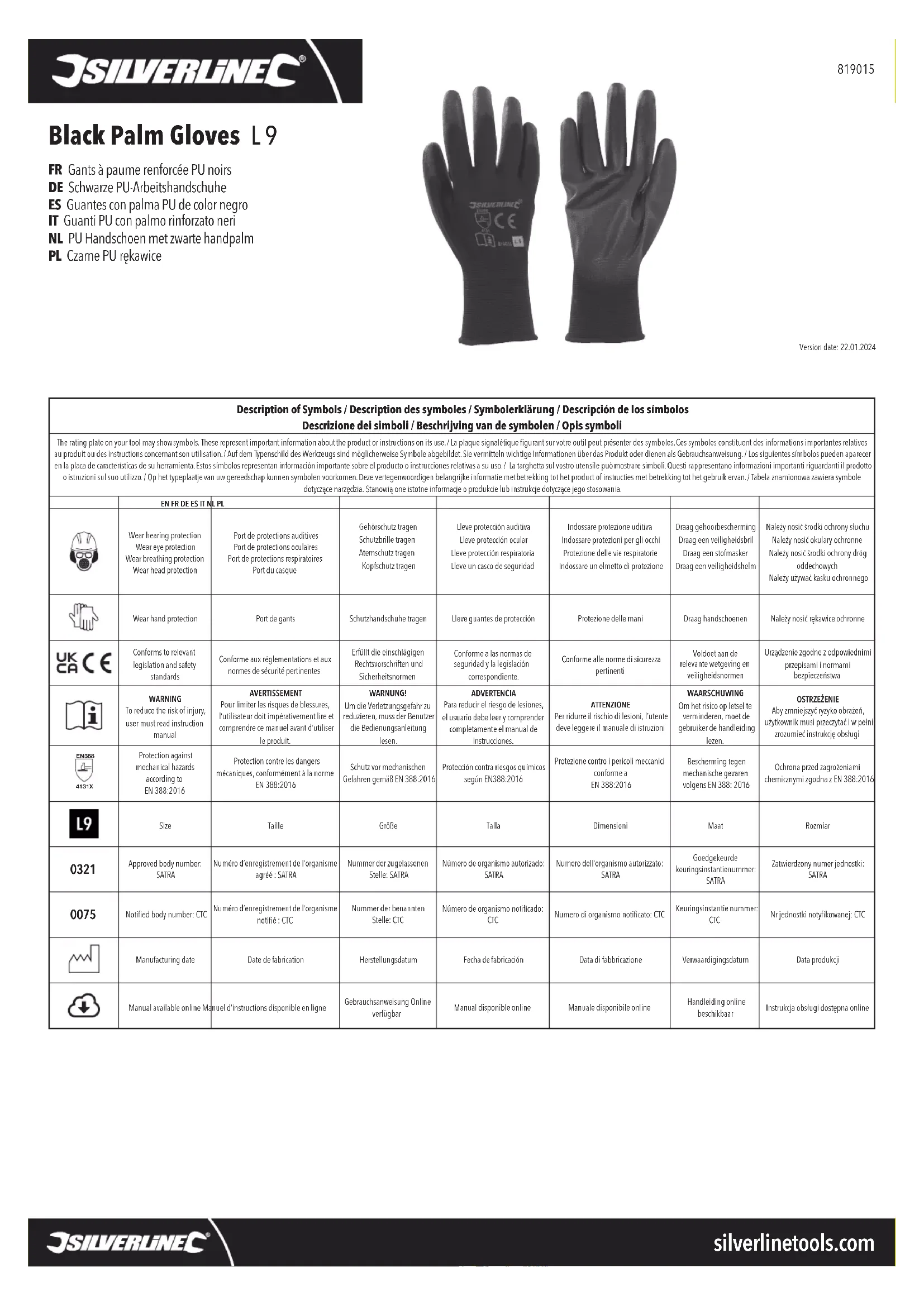 - Un rangement approprié garantit que les matériaux des gants ne seront pas affectés de manière signicative par le vieillissement. Contact Fabricant légal : Toolstream Ltd. Pour tout conseil technique ou réparation, veuillez nous contacter au (+44) 1935 382 222. Site web : www.silverlinetools.com Adresse (GB) : Toolstream Ltd., Boundary Way, Lufton Trading Estate, Yeovil, Somerset, BA22 8HZ, Royaume-Uni. Organisme agréé : SATRA Technology Centre Ltd., Wyndham Way, Telford Way, Kettering, Northamptonshire, NN16 8SD, Royaume-Uni. Numéro d’enregistrement de l’organisme agréé : 0321 Adresse (UE) : Toolstream B.V., Hogeweg 39, 5301 LJ Zaltbommel, Pays-Bas. Organisme notié : CTC, 4 Rue Herman Frenkel, 69367, Lyon Cedex 07, France. Numéro d’enregistrement de l’organisme notié : 0075 The information supplied regarding the protection refers to the working surface, i.e. the palm of the glove. The blade cut resistance referenced is indicative only. The TDM cut resistance test is the reference performance result.