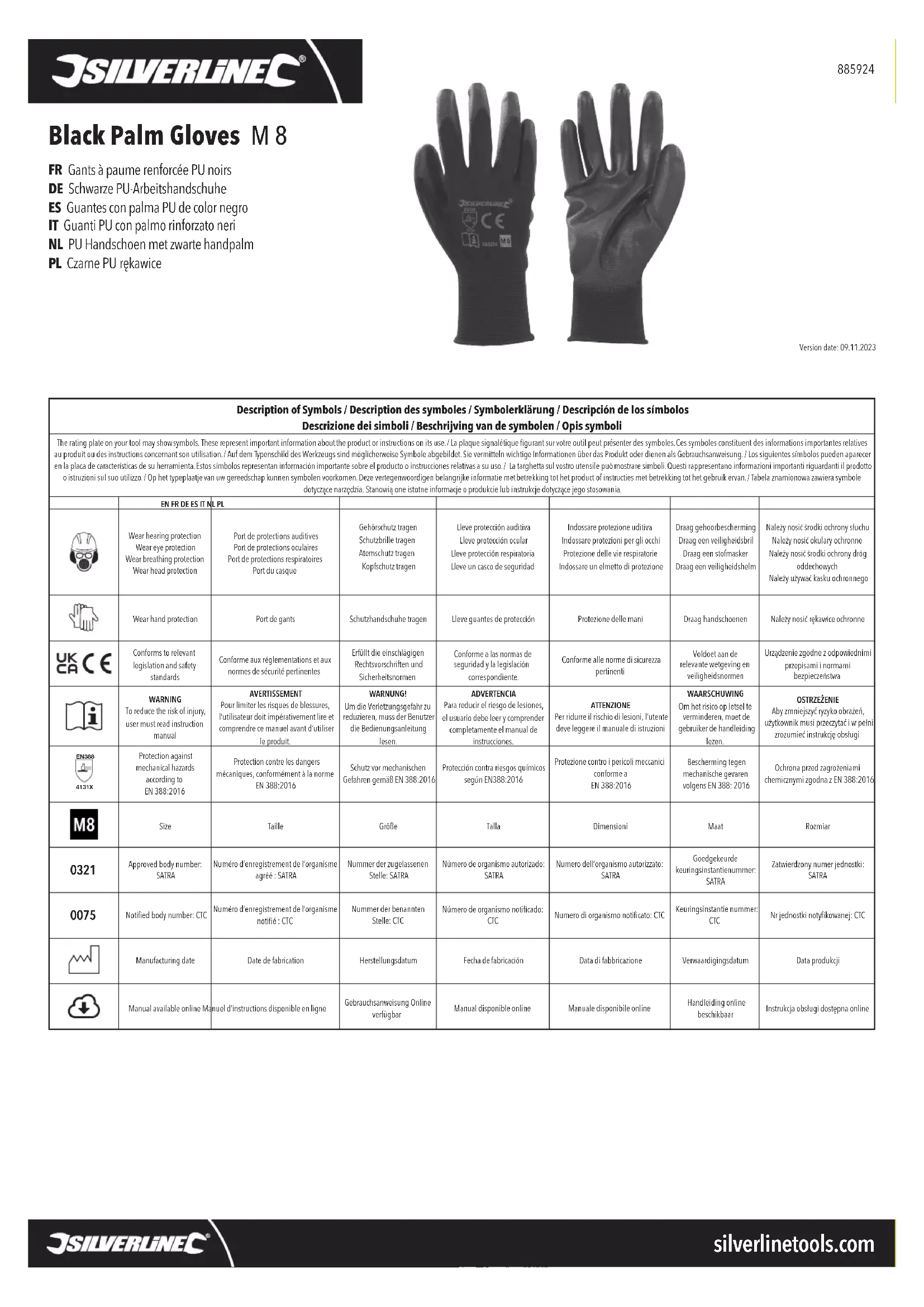 - Un rangement approprié garantit que les matériaux des gants ne seront pas affectés de manière signicative par le vieillissement. Contact Fabricant légal : Toolstream Ltd. Pour tout conseil technique ou réparation, veuillez nous contacter au (+44) 1935 382 222. Site web : www.silverlinetools.com/fr-FR/Support Adresse (GB) : Toolstream Ltd., Boundary Way, Lufton Trading Estate, Yeovil, Somerset, BA22 8HZ, Royaume-Uni. Organisme agréé : SATRA Technology Centre Ltd., Wyndham Way, Telford Way, Kettering, Northamptonshire, NN16 8SD, Royaume-Uni. Numéro d’enregistrement de l’organisme agréé : 0321 Adresse (UE) : Toolstream B.V., Holtum-Noordweg 11, Unit 4, 6121 RE Born, Pays-Bas. Organisme notié : CTC, 4 Rue Herman Frenkel, 69367, Lyon Cedex 07, France. Numéro d’enregistrement de l’organisme notié : 0075 The information supplied regarding the protection refers to the working surface, i.e. the palm of the glove. The blade cut resistance referenced is indicative only. The TDM cut resistance test is the reference performance result.