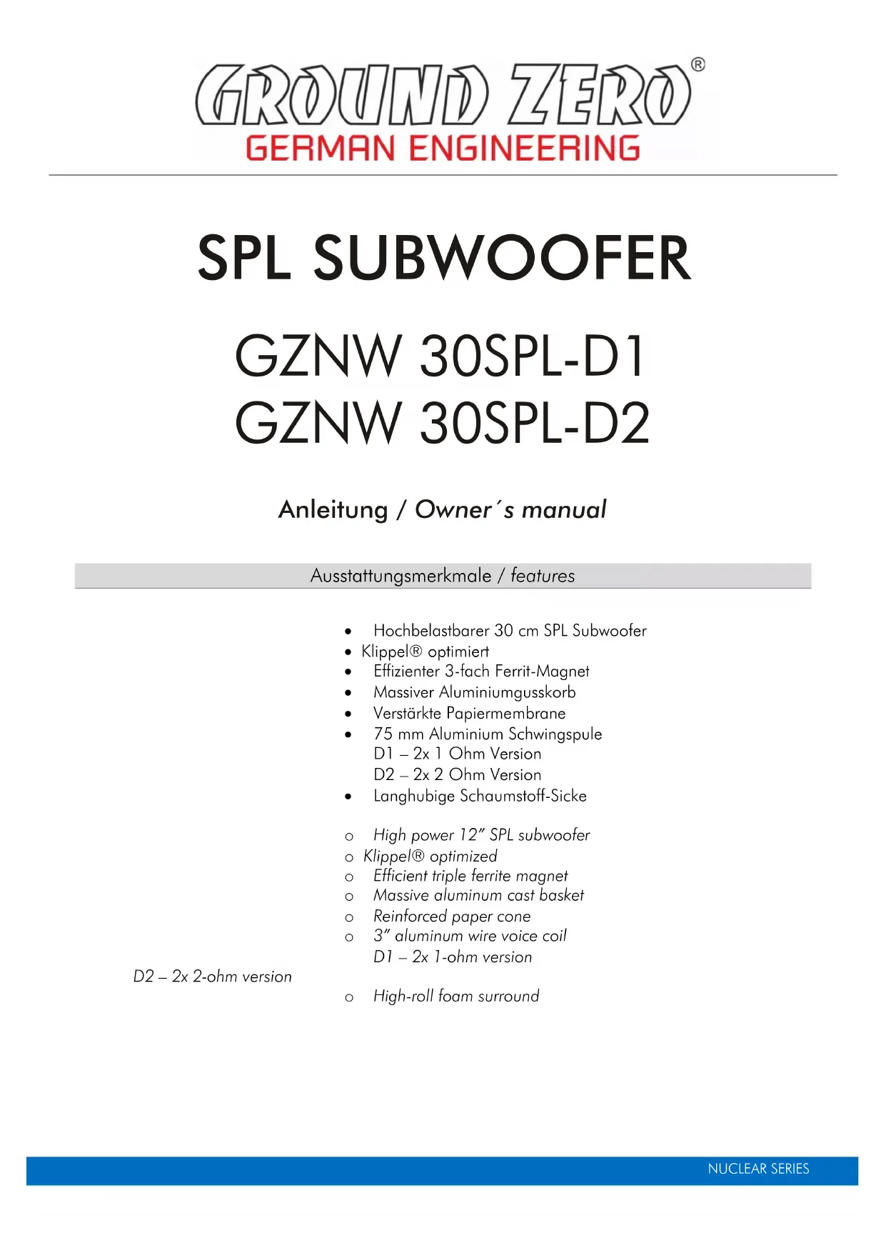 GZNW 30SPL-D1 - Caisson de basses Ground Zero - Notice d'utilisation et mode d'emploi gratuit