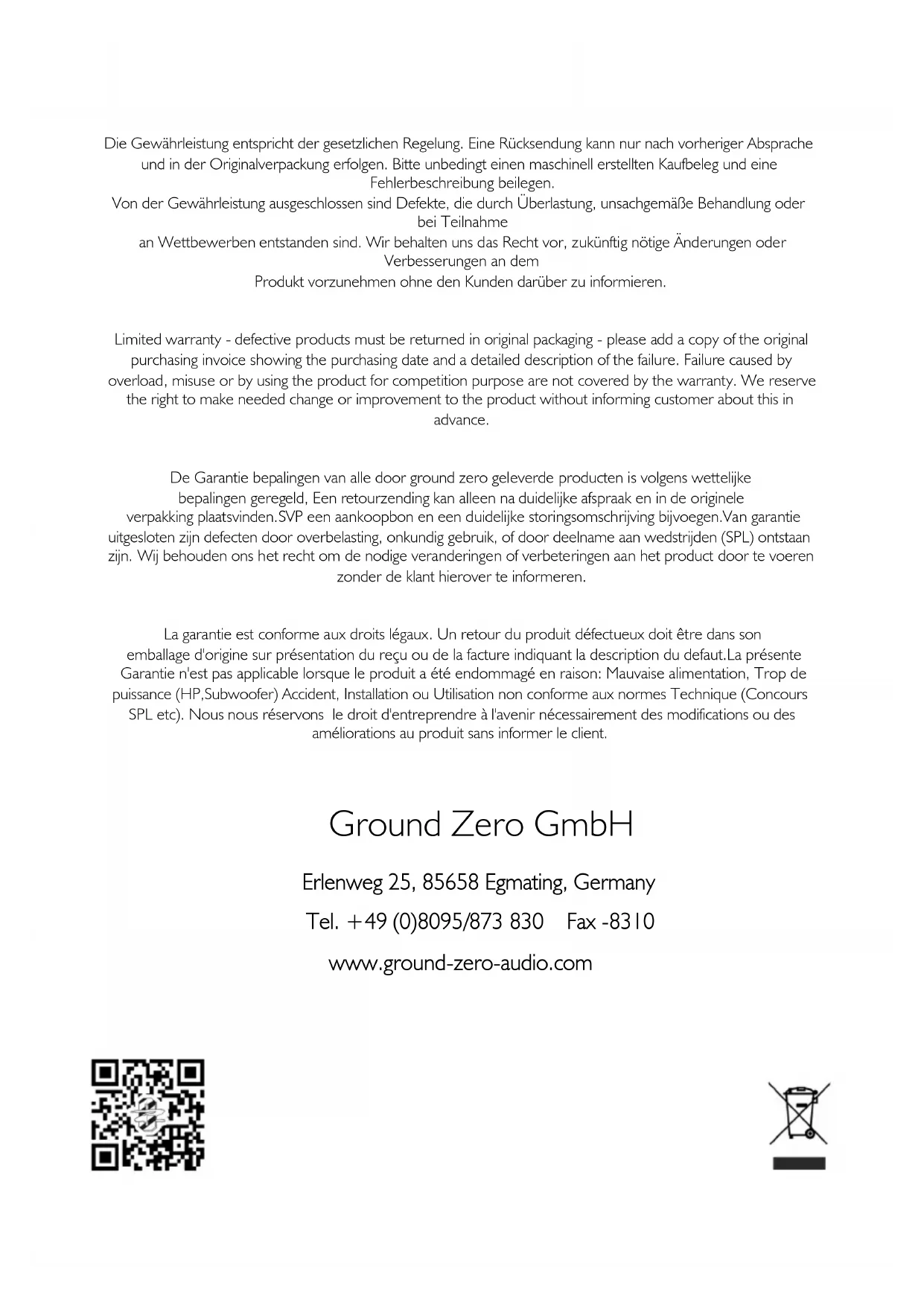 La garantie est conforme aux droits légaux. Un retour du produit défectueux doit être dans son emballage d'origine sur présentation du reçu ou de la facture indiquant la description du defaut.La présente Garantie n'est pas applicable lorsque le produit a été endommagé en raison: Mauvaise alimentation, Trop de puissance (HP,Subwoofer) Accident, Installation ou Utilisation non conforme aux normes Technique (Concours SPL etc). Nous nous réservons le droit d'entreprendre à l'avenir nécessairement des modifications ou des améliorations au produit sans informer le client.