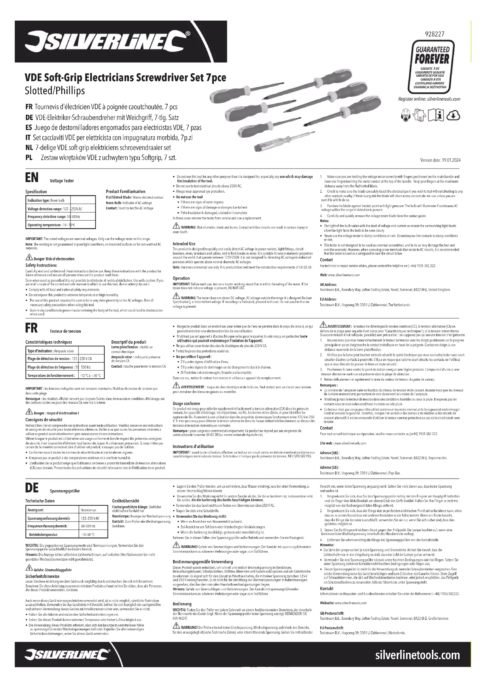 - Cetesteurn’estpasconçupourêtreutilisécommeuntournevisnormal,etlefairepourraitendommager l’outiletannulerlagarantie.Toutefois,lorsquel’onaccèdeàdesbornesàvisrelativesàdescircuitsdecourant alternatif, il est recommandé d’utiliser le testeur comme protection au cas où le circuit serait sous tension.ContactPourtoutconseiltechniqueouréparation,veuilleznouscontacterau(+44)1935382222. Site web : www.silverlinetools.com Adresse (GB) :ToolstreamLtd.,BoundaryWay,LuftonTradingEstate,Yeovil,Somerset,BA228HZ,Royaume-Uni. Adresse (UE) :ToolstreamB.V.,Hogeweg39,5301LJZaltbommel,Pays-Bas.Descriptif du produit Lame plate/fendue : établit un contactélectriqueAmpoule néon : indiquelaprésencede tension CAContact : touche pour tester la tension CAType d’indication : Ampoule néonPlage de détection de tension : 125 – 250 V CAPlage de détection de fréquence : 50-500HzTempérature de fonctionnement : -10 °C à +50 °CWICHTIG: Die angegebenen Spannungswerte sind Nennspannungen. Verwenden Sie den Spannungsprüfer ausschließlich in diesem Bereich. Hinweis: DieAnzeigeistbeischlechtenLichtverhältnissen,aufisoliertenOberächenoderbeinicht geerdeten Wechselstromnetzen nicht gewährleistet. Gefahr: StromschlaggefahrSicherheitshinweiseLesenSiedieseAnleitungvordemGebrauchsorgfältigdurchundmachenSiesichmitihrvertraut.BewahrenSiedieseAnleitungzusammenmitdemProduktaufundstellenSiesicher,dassallePersonen,diediesesProduktverwenden,sielesen.AuchwenndiesesGerätwievorgeschriebenverwendetwird,istesnichtmöglich,sämtlicheRestrisikenauszuschließen.VerwendenSiedasGerätstetsmitVorsicht.SolltenSiesichbezüglichdersachgemäßenundsicherenVerwendungdiesesGerätesnichtvollkommensichersein,verwendenSieesnicht.• HaltenSieallelokalenundnationalenSicherheitsanforderungenein.• SetzenSiediesesProduktkeinerextremenTemperaturoderhoherLuftfeuchtigkeitaus.• DieVerwendungdiesesProduktserfordert,dasssichderBenutzerinunmittelbarerNähezuspannungsführendenWechselspannungenbendet.ErgreifenSieallenotwendigenSicherheitsvorkehrungen,wennSiediesesGerätverwenden.