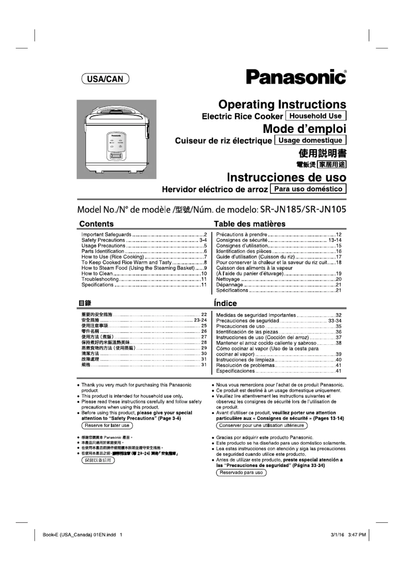 Retrouvez gratuitement la notice de l'appareil SR-JN185 PANASONIC au format PDF.