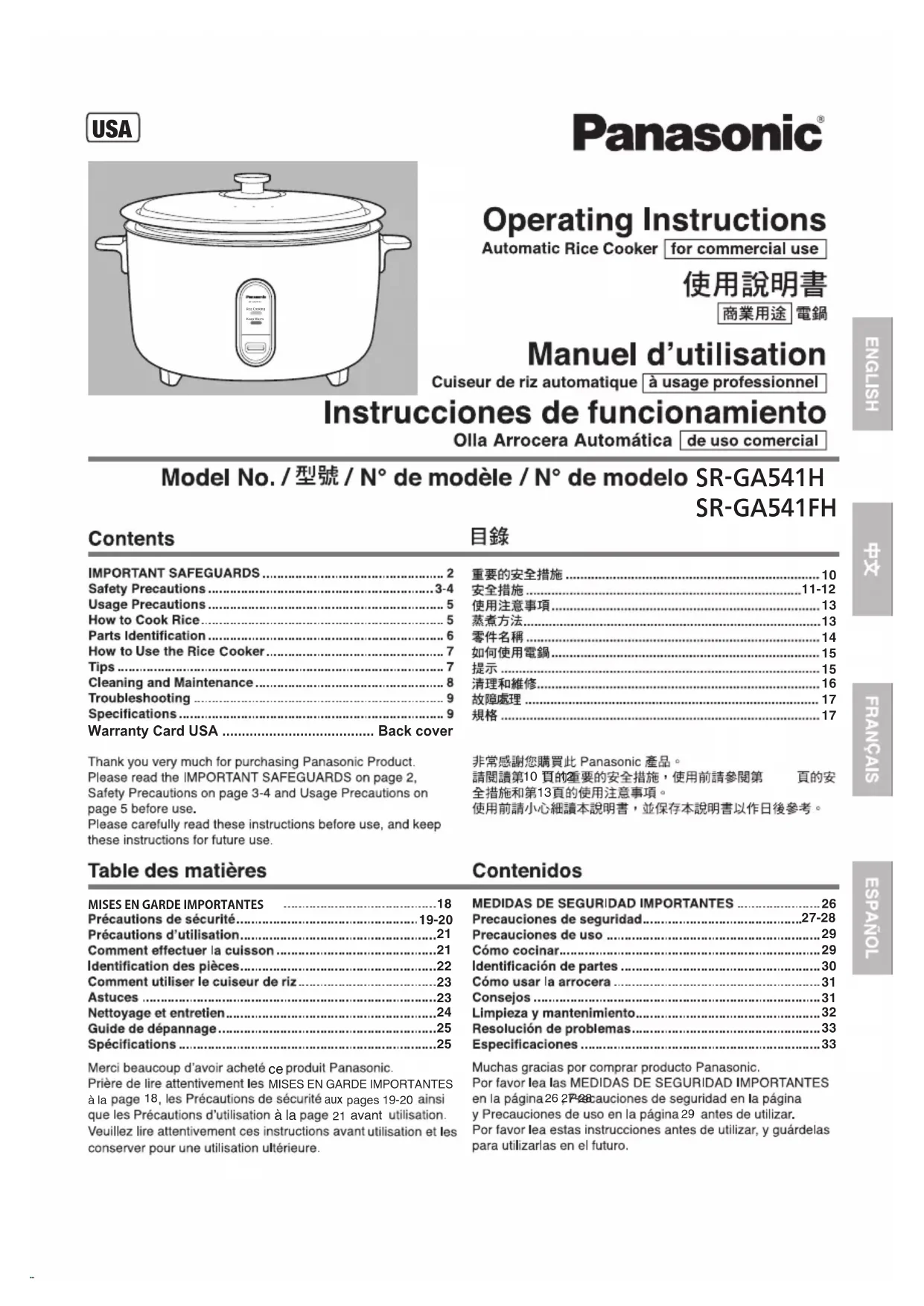 Retrouvez gratuitement la notice de l'appareil SR-GA541 PANASONIC au format PDF.