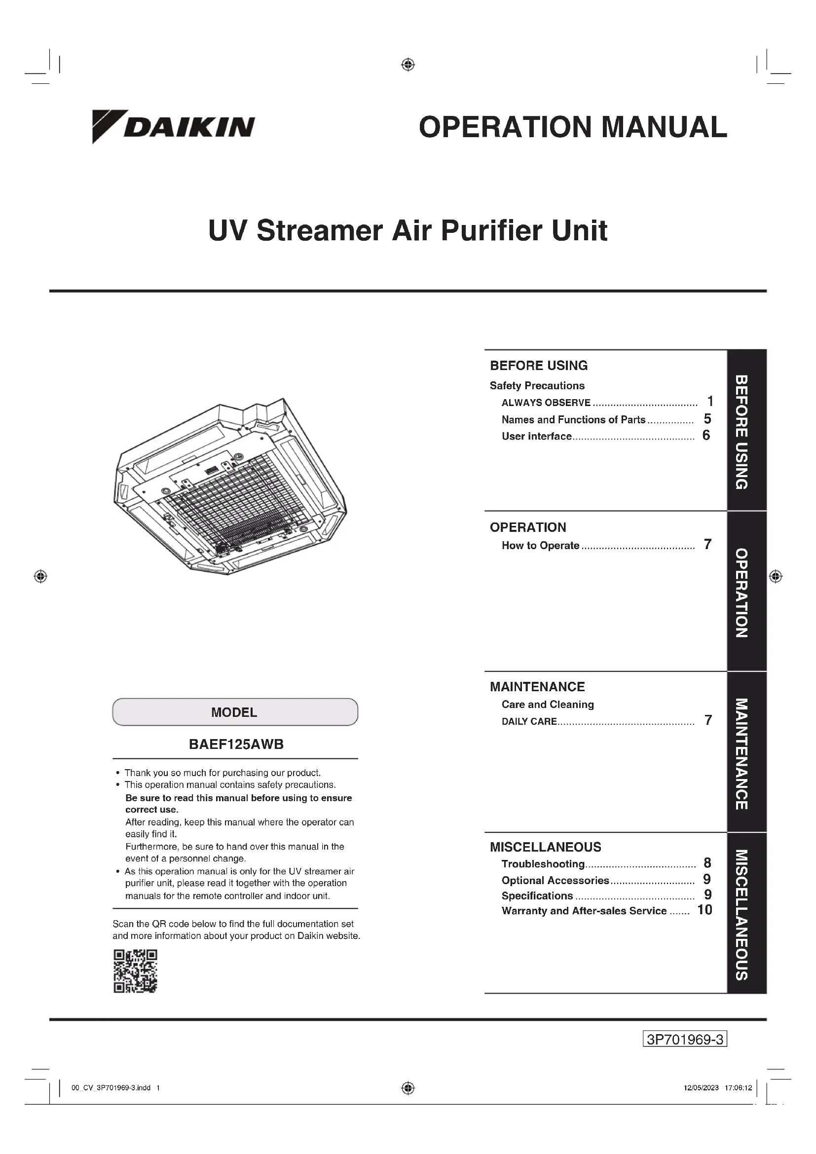 BAEF125AWB - Purificateur d'air DAIKIN - Notice d'utilisation et mode d'emploi gratuit