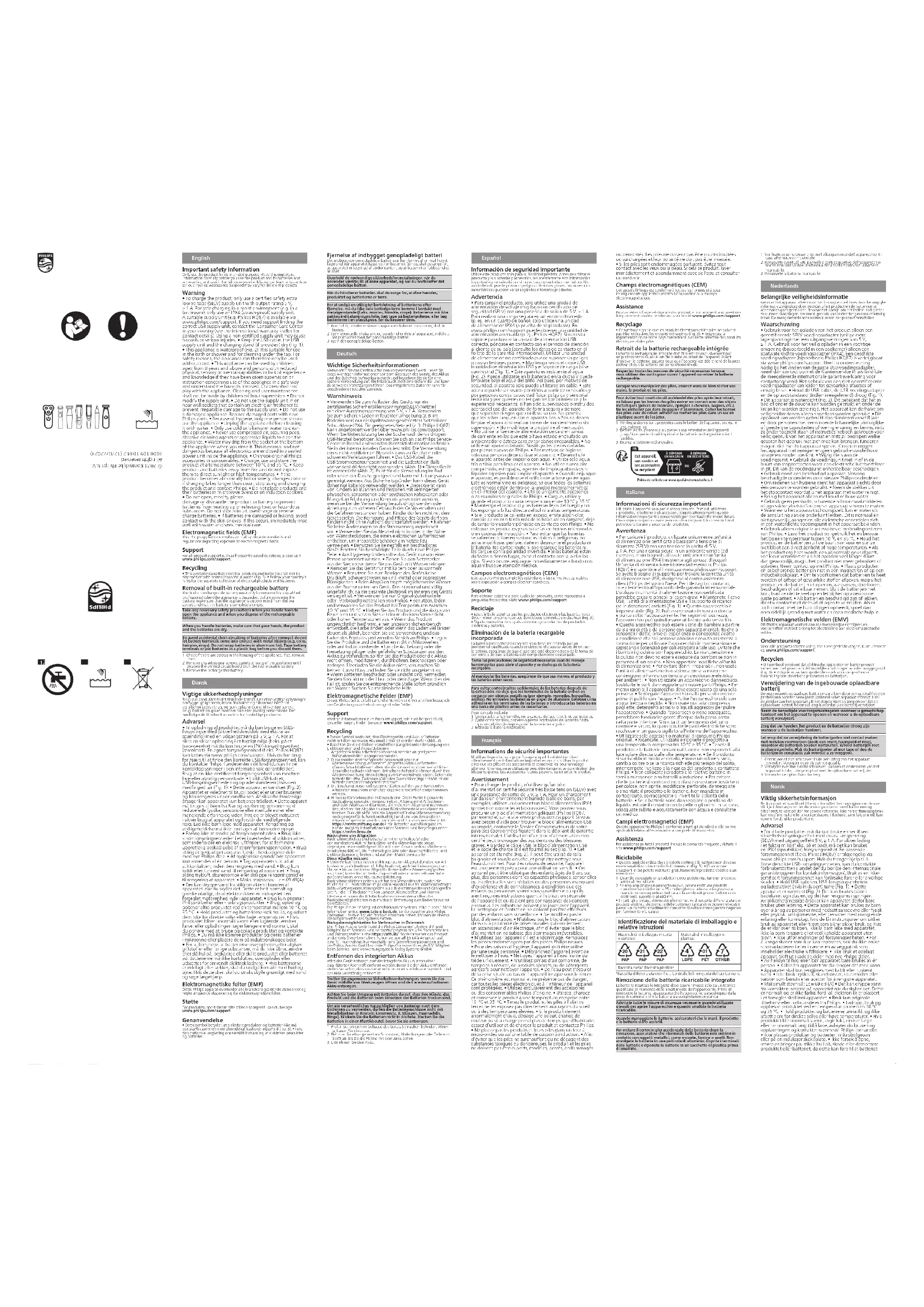 - Ce symbole signie que les produits électriques et les piles ne doivent pas être jetées avec les ordures ménagères (Fig. 3). •Respectez la réglementation de votre pays concernant la collecte sélective des produits électriques et des piles. Retrait de la batterie rechargeable intégrée La batterie rechargeable intégrée doit être retirée exclusivement par un professionnel qualié lors de la mise au rebut de l’appareil. Avant d’enlever la batterie, assurez-vous que l’appareil est débranché de la prise secteur et que la batterie est complètement vide. Respectez toutes les mesures de sécurité nécessaires lorsque vous utilisez des outils pour ouvrir l'appareil ou retirer la batterie rechargeable. Lorsque vous manipulez des piles, assurez-vous de bien sécher vos mains, le produit et les piles. Pour éviter tout court-circuit accidentel des piles après leur retrait, ne laissez pas les bornes des piles entrer en contact avec des objets métalliques (pièces de monnaie, épingles à cheveux, bagues, etc.). Ne les emballez pas dans du papier d’aluminium. Collez les bornes des piles avec du ruban adhésif ou mettez les piles dans un sac en plastique avant de les jeter. 1 Vériez si des vis sont présentes dans le boîtier de l’appareil. Si c'est le cas, enlevez-les. 2 Retirez les vis, panneaux ou pièces supplémentaires de l’appareil jusqu’à ce que le circuit imprimé et la batterie rechargeable soient visibles. 3 Retirez la batterie rechargeable. Points de collecte sur www.quefairedemesdechets.fr Cet appareil, son cordon et ses accessoires se recyclent Italiano Informazioni di sicurezza importanti Utilizzate il prodotto solo per lo scopo previsto. Prima di utilizzare il prodotto, le batterie e gli accessori, leggete attentamente queste informazioni importanti e conservatele per eventuali riferimenti futuri. L'uso improprio può causare pericoli o lesioni gravi. Gli accessori forniti potrebbero variare a seconda del prodotto. Avvertenza