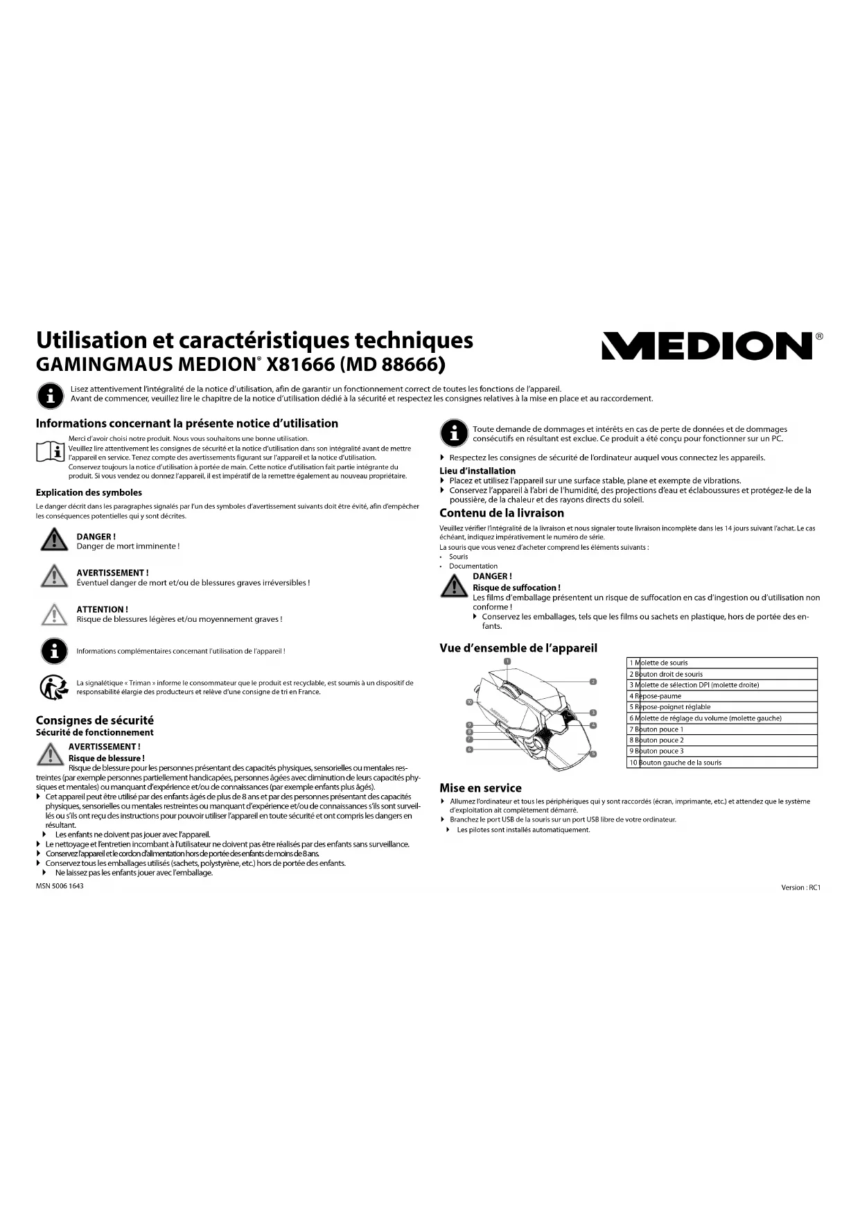 X81666 (MD 88666) Lisez attentivement l’intégralité de la notice d’utilisation, afin de garantir un fonctionnement correct de toutes les fonctions de l’appareil. Avant de commencer, veuillez lire le chapitre de la notice d’utilisation dédié à la sécurité et respectez les consignes relatives à la mise en place et au raccordement. MSN 5006 1643 Informations concernant la présente notice d’utilisation Merci d’avoir choisi notre produit. Nous vous souhaitons une bonne utilisation.Veuillez lire attentivement les consignes de sécurité et la notice d’utilisation dans son intégralité avant de mettre l’appareil en service. Tenez compte des avertissements figurant sur l’appareil et la notice d’utilisation.Conservez toujours la notice d’utilisation à portée de main. Cette notice d’utilisation fait partie intégrante du produit. Si vous vendez ou donnez l’appareil, il est impératif de la remettre également au nouveau propriétaire. Explication des symboles Le danger décrit dans les paragraphes signalés par l’un des symboles d’avertissement suivants doit être évité, afin d’empêcher les conséquences potentielles qui y sont décrites.DANGER!Danger de mort imminente !AVERTISSEMENT!Éventuel danger de mort et/ou de blessures graves irréversibles !ATTENTION!Risque de blessures légères et/ou moyennement graves !Informations complémentaires concernant l’utilisation de l’appareil !La signalétique « Triman » informe le consommateur que le produit est recyclable, est soumis à un dispositif de responsabilité élargie des producteurs et relève d‘une consigne de tri en France. Consignes de sécurité Sécurité de fonctionnement AVERTISSEMENT!Risque de blessure!Risque de blessure pour les personnes présentant des capacités physiques, sensorielles ou mentales res-treintes (par exemple personnes partiellement handicapées, personnes âgées avec diminution de leurs capacités phy-siques et mentales) ou manquant d’expérience et/ou de connaissances (par exemple enfants plus âgés). Cet appareil peut être utilisé par des enfants âgés de plus de 8 ans et par des personnes présentant des capacités physiques, sensorielles ou mentales restreintes ou manquant d’expérience et/ou de connaissances s’ils sont surveil-lés ou s’ils ont reçu des instructions pour pouvoir utiliser l’appareil en toute sécurité et ont compris les dangers en résultant. Les enfants ne doivent pas jouer avec l’appareil. Le nettoyage et l’entretien incombant à l’utilisateur ne doivent pas être réalisés par des enfants sans surveillance. Conservez l’appareil et le cordon d’alimentation hors de portée des enfants de moins de 8 ans. Conservez tous les emballages utilisés (sachets, polystyrène, etc.) hors de portée des enfants. Ne laissez pas les enfants jouer avec l’emballage.Toute demande de dommages et intérêts en cas de perte de données et de dommages consécutifs en résultant est exclue. Ce produit a été conçu pour fonctionner sur un PC. Respectez les consignes de sécurité de l’ordinateur auquel vous connectez les appareils. Lieu d’installation Placez et utilisez l’appareil sur une surface stable, plane et exempte de vibrations. Conservez l’appareil à l’abri de l’humidité, des projections d’eau et éclaboussures et protégez-le de la poussière, de la chaleur et des rayons directs du soleil. Contenu de la livraison Veuillez vérifier l’intégralité de la livraison et nous signaler toute livraison incomplète dans les 14 jours suivant l’achat. Le cas échéant, indiquez impérativement le numéro de série.La souris que vous venez d’acheter comprend les éléments suivants :• Souris • DocumentationDANGER!Risque de suffocation!Les films d’emballage présentent un risque de suffocation en cas d’ingestion ou d’utilisation non conforme ! Conservez les emballages, tels que les films ou sachets en plastique, hors de portée des en- fants.Version : RC1 Vue d’ensemble de l’appareil