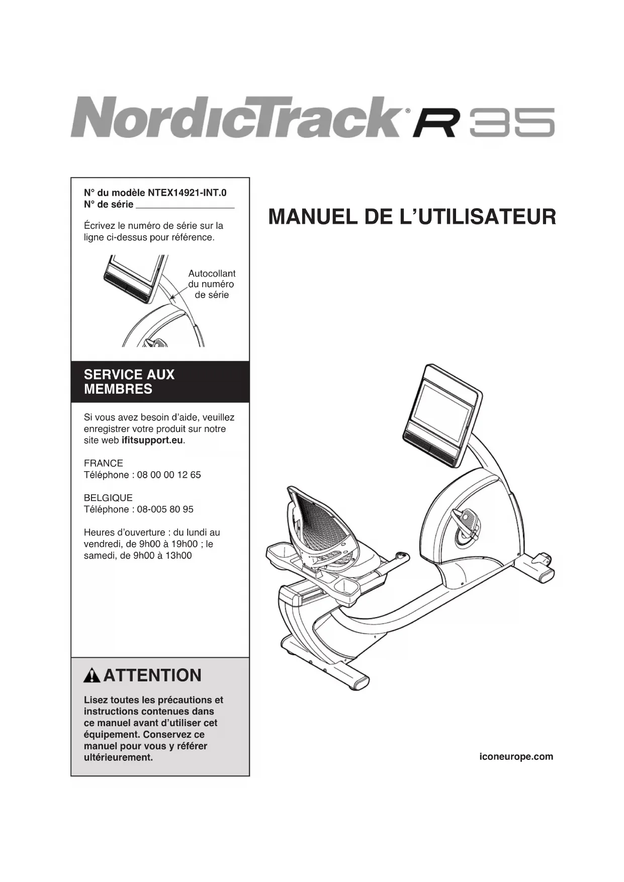 MANUEL DE L’UTILlSATEUR Autocollant du numéro de série N° du modèle NTEX14921-INT.0 N° de série Écrivez le numéro de série sur la ligne ci-dessus pour référence. ATTENTION Lisez toutes les précautions et instructions contenues dans ce manuel avant d’utiliser cet équipement. Conservez ce manuel pour vous y référer ultérieurement. iconeurope.com SERVICE AUX MEMBRES Si vous avez besoin d’aide, veuillez enregistrer votre produit sur notre site web ifitsupport.eu. FRANCE Téléphone : 08 00 00 12 65 BELGIQUE Téléphone : 08-005 80 95 Heures d’ouverture : du lundi au vendredi, de 9h00 à 19h00 ; le samedi, de 9h00 à 13h002 Les autocollants d’avertissement illustrés ici sont inclus avec ce produit. Collez les autocollants d’avertissement sur les autocollants en anglais aux endroits indiqués. Si un autocollant est manquant ou illisible, référez-vous à la page de couverture de ce manuel pour commander un nouvel autocollant gratuit. Placez le nouvel autocollant à l’endroit indiqué. Remarque : les autocollants ne sont peut-être pas illustrés à leurs tailles réelles.
