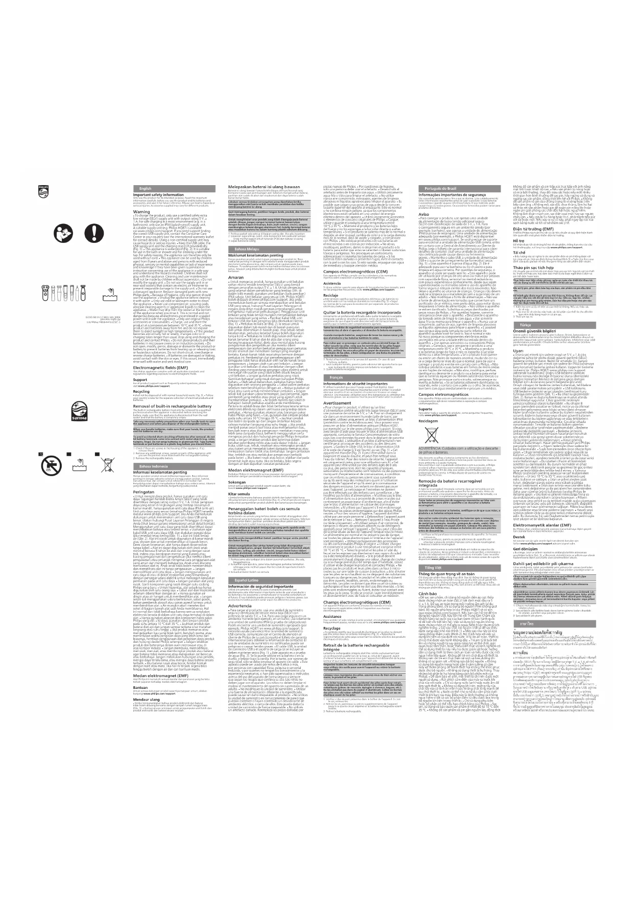 - Pour charger le produit, n’utilisez qu’un bloc d’alimentation certié sécurité très basse tension (SELV) avec une puissance de sortie de 5V, ≥ 1A. Pour un chargement sûr dans un environnement humide (salle de bains, par exemple), utilisez uniquement un bloc d’alimentationIPX4 (protection contre les éclaboussures). Vous pouvez vous procurer un bloc d’alimentation adéquat (Philips HQ87, par exemple) sur le site www.philips.com/support. Si vous avez besoin d’aide pour trouver le bloc d’alimentation USB approprié, contactez le Service Consommateurs de votre pays (ses coordonnées gurent dans le dépliant de garantie internationale). L’utilisation d’un bloc d’alimentation non certié peut provoquer des accidents ou des blessures graves. •Gardez le câbleUSB, le bloc d’alimentationUSB et le socle de charge (s’il est fourni) au sec (Fig. 1). •Cet appareil est étanche (Fig. 2). Il peut être utilisé dans la baignoire et sous la douche, et peut être nettoyé sous l'eau du robinet. Pour des raisons de sécurité, l'appareil est uniquement prévu pour une utilisation sans l. •Cet appareil peut être utilisé par des enfants âgés de 8ans ou plus, des personnes dont les capacités physiques, sensorielles ou intellectuelles sont réduites ou des personnes manquant d'expérience et de connaissances, à condition que ces enfants ou personnes soient sous surveillance ou qu'ils aient reçu des instructions quant à l'utilisation sécurisée de l'appareil et qu'ils aient pris connaissance des dangers encourus. Les enfants ne doivent pas jouer avec l'appareil. Le nettoyage et l'entretien ne doivent pas être eectués par des enfants sans surveillance. •Ne modiez pas le bloc d’alimentation. •N’utilisez pas le bloc d’alimentation dans ou à proximité de prises murales qui contiennent un assainisseur d’air électrique, an d’éviter que le bloc d’alimentation ne subisse des dommages irréversibles. •N’utilisez pas l’appareil s’il est endommagé. Remplacez les pièces endommagées par des pièces Philips neuves. •Pour des raisons d’hygiène, l’appareil doit être utilisé par une seule personne. •Débranchez l’appareil avant de le nettoyer à l’eau. •Nettoyez l’appareil à l’eau froide ou tiède uniquement. •N'utilisez jamais d'air comprimé, de tampons à récurer, de produits abrasifs ou de détergents agressifs pour nettoyer l'appareil. •De l’eau peut s'écouler de la prise située au bas de l'appareil lorsque vous le rincez. Ce phénomène est normal et ne présente pas de danger, car toutes les pièces électroniques à l’intérieur de l’appareil sont protégées. •Utilisez exclusivement des accessoires ou des consommables Philipsd’origine. •Utilisez, chargez et conservez le produit à une température comprise entre 10°C et 35°C. •Tenez le produit et les piles à l’abri du feu et ne les exposez pas directement aux rayons du soleil ou à des températures élevées. •Si le produit devient anormalement chaud, dégage une odeur, change de couleur ou si la charge prend plus de temps que d’habitude, cessez d’utiliser et de charger le produit et contactez Philips. •Ne placez pas les produits et leurs piles dans un four à micro- ondes ou sur une table de cuisson à induction. •An d’éviter que les piles ne surchauent ou ne dégagent des substances toxiques ou dangereuses, le produit et les piles ne doivent pas être ouverts, modiés, percés, endommagés ou démontés. Les piles ne doivent pas être court-circuitées ou surchargées et leur polarité ne doit pas être inversée. •Si les piles sont endommagées ou fuient, évitez tout contact avec les yeux ou la peau. Si cela se produit, laver immédiatement et abondamment avec de l'eau et consulter un médecin. Champs électromagnétiques (CEM) Cet appareil Philips est conforme à toutes les normes et à tous les règlements applicables relatifs à l'exposition aux champs électromagnétiques. Assistance Pour accéder à l’aide relative à votre produit, et notamment aux questions fréquemment posées, rendez-vous sur le site www.philips.com/support. Recyclage