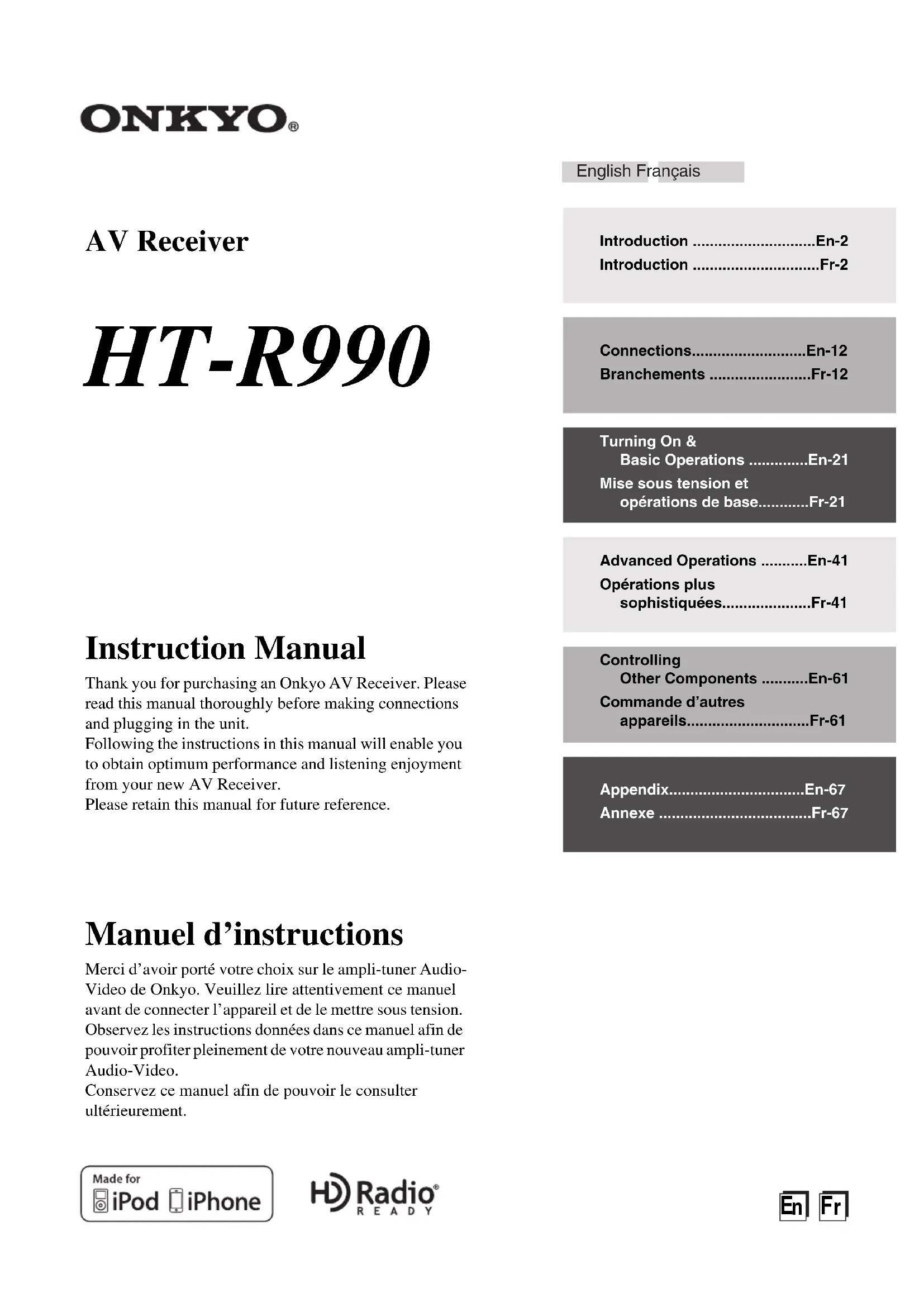 Précautions 1. Enregistrement et droits d’auteur—Outre pour l’utilisation privée, tout enregistrement d’œuvres protégées par des droits d’auteur est interdit sans l’accord préalable du détenteur de ces droits.2. Fusible—Le fusible à l’intérieur du appareil ne peut pas être remplacé par l’utilisateur. Si vous n’arrivez pas à mettre l’appareil sous tension, adressez-vous à votre revendeur Onkyo. 3. Entretien—Essuyez régulièrement le boîtier de l’appareil avec un chiffon doux et sec. Vous pouvez éliminer les taches rebelles avec un chiffon légèrement imbibé d’eau et de détergent doux. Essuyez ensuite l’appareil avec un chiffon propre et sec. N’utilisez jamais de chiffons rêches, de dissolvant, d’alcool ou d’autres solvants chimiques car ceux-ci pourraient endommager la finition ou faire disparaître la sérigraphie du boîtier.4. Alimentation AVERTISSEMENT LISEZ LES CONSIGNES SUIVANTES AVANT DE BRANCHER L’APPAREIL AU SECTEUR POUR LA PREMIÈRE FOIS.La tension du secteur change selon le pays. Vérifiez que la tension du secteur dans votre région correspond aux caractéristiques électriques figurant en face arrière de l’appareil (CA 230 V, 50 Hz ou CA 120 V, 60 Hz, par exemple).Pour débrancher l’unité du secteur, veuillez déconnecter le cordon d’alimentation. Songez à faire le nécessaire pour que la fiche du cordon soit accessible à tout moment.Presser le bouton [ON/STANDBY] pour sélectionner le mode veille ne permet de se déconnecter du secteur. Si vous n’avez pas l’intention d’utiliser l’appareil pendant une période prolongée, débranchez le cordon d’alimentation de la prise murale.5. Prévention de la perte d’acuité auditive Prudence Une pression sonore excessive provenant d’oreillettes ou d’un casque peut entraîner une perte d’acuité auditive.6. Piles et exposition à la chaleur Avertissement Evitez d’exposer les piles (dans leur emballage ou installées dans un appareil) à une chaleur excessive (en plein soleil, près d’un feu etc.).7. Ne touchez jamais cet appareil avec des mains mouillées—Ne manipulez jamais cet appareil ou son cordon d’alimentation avec des mains mouillées ou humides. Si de l’eau ou tout autre liquide pénètre à l’intérieur de l’appareil, faites-le vérifier par votre revendeur Onkyo.8. Remarques concernant la manipulation • Si vous devez transporter cet appareil, servez-vous de l’emballage d’origine pour l’emballer comme il l’était lors de son acquisition.• Ne posez pas d’objets en caoutchouc ou en plastique à demeure sur cet appareil car ils risquent de laisser des marques sur le boîtier.• Les panneaux supérieur et latéraux de l’appareil peuvent devenir chauds après un usage prolongé. C’est parfaitement normal.• Si vous n’utilisez pas l’appareil durant une période assez longue, il risque de ne pas fonctionner convenablement à la prochaine mise sous tension; veillez donc à l’utiliser de temps en temps. Modèle pour les Canadien REMARQUE : CET APPAREIL NUMÉRIQUE DE LA CLASSE B EST CONFORME À LA NORME NMB-003 DU CANADA.Sur les modèles dont la fiche est polarisée :ATTENTION : POUR ÉVITER LES CHOCS ÉLECTRIQUES, INTRODUIRE LA LAME LA PLUS LARGE DE LA FICHE DANS LA BORNE CORRESPONDANTE DE LA PRISE ET POUSSER JUSQU’AU FOND. Modèles pour l’Europe Déclaration de Conformité Nous,ONKYO EUROPE ELECTRONICS GmbH LIEGNITZERSTRASSE 6, 82194 GROEBENZELL ALLEMAGNEGROEBENZELL, ALLEMAGNEONKYO EUROPE ELECTRONICS GmbHgarantissons que le produit ONKYO décrit dans ce manuel est conforme aux normes techniques: EN60065, EN55013, EN55020 et EN61000-3-2, -3-3.K. MIYAGI4
